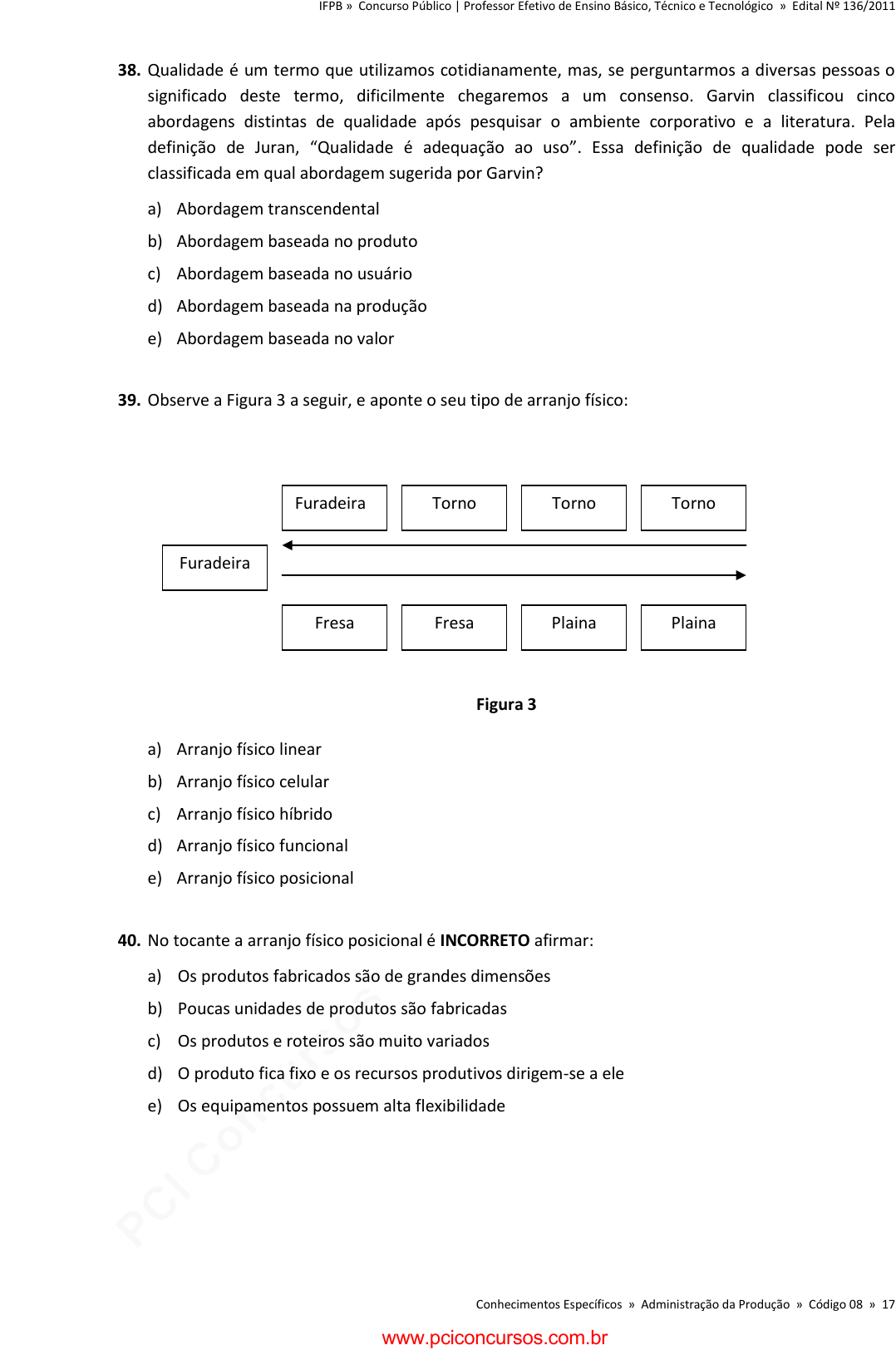 <p>pcimarkpci MDAwMDowMDAwOjAwMDA6MDAwMDowMDAwOmZmZmY6YjExNTo4ZjQ3:U3VuLCAyMCBPY3QgMjAyNCAyMzo0NzoxNCAtMDMwMA==</p><p>www.pciconcursos.com.br</p><p>IFPB » Concurso Público | Professor Efetivo de Ensino Básico, Técnico e Tecnológico » Edital Nº 136/2011</p><p>Conhecimentos Específicos » Administração da Produção » Código 08 » 17</p><p>38. Qualidade é um termo que utilizamos cotidianamente, mas, se perguntarmos a diversas pessoas o</p><p>significado deste termo, dificilmente chegaremos a um consenso. Garvin classificou cinco</p><p>abordagens distintas de qualidade após pesquisar o ambiente corporativo e a literatura. Pela</p><p>definição de Juran, “Qualidade é adequação ao uso”. Essa definição de qualidade pode ser</p><p>classificada em qual abordagem sugerida por Garvin?</p><p>a) Abordagem transcendental</p><p>b) Abordagem baseada no produto</p><p>c) Abordagem baseada no usuário</p><p>d) Abordagem baseada na produção</p><p>e) Abordagem baseada no valor</p><p>39. Observe a Figura 3 a seguir, e aponte o seu tipo de arranjo físico:</p><p>Figura 3</p><p>a) Arranjo físico linear</p><p>b) Arranjo físico celular</p><p>c) Arranjo físico híbrido</p><p>d) Arranjo físico funcional</p><p>e) Arranjo físico posicional</p><p>40. No tocante a arranjo físico posicional é INCORRETO afirmar:</p><p>a) Os produtos fabricados são de grandes dimensões</p><p>b) Poucas unidades de produtos são fabricadas</p><p>c) Os produtos e roteiros são muito variados</p><p>d) O produto fica fixo e os recursos produtivos dirigem-se a ele</p><p>e) Os equipamentos possuem alta flexibilidade</p><p>Furadeira Torno Torno Torno</p><p>Fresa Fresa Plaina Plaina</p><p>Furadeira</p><p>www.pciconcursos.com.br</p>