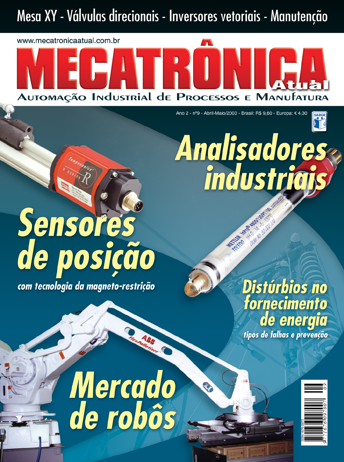 <p>Problemas e soluções 7</p><p>Protetores de linha</p><p>30</p><p>Mercado de robôs</p><p>10</p><p>15</p><p>Válvulas direcionais</p><p>Mesa XY</p><p>9</p><p>Controle inteligente:</p><p>37</p><p>Imprecisão nas medidas</p><p>Sensores de posição</p><p>Comunicação serial</p><p>na indústria usando o protocolo RS-232</p><p>39</p><p>ÍNDICE</p><p>Nº 9 - ABRIL - MAIO/2003</p><p>Inversores vetoriais:</p><p>33</p><p>Este artigo mostra algumas tendências</p><p>do mercado de robôs no Brasil.</p><p>Conheça os elementos aplicados no con-</p><p>trole do sentido de movimento, força e velo-</p><p>cidade dos atuadores pneumáticos.</p><p>A tecnologia de sensor linear: a da magneto-</p><p>restrição permite a construção de um sensor</p><p>totalmente sem contato entre o cursor e ele-</p><p>mento sensor, entre inúmeras outras vantagens.</p><p>Entenda os conceitos de tomada de me-</p><p>dição, grandeza e precisão da medida, mos-</p><p>tra como é feita a classificação dos “erros”</p><p>e apresenta os principais tipos de desvio.</p><p>Veja o que pode estar presente, como</p><p>perturbação, nas linhas de transmissão de</p><p>energia ou de dados, e a maneira de fazer a</p><p>melhor proteção.</p><p>Saiba o que acontece com o motor elé-</p><p>trico no ambiente do controlador e também</p><p>o significado dos eixos Q e D aplicados no</p><p>processo de controle vetorial.</p><p>O protocolo RS-232 é uma das formas</p><p>mais usadas para enviar dados de uma</p><p>máquina a um computador, e vice-versa.</p><p>Notícias 3</p><p>será o fim dos cartões de entrada e saída?</p><p>20</p><p>A mesa XY é uma associação de vários</p><p>componentes elétricos e mecânicos de alta</p><p>responsabilidade, precisão e confiabilidade.</p><p>Esse artigo trata destes componentes.</p><p>26</p><p>Manutenção preditiva e pró-ativa</p><p>O que as vantagens das manutenções</p><p>preditiva e pró-ativa trazem para os proces-</p><p>sos produtivos.</p><p>44</p><p>Entenda como a distribuição do controle</p><p>inteligente dá mais autonomia aos disposi-</p><p>tivos de campo e muda a configuração bá-</p><p>sica dos processos de automação.</p><p>caminha para o "gargalo"</p><p>com tecnologia da magneto-restrição</p><p>explorando os fundamentos</p><p>Analisadores industriais</p><p>Aqui são apresentados os elementos que</p><p>englobam a análise industrial e também os</p><p>principais conceitos da instrumentação ana-</p><p>lítica</p><p>13</p><p>Tolerância geométrica - 2ª parte</p><p>52</p><p>Vistas ortogonais e foto-realismo</p><p>58</p><p>Crie vistas ortogonais com base em de-</p><p>senhos tridimensionais e utilize os recur-</p><p>sos de renderização, aplicação de materi-</p><p>ais e iluminação no AutoCAD.</p><p>Conheça os modos de representação do</p><p>quadro de tolerância, elementos de referên-</p><p>cia e principalmente o conceito de campo</p><p>de tolerância.</p><p>Distúrbios no fornecimento de energia</p><p>Veja os principais tipos e como preveni-los.</p><p>46</p><p>AUTOMAÇÃO</p><p>3MECATRÔNICA ATUAL Nº 9 - ABRIL/2003</p><p>NOTÍCIASNOTÍCIASNOTÍCIASNOTÍCIASNOTÍCIASNOTÍCIASNOTÍCIASNOTÍCIASNOTÍCIASNOTÍCIAS</p><p>MECAMECAMECAMECAMECATRÔNICATRÔNICATRÔNICATRÔNICATRÔNICA</p><p>NOTÍCIASNOTÍCIASNOTÍCIASNOTÍCIASNOTÍCIAS</p><p>Foundation Fieldbus vira guia de bolso</p><p>s sete níveis do “Foundation Fieldbus” e toda a</p><p>sua literatura didática são descritos por Ian</p><p>Verhappen e Augusto Pereira no livro que leva o mes-</p><p>mo nome. Em formato de Guia de Bolso, o “Foundation</p><p>Fieldbus” traz os níveis do protocolo, cabeamento, fon-</p><p>tes de alimentação, documentação, integração do sis-</p><p>tema, comissionamento, além da localização e repa-</p><p>ro de defeitos.</p><p>Uma série de gráficos e significados de siglas fo-</p><p>ram incorporados ao trabalho para que o leitor se si-</p><p>tue dentro da arquitetura de automação industrial. A</p><p>proposta do livro é tornar-se uma fonte de referência</p><p>para técnicos e engenheiros à me-</p><p>dida que essa tecnologia vai sen-</p><p>do explorada. Os autores enfatizam</p><p>que o guia de bolso “Foundation</p><p>Fieldbus” não pretende ser um ma-</p><p>nual completo sobre tudo o que há</p><p>para aprender sobre essa</p><p>tecnologia. Ian e Augusto acredi-</p><p>tam que o “Foundation Fieldbus” é</p><p>uma tecnologia em constante evo-</p><p>lução, motivo pelo qual seria impos-</p><p>sível reunir todas as informações</p><p>em um único trabalho.</p><p>Entre um capítulo e outro, os autores dão dicas</p><p>sobre como sanar dúvidas na aplicação do</p><p>“Foundation Fieldbus” ou obter a melhor performance</p><p>desta tecnologia. Na última parte do trabalho, os au-</p><p>tores apresentam toda a “sopa de letrinhas” que en-</p><p>volvem a automação e que são citadas no decorrer</p><p>dos textos.</p><p>Augusto Pereira trabalhou na implantação do pri-</p><p>meiro projeto de “Foundation Fieldbus” no mundo (fá-</p><p>brica da Deten, em Camaçari – Bahia) em 1994. Há</p><p>dois anos, durante uma reunião da ISA – entidade in-</p><p>ternacional de engenheiros e instrumentistas - ficou</p><p>sabendo que o canadense Ian</p><p>Verhappen gostaria de escrever uma</p><p>literatura explicativa sobre</p><p>“Fieldbus”. Augusto, que já detinha</p><p>know-how e material técnico sobre</p><p>a tecnologia, aceitou de imediato.</p><p>Até o final de 2003, os dois au-</p><p>tores lançarão o segundo livro refe-</p><p>rente ao assunto. Trata-se de uma</p><p>aplicação prática de “Foundation</p><p>Fieldbus” na Fyncrude Oil & Gas,</p><p>empresa onde trabalha Ian</p><p>Verhappen.</p><p>O</p><p>Novos softwares para</p><p>aquisição de dados</p><p>Fluke acaba de acrescentar dois pacotes de</p><p>software à sua linha de produtos para aquisi-</p><p>ção de dados no ambiente industrial. Desenvolvido</p><p>pela Indusoft, o Fluke DAQ é indicado para 