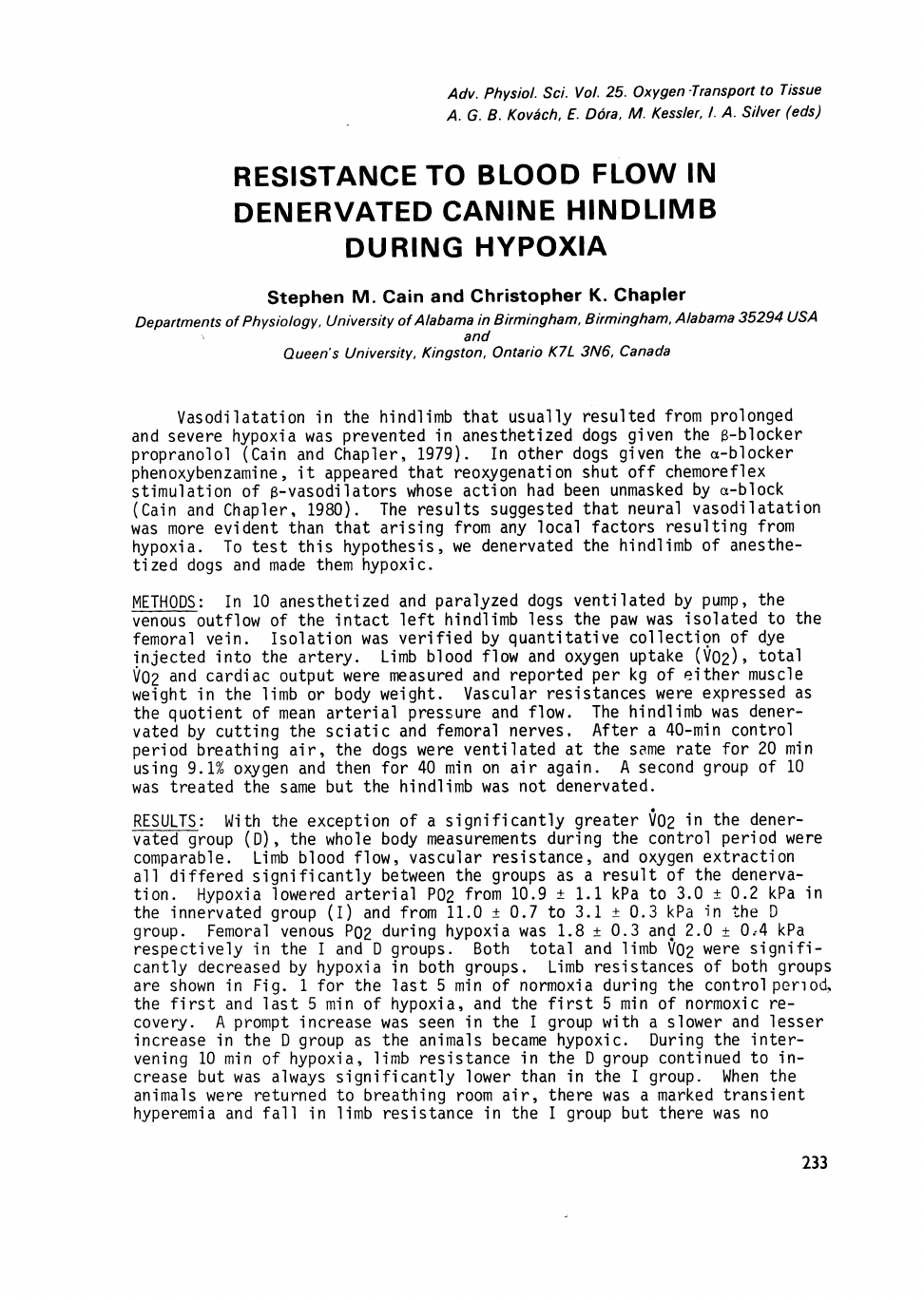 <p>Adv. Physiol. Sci. Vol. 25. Oxygen Transport to Tissue</p><p>A. G. B. Kovach, E. Dora, M. Kessler, I. A. Silver (eds)</p><p>Vasodilatation in the hindlimb that usually resulted from prolonged</p><p>and severe hypoxia was prevented in anesthetized dogs given the ^-blocker</p><p>propranolol (Cain and Chapler, 1979). In other dogs given the a-blocker</p><p>phenoxybenzamine, it appeared that reoxygenation shut off chemoreflex</p><p>stimulation of 3-vasodilators whose action had been unmasked by a-block</p><p>(Cain and Chapler, 1980). The results suggested that neural vasodilatation</p><p>was more evident than that arising from any local factors resulting from</p><p>hypoxia. To test this hypothesis, we denervated the hindlimb of anesthe-</p><p>tized dogs and made them hypoxic.</p><p>METHODS: In 10 anesthetized and paralyzed dogs ventilated by pump, the</p><p>venous outflow of the intact left hindlimb less the paw was isolated to the</p><p>femoral vein. Isolation was verified by quantitative collection of dye</p><p>injected into the artery. Limb blood flow and oxygen uptake (V02)> total</p><p>V02 and cardiac output were measured and reported per kg of either muscle</p><p>weight in the limb or body weight. Vascular resistances were expressed as</p><p>the quotient of mean arterial pressure and flow. The hindlimb was dener-</p><p>vated by cutting the sciatic and femoral nerves. After a 40-min control</p><p>period breathing air, the dogs were ventilated at the same rate for 20 min</p><p>using 9.1% oxygen and then for 40 min on air again. A second group of 10</p><p>was treated the same but the hindlimb was not denervated.</p><p>RESULTS: With the exception of a significantly greater V02 in the dener-</p><p>vated group ( D ) , the whole body measurements during the control period were</p><p>comparable. Limb blood flow, vascular resistance, and oxygen extraction</p><p>all differed significantly between the groups as a result of the denerva-</p><p>tion. Hypoxia lowered arterial P02 from 10.9 ± 1 . 1 kPa to 3.0 ± 0.2 kPa in</p><p>the innervated group (I) and from 11.0 ± 0.7 to 3.1 ± 0.3 kPa in the D</p><p>group. Femoral venous P02 during hypoxia was 1.8 ± 0.3 and 2.0 ± 0.-4 kPa</p><p>respectively in the I and D groups. Both total and limb V02 were signifi-</p><p>cantly decreased by hypoxia in both groups. Limb resistances of both groups</p><p>are shown in Fig. 1 for the last 5 min of normoxia during the control period,</p><p>the first and last 5 min of hypoxia, and the first 5 min of normoxic re-</p><p>covery. A prompt increase was seen in the I group with a slower and lesser</p><p>increase in the D group as the animals became hypoxic. During the inter-</p><p>vening 10 min of hypoxia, limb resistance in the D group continued to in-</p><p>crease but was always significantly lower than in the I group. When the</p><p>animals were returned to breathing room air, there was a marked transient</p><p>hyperemia and fall in limb resistance in the I group but there was no</p><p>233</p><p>RESISTANCE TO BLOOD FLOW IN</p><p>DENERVATED CANINE HIND LI MB</p><p>DURING HYPOXIA</p><p>S t e p h e n M . Ca in a n d C h r i s t o p h e r K. Chapter</p><p>Departments of Physiology, University of Alabama in Birmingham, Birmingham, Alabama 35294 USA</p><p>and</p><p>Queen's University, Kingston, Ontario K7L 3N6, Canada</p><p>significant change during the first minutes of recovery in the D group.</p><p>Fig. 1: Changes in limb vascular resistance with onset and relief of</p><p>hypoxia.</p><p>DISCUSSION: The significant difference in total V02 between the two groups</p><p>during the control period may have been attributable to the central stim-</p><p>ulation caused by denervating the limb. The increased flow, and decreased</p><p>02 extraction ratio and resistance in the limbs of the denervated group</p><p>reflected the loss of vasoconstrictor tone which is normally present. With</p><p>the onset of hypoxia, vasoconstrictor tone was increased in the limbs of</p><p>the I group by chemoreflex activity. In the D group, flow changed propor-</p><p>tionately to arterial pressure at first but the resistance began to* in-</p><p>crease significantly by the 4th and 5th minutes of hypoxia. This may have</p><p>been the autoregulatory response to the increased arterial pressure caused</p><p>by making the whole animal hypoxic. Of most interest was the absence of</p><p>any sharp fall in limb resistance in the D group upon return to room air.</p><p>Since they had been just as hypoxic for just as J o n g as the I group and</p><p>since both groups sustained a decrease in limb V02 during hypoxia, local</p><p>vasodilator factors should have been present in equal amounts in both</p><p>groups. The hyperemic response and fall in limb resistance in the I group</p><p>is usually explained as a washing out of local vasodilator substances as</p><p>the dominant vasoconstrictor tone was removed by increase in P02 at the</p><p>peripheral chemoreceptor. Either denervation somehow prevented the accumu-</p><p>lation of any local factors or posthypoxic hyperemia and dilatation were</p><p>more a central and chemoreflex phenomenon. Because the delayed increase</p><p>in limb resistance was similar in both groups and probably was due to a</p><p>washout of vasodilator substance, the latter reason appears more plausible.</p><p>REFERENCES:</p><p>Cain, S.M. and C.K. Chapler (1979) Oxygen extraction by canine hindlimb</p><p>during hypoxic hypoxia. J, Appl. Physiol. 46: 1023-1028.</p><p>Cain, S.M. and C.K. Chapler (1980) O2 extraction by canine hindlimb</p><p>during a-adrenergic blockade and hypoxic hypoxia. J. Appl. Physiol. 48:</p><p>(in press).</p><p>234</p>