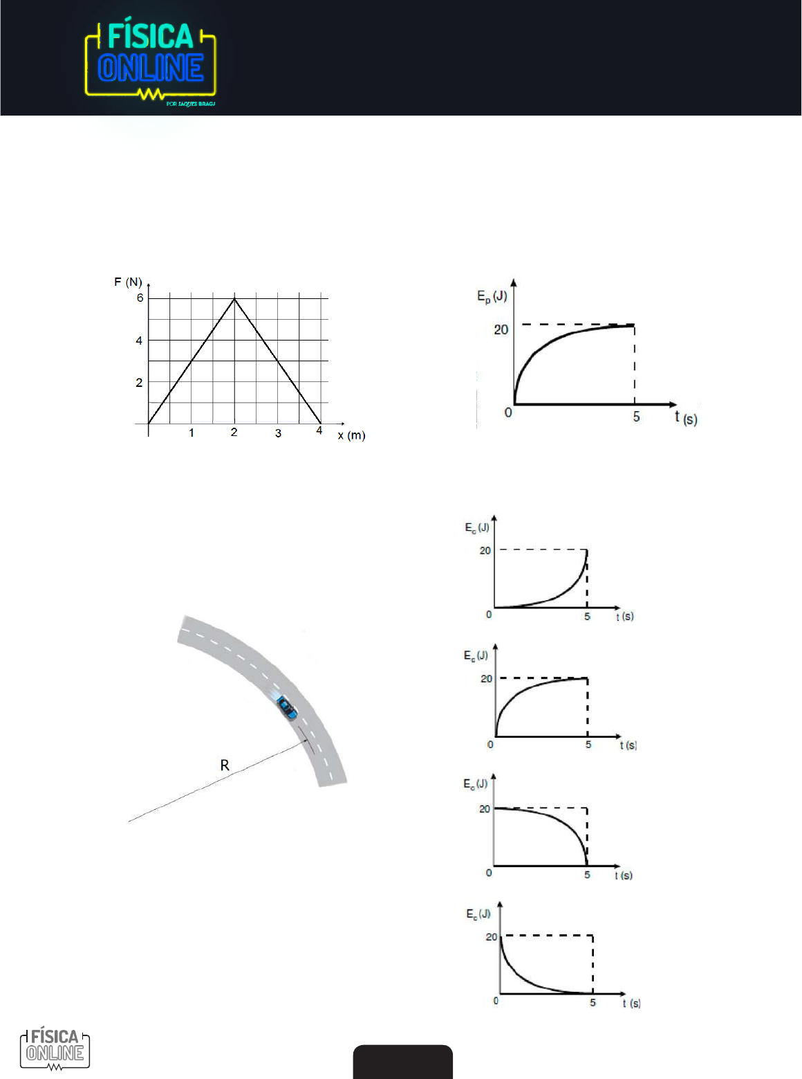 <p>52</p><p>Fí</p><p>si</p><p>ca</p><p>-</p><p>1.</p><p>00</p><p>0</p><p>Q</p><p>ue</p><p>st</p><p>õe</p><p>s</p><p>A)</p><p>ENERGIA - II</p><p>1. Uma partícula de 2 kg está inicialmente em repouso em</p><p>x = 0 m. Sobre ela atua uma única força F que varia com</p><p>a posição x, conforme mostra a figura a seguir.</p><p>Os valores da energia cinética da partícula, em J, quando</p><p>ela está em x = 2 m e em x = 4 m, são, respectivamente,</p><p>A) 0 e 12 B) 0 e 6 C) 6 e 0</p><p>D) 6 e 6 E) 6 e 12</p><p>2. Considere, na figura a seguir, a representação de um</p><p>automóvel, com velocidade de módulo constante, fazendo</p><p>uma curva circular em uma pista horizontal.</p><p>Assinale a alternativa que preenche corretamente as la-</p><p>cunas do enunciado abaixo, na ordem em que aparecem.</p><p>A força resultante sobre o automóvel é ........ e, portanto,</p><p>o trabalho por ela realizado é ........ .</p><p>A) nula – nulo</p><p>B) perpendicular ao vetor velocidade – nulo</p><p>C) paralela ao vetor velocidade – nulo</p><p>D) perpendicular ao vetor velocidade – positivo</p><p>E) paralela ao vetor velocidade – positivo</p><p>3. O gráfico a seguir mostra como varia a energia potencial</p><p>gravitacional (Ep) de uma esfera maciça na superfície da</p><p>Terra com o tempo (t).</p><p>A) B)</p><p>C) D)</p><p>Desprezando a resistência do ar, o gráfico que melhor</p><p>representa a energia cinética da esfera em função do</p><p>tempo correspondente ao gráfico anterior é:</p><p>A) B)</p><p>C) D)</p><p>A) B)</p><p>C) D)</p><p>A) B)</p><p>C) D) A) B)</p><p>C) D)</p>
