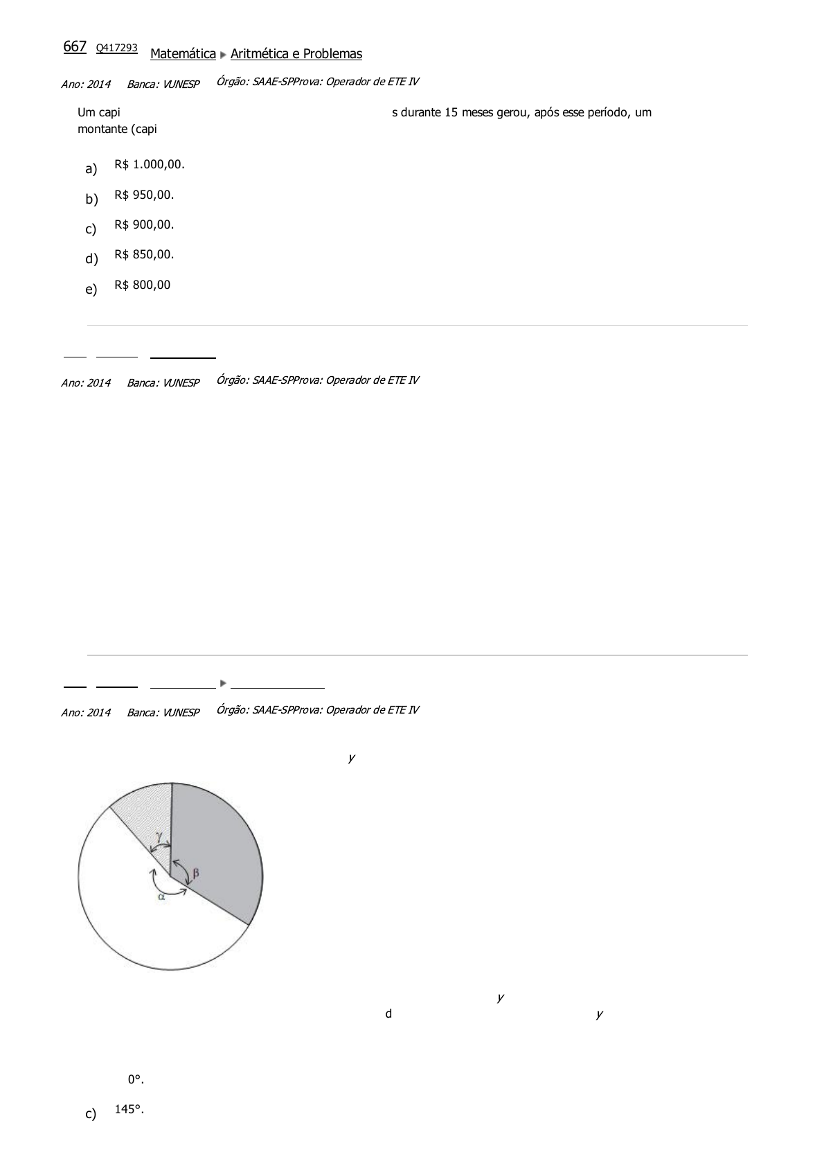 <p>14/04/2017 https://www.qconcursos.com/questoes/imprimir?ano_publicacao=2017++2016++2015++2014+2013&area=&assunto=&caderno_id=&cargo=&cod…</p><p>https://www.qconcursos.com/questoes/imprimir?ano_publicacao=2017++2016++2015++2014+2013&area=&assunto=&caderno_id=&cargo=&codigo=&di… 3/8</p><p>Ano: 2014 Banca: VUNESP Órgão: SAAESPProva: Operador de ETE IV</p><p>a) R$ 1.000,00.</p><p>b) R$ 950,00.</p><p>c) R$ 900,00.</p><p>d) R$ 850,00.</p><p>e) R$ 800,00.</p><p>Ano: 2014 Banca: VUNESP Órgão: SAAESPProva: Operador de ETE IV</p><p>a) R$ 0,90.</p><p>b) R$ 0,95.</p><p>c) R$ 1,00.</p><p>d) R$ 1,05.</p><p>e) R$ 1,10.</p><p>Ano: 2014 Banca: VUNESP Órgão: SAAESPProva: Operador de ETE IV</p><p>a) 175°.</p><p>b) 160°.</p><p>c) 145°.</p><p>667 Q417293 Matemática Aritmética e Problemas</p><p>Um capital aplicado a juro simples com taxa de 0,8% ao mês durante 15 meses gerou, após esse período, um</p><p>montante (capital + juro) de R$ 1.008,00. O capital aplicado foi</p><p>668 Q417294 Matemática</p><p>Juca chegou a uma banca de revistas com certa quantia em dinheiro para comprar 28 pacotinhos de figurinhas,</p><p>mas percebeu que ficariam faltando R$ 0,20. Decidiu, então, comprar um álbum e mais 21 pacotes de figurinhas</p><p>e recebeu R$ 0,20 de troco. Sabendo que o valor do álbum de figurinhas era R$ 5,90, então o valor de um</p><p>pacotinho de figurinhas é</p><p>669 Q417295 Matemática Geometria Plana</p><p>A prefeitura de uma cidade construiu um jardim, na forma de um círculo, e o dividiu em três setores de tamanhos</p><p>diferentes, com ângulos centrais de medidas α, ß e y, conforme mostra a figura.</p><p>Sabendo que a medida do ângulo α corresponde a 5 vezes a medida do ângulo y, e que a medida do ângulo ß</p><p>corresponde a 60% da medida do ângulo α, então, a medida, em graus, da soma dos ângulos ß e y é</p>