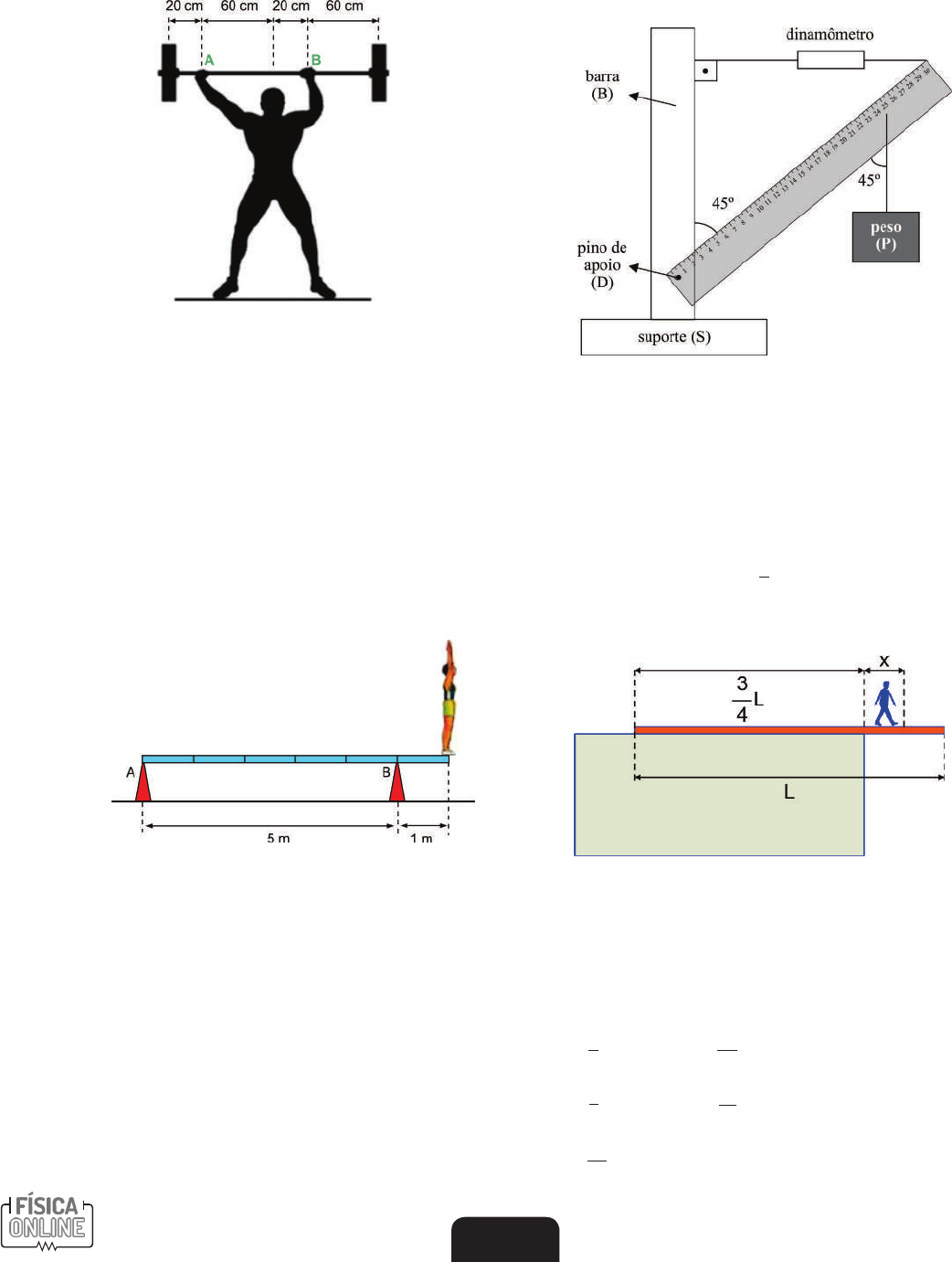 <p>84</p><p>Fí</p><p>si</p><p>ca</p><p>-</p><p>1.</p><p>00</p><p>0</p><p>Q</p><p>ue</p><p>st</p><p>õe</p><p>s</p><p>4. Um atleta mantém uma barra com duas anilhas em suas</p><p>extremidades em equilíbrio, na horizontal, segurando-a</p><p>pelos pontos A e B e aplicando, nesses pontos, forças</p><p>verticais sobre a barra.</p><p>Sabendo que a massa da barra é de 10 kg, que a massa</p><p>de cada anilha é 20 kg, adotando g = 10 m/s2 e conside-</p><p>rando as medidas indicadas na figura, a intensidade da</p><p>força aplicada pelo atleta no ponto B é</p><p>A) 100 N B) 125 N</p><p>C) 375 N D) 400 N</p><p>E) 425 N</p><p>5. Durante uma apresentação, um atleta de 80 kg caminha</p><p>sobre uma prancha de 6 m de comprimento e 40 kg de</p><p>massa, apoiada sobre dois suportes, A e B. Em deter-</p><p>minado instante, ele para e permanece em equilíbrio em</p><p>uma das extremidades da prancha, como mostra a figura.</p><p>Sendo NA e NB as intensidades das forças verticais exer-</p><p>cidas pelos apoios A e B sobre a prancha na situação de</p><p>equlíbrio descrita, é correto afirmar que</p><p>A) NA = 100 N e NB = 1.100 N</p><p>B) NA = 300 N e NB = 900 N</p><p>C) NA = 0 e NB = 1.200 N</p><p>D) NA = 400 N e NB = 800 N</p><p>E) NA = 200 N e NB = 1.000 N</p><p>6. Em uma aula de física o professor propõe aos seus alunos</p><p>a seguinte montagem experimental: um suporte (S) fixo</p><p>na mesa horizontal ao qual está preso uma barra vertical</p><p>(B). Próximo à base da barra há um pino de apoio (D)</p><p>onde se apoia uma régua milimetrada que sustenta um</p><p>peso (P) por um fio, preso na marca de 25 cm. A 30 cm</p><p>do pino, preso na extremidade superior da régua, outro</p><p>fio sustenta um dinamômetro muito leve que se mantém</p><p>na direção horizontal.</p><p>A massa da régua milimetrada é desprezível, o peso P</p><p>vale 6,0 N e a montagem experimental se encontra em</p><p>equilíbrio. Considerando sen 45o = cos 45o = 0,7, a indi-</p><p>cação do dinamômetro, em N, vale, aproximadamente,</p><p>A) 2,0 B) 3,0 C) 4,0 D) 5,0 E) 6,0</p><p>7. Uma pessoa de peso 800 N caminha para a direita sobre</p><p>uma tábua de madeira homogênea, de comprimento L e</p><p>peso 200 N, que está com 3</p><p>4</p><p>3</p><p>4 8 16</p><p>3</p><p>16</p><p>L L L L de sua extensão apoiados</p><p>sobre uma plataforma horizontal e o restante suspenso,</p><p>conforme a figura.</p><p>www.civilnet.com.br. (Adaptado)</p><p>Considerando que o atrito entre a tábua e a plataforma é</p><p>grande o suficiente para que a tábua nunca deslize en-</p><p>quanto a pessoa caminha sobre ela, a máxima distância</p><p>x indicada na figura que o homem pode caminhar para</p><p>que a tábua continue em equilíbrio é</p><p>A) 3</p><p>4</p><p>3</p><p>4 8 16</p><p>3</p><p>16</p><p>L L L L B) 3</p><p>4</p><p>3</p><p>4 8 16</p><p>3</p><p>16</p><p>L L L L</p><p>C) 3</p><p>4</p><p>3</p><p>4 8 16</p><p>3</p><p>16</p><p>L L L L D) 3</p><p>4</p><p>3</p><p>4 8 16</p><p>3</p><p>16</p><p>L L L L</p><p>E) 3</p><p>4</p><p>3</p><p>4 8 16</p><p>3</p><p>16</p><p>L L L L</p>