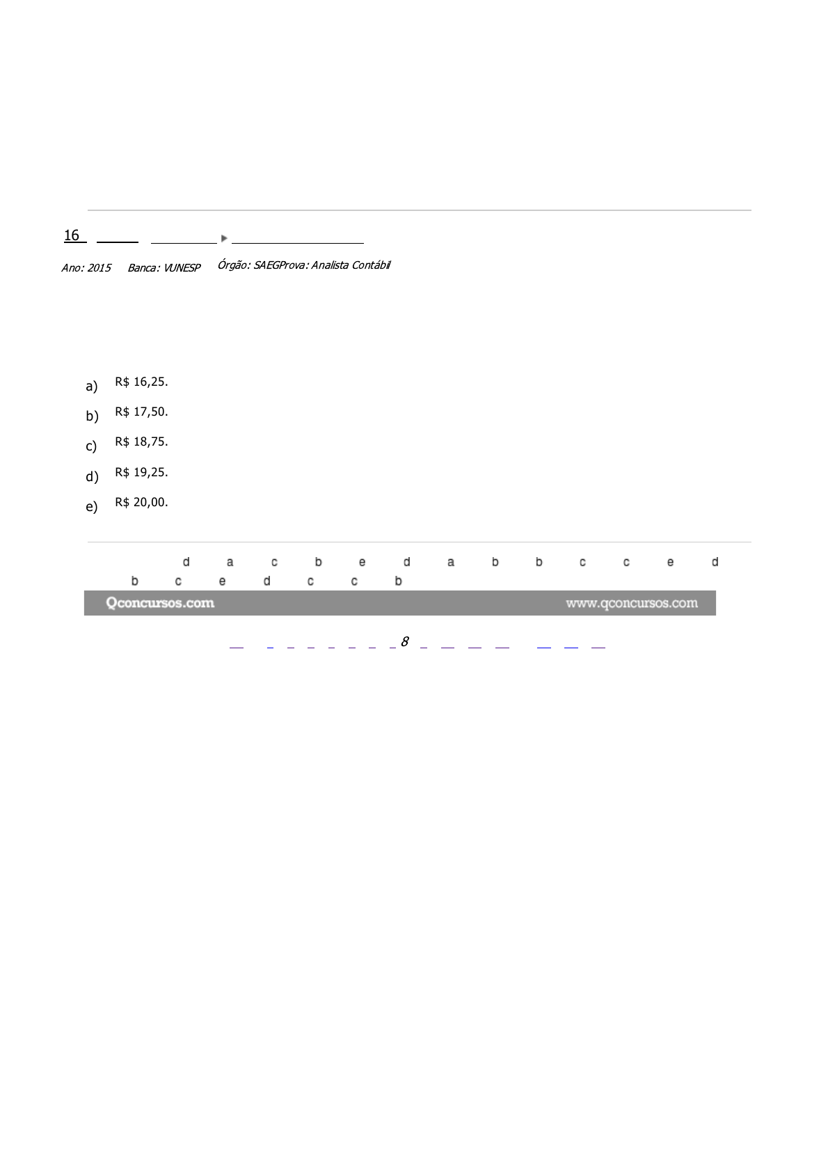 <p>14/04/2017 https://www.qconcursos.com/questoes/imprimir?ano_publicacao=2017++2016++2015++2014+2013&area=&assunto=&caderno_id=&cargo=&cod…</p><p>https://www.qconcursos.com/questoes/imprimir?ano_publicacao=2017++2016++2015++2014+2013&area=&assunto=&caderno_id=&cargo=&codigo=&di… 9/9</p><p>a) 8h 20m 30s.</p><p>b) 9h 06m 30s.</p><p>c) 9h 12m 50s.</p><p>d) 9h 18m 30s.</p><p>e) 9h 21m 50s.</p><p>Ano: 2015 Banca: VUNESP Órgão: SAEGProva: Analista Contábil</p><p>a) R$ 16,25.</p><p>b) R$ 17,50.</p><p>c) R$ 18,75.</p><p>d) R$ 19,25.</p><p>e) R$ 20,00.</p><p>160 Q616195 Matemática Aritmética e Problemas</p><p>Um líquido é vendido em copo, jarra ou balde, com preço diretamente proporcional à capacidade do</p><p>recipiente. Um copo cheio equivale a 35% de 1 litro. Uma jarra cheia tem 7/8 de 1 litro. E um balde cheio</p><p>equivale a 28/5 de uma jarra cheia. Se um copo cheio do líquido é vendido por R$ 1,25, um balde cheio desse</p><p>líquido custará</p><p>Respostas 141: 142: 143: 144: 145: 146: 147: 148: 149: 150: 151: 152: 153:</p><p>154: 155: 156: 157: 158: 159: 160:</p><p>← 1 2 3 4 5 6 7 8 9 10 11 12 … 56 57 →</p><p>https://www.qconcursos.com/questoes/imprimir?ano_publicacao=2017++2016++2015++2014+2013&area=&assunto=&caderno_id=&cargo=&codigo=&disciplina=13&escolaridade=&esfera=&instituto=&minissimulado_id=&modalidade=&nao_resolvidas=&nivel_dificuldade=&order=questao_aplicada_em+desc&organizadora=152&page=7&palavra_chave=&per_page=20&possui_anotacoes=&possui_comentarios=&possui_comentarios_gerais=&possui_gabarito_comentado_texto_e_video=&possui_material_apoio=undefined&product_id=1&prova=&q=&resolvidas=&resolvidas_certas=&resolvidas_erradas=&sem_anuladas=&sem_desatualizadas=&sem_dos_meus_cadernos=&user_id=751001</p><p>https://www.qconcursos.com/questoes/imprimir?ano_publicacao=2017++2016++2015++2014+2013&area=&assunto=&caderno_id=&cargo=&codigo=&disciplina=13&escolaridade=&esfera=&instituto=&minissimulado_id=&modalidade=&nao_resolvidas=&nivel_dificuldade=&order=questao_aplicada_em+desc&organizadora=152&page=1&palavra_chave=&per_page=20&possui_anotacoes=&possui_comentarios=&possui_comentarios_gerais=&possui_gabarito_comentado_texto_e_video=&possui_material_apoio=undefined&product_id=1&prova=&q=&resolvidas=&resolvidas_certas=&resolvidas_erradas=&sem_anuladas=&sem_desatualizadas=&sem_dos_meus_cadernos=&user_id=751001</p><p>https://www.qconcursos.com/questoes/imprimir?ano_publicacao=2017++2016++2015++2014+2013&area=&assunto=&caderno_id=&cargo=&codigo=&disciplina=13&escolaridade=&esfera=&instituto=&minissimulado_id=&modalidade=&nao_resolvidas=&nivel_dificuldade=&order=questao_aplicada_em+desc&organizadora=152&page=2&palavra_chave=&per_page=20&possui_anotacoes=&possui_comentarios=&possui_comentarios_gerais=&possui_gabarito_comentado_texto_e_video=&possui_material_apoio=undefined&product_id=1&prova=&q=&resolvidas=&resolvidas_certas=&resolvidas_erradas=&sem_anuladas=&sem_desatualizadas=&sem_dos_meus_cadernos=&user_id=751001</p><p>https://www.qconcursos.com/questoes/imprimir?ano_publicacao=2017++2016++2015++2014+2013&area=&assunto=&caderno_id=&cargo=&codigo=&disciplina=13&escolaridade=&esfera=&instituto=&minissimulado_id=&modalidade=&nao_resolvidas=&nivel_dificuldade=&order=questao_aplicada_em+desc&organizadora=152&page=3&palavra_chave=&per_page=20&possui_anotacoes=&possui_comentarios=&possui_comentarios_gerais=&possui_gabarito_comentado_texto_e_video=&possui_material_apoio=undefined&product_id=1&prova=&q=&resolvidas=&resolvidas_certas=&resolvidas_erradas=&sem_anuladas=&sem_desatualizadas=&sem_dos_meus_cadernos=&user_id=751001</p><p>https://www.qconcursos.com/questoes/imprimir?ano_publicacao=2017++2016++2015++2014+2013&area=&assunto=&caderno_id=&cargo=&codigo=&disciplina=13&escolaridade=&esfera=&instituto=&minissimulado_id=&modalidade=&nao_resolvidas=&nivel_dificuldade=&order=questao_aplicada_em+desc&organizadora=152&page=4&palavra_chave=&per_page=20&possui_anotacoes=&possui_comentarios=&possui_comentarios_gerais=&possui_gabarito_comentado_texto_e_video=&possui_material_apoio=undefined&product_id=1&prova=&q=&resolvidas=&resolvidas_certas=&resolvidas_erradas=&sem_anuladas=&sem_desatualizadas=&sem_dos_meus_cadernos=&user_id=751001</p><p>https://www.qconcursos.com/questoes/imprimir?ano_publicacao=2017++2016++2015++2014+2013&area=&assunto=&caderno_id=&cargo=&codigo=&disciplina=13&escolaridade=&esfera=&instituto=&minissimulado_id=&modalidade=&nao_resolvidas=&nivel_dificuldade=&order=questao_aplicada_em+desc&organizadora=152&page=5&palavra_chave=&per_page=20&possui_anotacoes=&possui_comentarios=&possui_comentarios_gerais=&possui_gabarito_comentado_texto_e_video=&possui_material_apoio=undefined&product_id=1&prova=&q=&resolvidas=&resolvidas_certas=&resolvidas_erradas=&sem_anuladas=&sem_desatualizadas=&sem_dos_meus_cadernos=&user_id=751001</p><p>https://www.qconcursos.com/questoes/imprimir?ano_publicacao=2017++2016++2015++2014+2013&area=&assunto=&caderno_id=&cargo=&codigo=&disciplina=13&escolaridade=&esfera=&instituto=&minissimulado_id=&modalidade=&nao_resolvidas=&nivel_dificuldade=&order=questao_aplicada_em+desc&organizadora=152&page=6&palavra_chave=&per_page=20&possui_anotacoes=&possui_comentarios=&possui_comentarios_gerais=&possui_gabarito_comentado_texto_e_video=&possui_material_apoio=undefined&product_id=1&prova=&q=&resolvidas=&resolvidas_certas=&resolvidas_erradas=&sem_anuladas=&sem_desatualizadas=&sem_dos_meus_cadernos=&user_id=751001</p><p>https://www.qconcursos.com/questoes/imprimir?ano_publicacao=2017++2016++2015++2014+2013&area=&assunto=&caderno_id=&cargo=&codigo=&disciplina=13&escolaridade=&esfera=&instituto=&minissimulado_id=&modalidade=&nao_resolvidas=&nivel_dificuldade=&order=questao_aplicada_em+desc&organizadora=152&page=7&palavra_chave=&per_page=20&possui_anotacoes=&possui_comentarios=&possui_comentarios_gerais=&possui_gabarito_comentado_texto_e_video=&possui_material_apoio=undefined&product_id=1&prova=&q=&resolvidas=&resolvidas_certas=&resolvidas_erradas=&sem_anuladas=&se