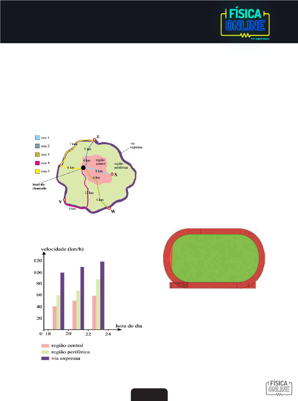 <p>1</p><p>Fí</p><p>si</p><p>ca</p><p>-</p><p>1.</p><p>00</p><p>0</p><p>Q</p><p>ue</p><p>st</p><p>õe</p><p>s</p><p>VELOCIDADE MÉDIA (VM)</p><p>1. Em grandes cidades, a rota das ambulâncias leva em</p><p>consideração fatores como proximidade do local do</p><p>chamado e rapidez no deslocamento.</p><p>Considere um chamado proveniente da região central</p><p>de uma cidade, às 19 h, conforme ilustra a figura, e que</p><p>para atendê-lo, estão disponíveis quatro bases de am-</p><p>bulâncias, X, Y, W e Z.</p><p>Para se definir a melhor rota, foram consideradas as</p><p>velocidades médias desenvolvidas pelas ambulâncias</p><p>em alguns intervalos de horários:</p><p>Assim, o chamado comunicado às 19 h será atendido</p><p>mais rapidamente pela ambulância da base</p><p>A) X, seguindo pela rota 1.</p><p>B) Z, seguindo pela rota 2.</p><p>C) W, seguindo pela rota 3.</p><p>D) Y, seguindo pela rota 4.</p><p>E) Z, seguindo pela rota 5.</p><p>2. O aluno de uma academia caminha sobre a esteira com</p><p>velocidade de 6 km/h durante 20 minutos e, após esse</p><p>período, passa a correr a 24 km/h por 10 minutos.</p><p>Considerando o tempo total do exercício, a velocidade</p><p>média desenvolvida por esse aluno, em km/h, será igual a</p><p>A) 4</p><p>B) 6</p><p>C) 16</p><p>D) 8</p><p>E) 12</p><p>3. A pista para corridas no atletismo tem extensão de 400</p><p>m e a forma mostrada na figura.</p><p>https://sportbucks.wordpress.com. (Adaptado.)</p><p>Considere uma prova na qual o atleta mais veloz corre</p><p>com velocidade média de 8,0 m/s e o mais lento com</p><p>velocidade média de 7,8 m/s. Dada a largada, com todos</p><p>os atletas partindo ao mesmo tempo e do mesmo ponto,</p><p>quando o corredor mais rápido completar a primeira volta,</p><p>o corredor mais lento terá percorrido uma distância de</p><p>A) 390 m</p><p>B) 365 m</p><p>C) 370 m</p><p>D) 375 m</p><p>E) 380 m</p>