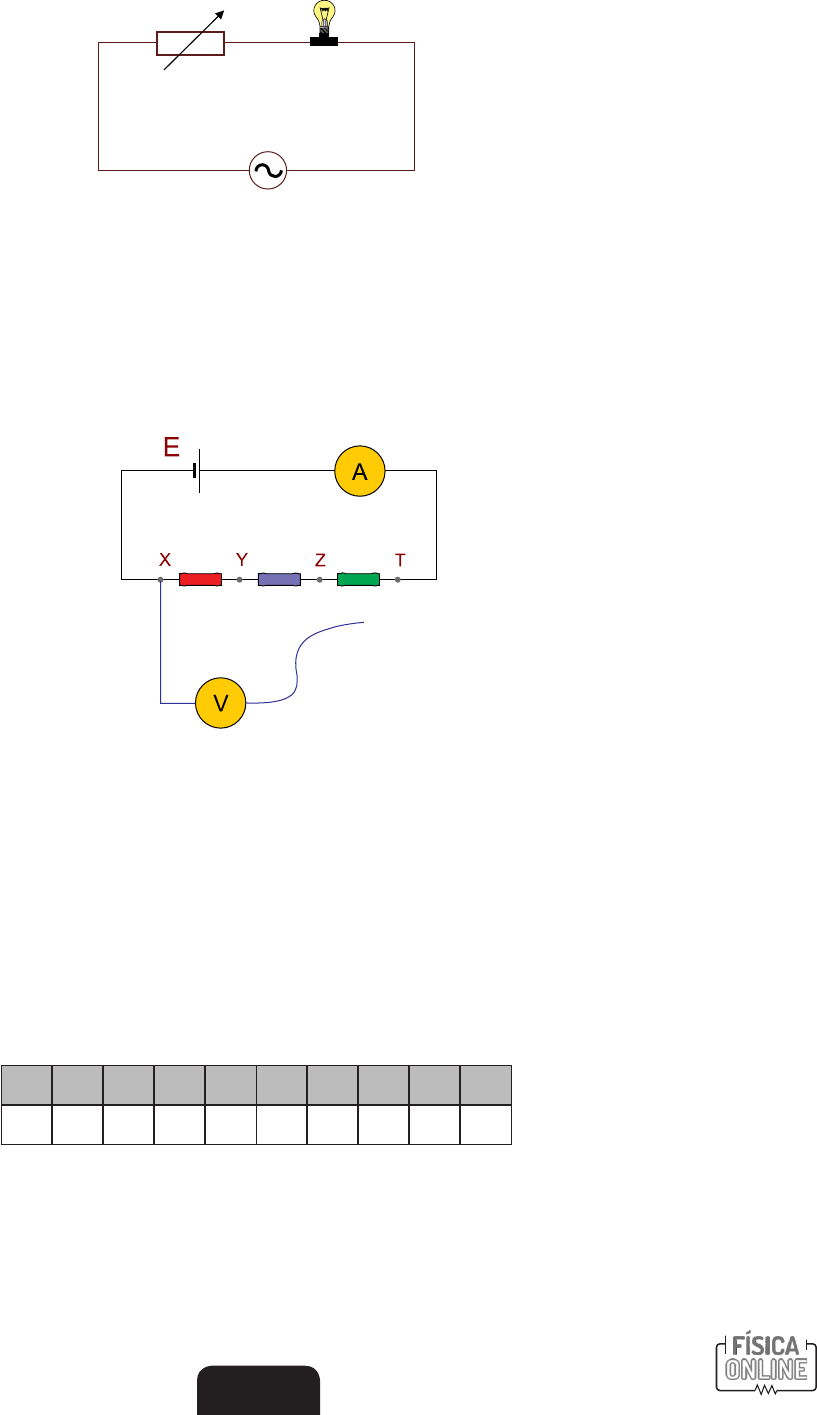 <p>253</p><p>Fí</p><p>si</p><p>ca</p><p>-</p><p>1.</p><p>00</p><p>0</p><p>Q</p><p>ue</p><p>st</p><p>õe</p><p>s</p><p>GABARITO</p><p>CIRCUITO ELÉTRICO (SÉRIE)</p><p>1 2 3 4 5 6 7 8 9 10</p><p>B A A A B C A D E C</p><p>9. A figura mostra um dispositivo para controlar o brilho de uma lâmpada, que consiste em um resistor de resistência elétrica</p><p>variável (RV) associado em série com a lâmpada.</p><p>120V</p><p>Rv</p><p>120 V – 60W</p><p>Quando a resistência do resistor RV é igual a zero, a lâmpada funciona com suas características nominais (120 V – 60 W).</p><p>Considerando que a resistência elétrica da lâmpada é constante, qualquer que seja a diferença de potencial aplicada em</p><p>seus terminais, quando a lâmpada dissipar uma potência igual a 15 W, o resistor RV dissipará uma potência, em watts, igual a</p><p>A) 45 B) 30 C) 60 D) 90 E) 15</p><p>10. Um circuito elétrico contendo três resistores associados foi montado com componentes ideais. No circuito, um dos terminais</p><p>do voltímetro é mantido fixo no ponto X, enquanto o outro terminal pode ser conectado aos pontos Y, Z e T</p><p>O amperímetro indica uma corrente elétrica de 2 A, enquanto o voltímetro, quando seu terminal livre é conectado sucessi-</p><p>vamente aos pontos Y, Z e T, indica os valores de tensão de 60 V, 100 V e 140 V, respectivamente.</p><p>Os valores das resistências elétricas do resistor vermelho, azul e verde são, nesta ordem,</p><p>A) 120 Ω, 200 Ω e 280 Ω B) 50 Ω, 25 Ω e 25 Ω C) 30 Ω, 20 Ω e 20 Ω</p><p>D) 30 Ω, 50 Ω e 70 Ω E) 50 Ω, 50 Ω e 70 Ω</p>