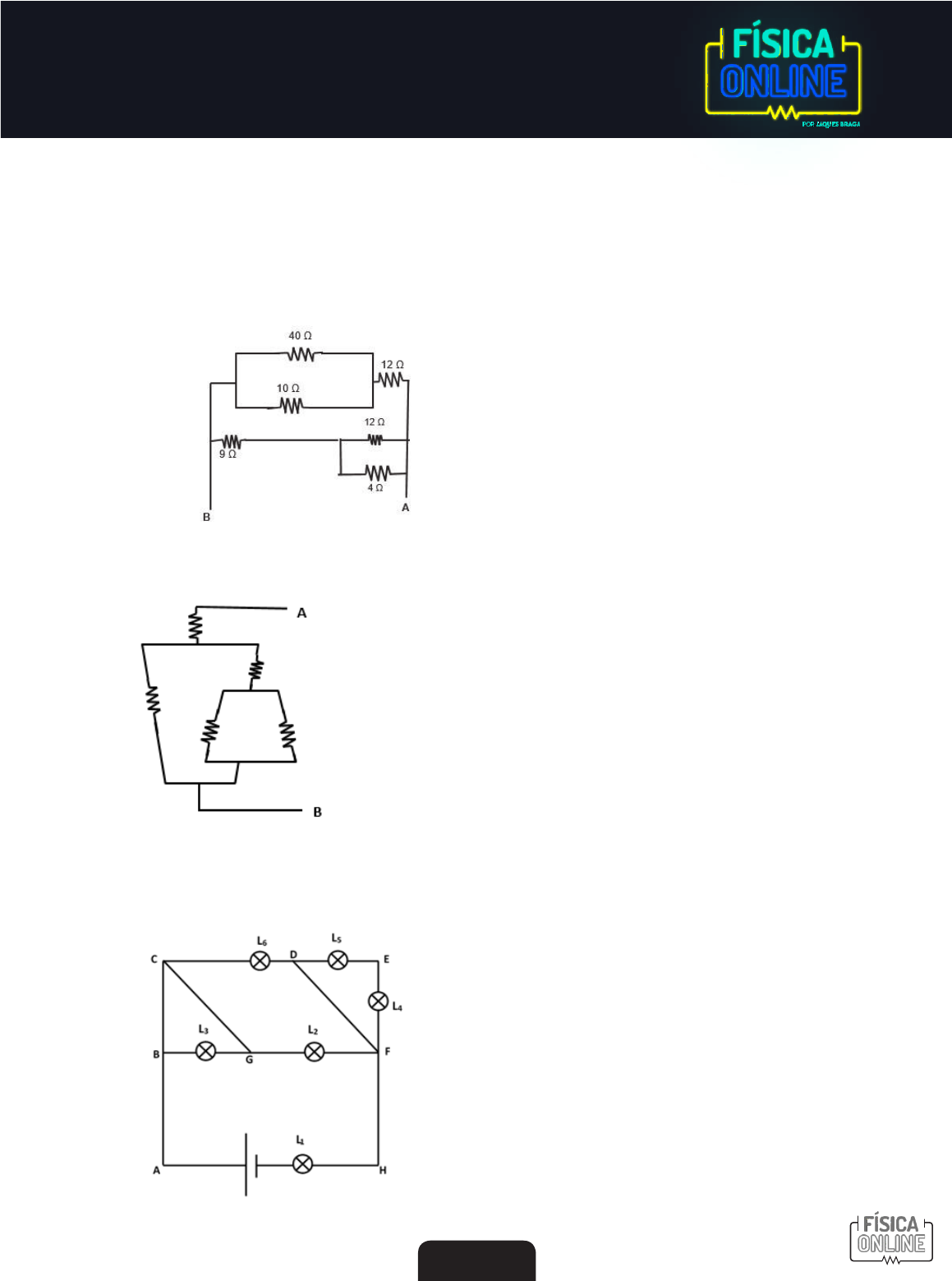 <p>261</p><p>Fí</p><p>si</p><p>ca</p><p>-</p><p>1.</p><p>00</p><p>0</p><p>Q</p><p>ue</p><p>st</p><p>õe</p><p>s</p><p>CIRCUITOS ELÉTRICOS (MISTO) I</p><p>1. A associação de resistores a seguir tem seus terminais A e B ligados a uma ddp de 3 V.</p><p>Nessas condições, a corrente elétrica</p><p>que sai da bateria é de:</p><p>A) 1,0 A</p><p>B) 7,5 A</p><p>C) 35 mA</p><p>D) 400 mA</p><p>2. Em uma associação de cinco resistores idênticos e em paralelo, a medida da resistência equivalente é de 10 Ω.</p><p>Qual será a resistência equivalente entre os terminais A e B se</p><p>esses mesmos resistores ôhmicos forem associados segundo</p><p>o esquema a seguir?</p><p>A) 3,2 Ω</p><p>B) 16 Ω</p><p>C) 75 Ω</p><p>D) 80 Ω</p><p>3. Em um laboratório de Física, um estudante apresenta uma montagem com 6 lâmpadas idênticas (de L1 a L6) de resis-</p><p>tência R, ligadas a uma tensão de 120 V, conforme representa a figura.</p><p>Nessa montagem, pode-se afirmar que:</p><p>A) a resistência equivalente do circuito é de 3R.</p><p>B) a tensão entre os pontos C e F é de 60 V.</p><p>C) apenas quatro lâmpadas encontram-se acesas.</p><p>D) as lâmpadas L3, L4 e L5 estão apagadas.</p>