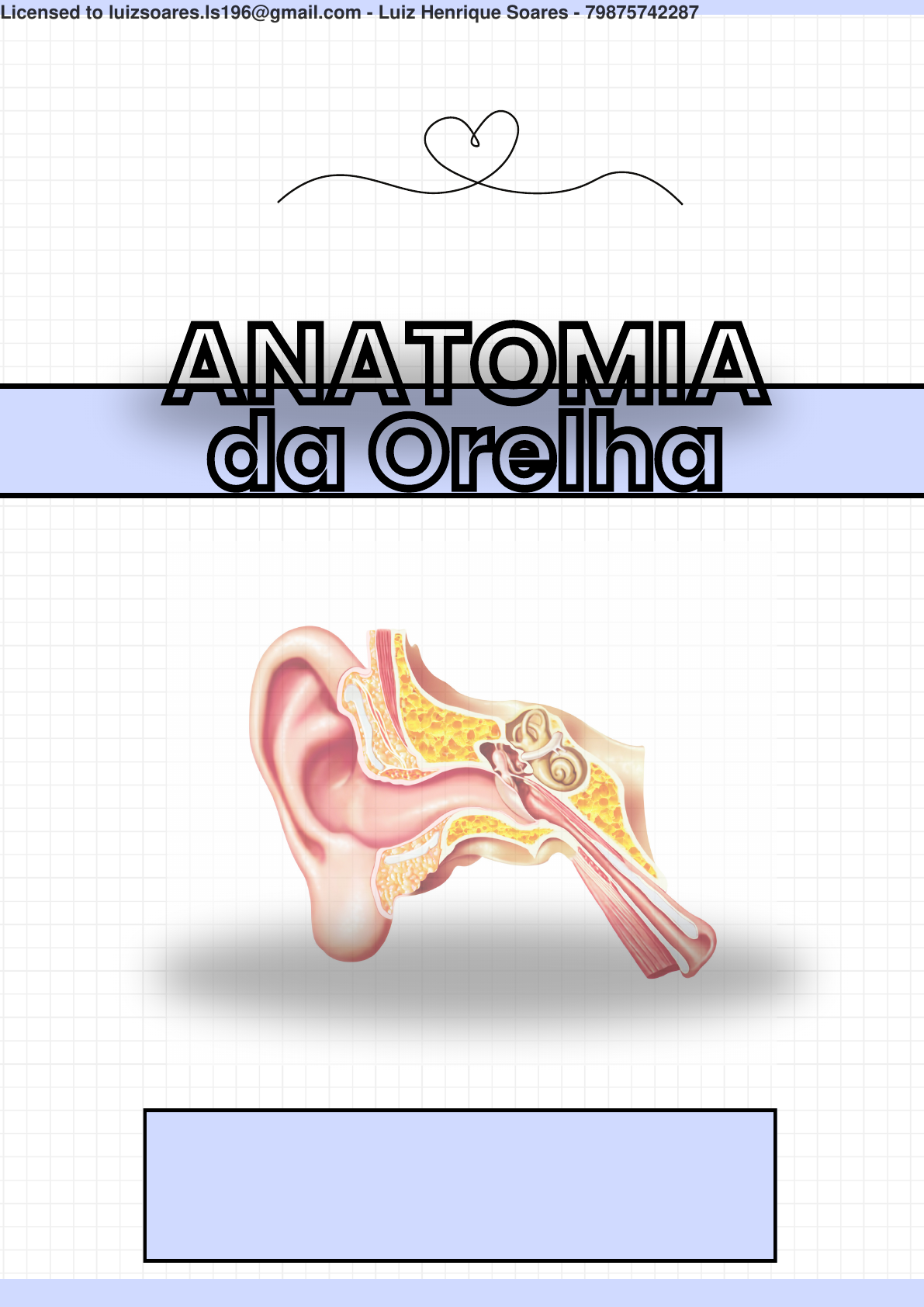 <p>Material feito por Ariel Cecon, a venda do mesmo por terceiros é</p><p>proibida. Sua venda é permitida apenas pelo site</p><p>resumosdefono.com.br. Não faça plágio, não compartilhe em</p><p>grupos públicos, caso cometa algum desses atos medidas judiciais</p><p>serão tomadas. Bons estudos!</p><p>ANATOMIAANATOMIA</p><p>@fonoarielcecon / resumosdefono.com.br</p><p>da Orelhada Orelha</p><p>Licensed to luizsoares.ls196@gmail.com - Luiz Henrique Soares - 79875742287</p><p>Material feito por Ariel Cecon, a venda do mesmo por terceiros é</p><p>proibida. Sua venda é permitida apenas pelo site</p><p>resumosdefono.com.br. Não faça plágio, não compartilhe em</p><p>grupos públicos, caso cometa algum desses atos medidas judiciais</p><p>serão tomadas. Bons estudos!</p><p>ANATOMIAANATOMIA</p><p>@fonoarielcecon / resumosdefono.com.br</p><p>da Orelhada Orelha</p><p>ORELHA;</p><p>MEATO ACÚSTICO EXTERNO E MEMBRANA</p><p>TIMPÂNICA;</p><p>ORELHA EXTERNA;</p><p>ORELHA MÉDIA;</p><p>PAREDES DA CAVIDADE TIMPÂNICA;</p><p>TUBA AUDITIVA;</p><p>OSSÍCULOS DA AUDIÇÃO;</p><p>MÚSCULOS ASSOCIADOS AOS OSSÍCULOS DA</p><p>AUDIÇÃO;</p><p>ORELHA INTERNA;</p><p>LABIRINTO ÓSSEO E MEMBRANÁCEO;</p><p>MEATO ACÚSTICO INTERNO;</p><p>EXERCÍCIOS DE FIXAÇÃO.</p><p>Licensed to luizsoares.ls196@gmail.com - Luiz Henrique Soares - 79875742287</p><p>Material feito por Ariel Cecon, a venda do mesmo por terceiros é proibida. Sua venda é permitida</p><p>apenas pelo site resumosdefono.com.br. Não faça plágio, não compartilhe em grupos públicos,</p><p>caso cometa algum desses atos medidas judiciais serão tomadas. Bons estudos!</p><p>ANATOMIA DA ORELHAANATOMIA DA ORELHA</p><p>A orelha, órgão responsável pela audição e equilíbrio, é composta por uma lâmina de</p><p>cartilagem elástica de formato irregular, revestida por pele fina e dividida em partes</p><p>externa, média e interna.</p><p>As partes externa e média desempenham um papel crucial na condução do som para</p><p>a orelha interna, onde estão localizados os órgãos da audição e do equilíbrio. A</p><p>membrana timpânica separa a orelha externa da orelha média, enquanto a tuba</p><p>auditiva conecta a orelha média à parte nasal da faringe. Além disso, a orelha</p><p>apresenta diversas depressões e elevações. A concha é a depressão mais proeminente,</p><p>enquanto a margem elevada é conhecida como hélice. O lóbulo, não composto de</p><p>cartilagem, consiste em tecido fibroso, gordura e vasos sanguíneos, sendo facilmente</p><p>perfurado para a colocação de brincos ou para a coleta de pequenas amostras de</p><p>sangue. O trago, fica sobreposto ao poro acústico externo. A irrigação arterial da orelha</p><p>é principalmente proveniente das artérias auricular posterior e temporal superficial.</p><p>@fonoarielcecon / resumosdefono.com.br</p><p>Orelha</p><p>Figura 1: Partes da Orelha; Fonte: Livro</p><p>de Anatomia orientada para a clínica.</p><p>Figura 2: Orelha Externa; Fonte: Livro de Anatomia orientada para a clínica.</p><p>Licensed to luizsoares.ls196@gmail.com - Luiz Henrique Soares - 79875742287</p><p>Material feito por Ariel Cecon, a venda do mesmo por terceiros é proibida. Sua venda é permitida</p><p>apenas pelo site resumosdefono.com.br. Não faça plágio, não compartilhe em grupos públicos,</p><p>caso cometa algum desses atos medidas judiciais serão tomadas. Bons estudos!</p><p>ANATOMIA DA ORELHAANATOMIA DA ORELHA</p><p>@fonoarielcecon / resumosdefono.com.br</p><p>Orelha</p><p>Os principais nervos responsáveis pela inervação da pele da orelha são o auricular</p><p>magno e o auriculotemporal. O nervo auricular magno é responsável por suprir a região</p><p>cranial (medial) e a parte posterior (hélice, antélice e lóbulo) da face lateral. Já o nervo</p><p>auriculotemporal, que é um ramo do nervo trigêmeo, fornece inervação à pele da parte</p><p>anterior da face lateral da orelha externa, incluindo a margem da concha, o ramo da</p><p>hélice e o trago.</p><p>A pele da concha da orelha recebe sua principal inervação do ramo auricular do nervo</p><p>vago, com uma contribuição mínima do nervo facial.</p><p>Fonte: Livro de Anatomia orientada para a clínica.</p><p>MEATO ACÚSTICO EXTERNO E MEMBRANA TIMPÂNICA</p><p>O meato acústico externo é o canal da orelha que se estende internamente através da</p><p>porção timpânica do osso temporal, indo da orelha até a membrana timpânica e é</p><p>responsável por direcionar o som do ambiente para o tímpano. O terço lateral desse</p><p>canal, é composto por cartilagem e está revestido por pele contínua com a pele da</p><p>orelha. Por outro lado, os dois terços mediais do meato são constituídos por osso e</p><p>cobertos por uma fina camada de pele, que se estende até a camada externa da</p><p>membrana timpânica. As glândulas ceruminosas e sebáceas presentes no tecido</p><p>subcutâneo da parte cartilaginosa do meato são responsáveis pela produção de</p><p>cerume.</p><p>Licensed to luizsoares.ls196@gmail.com - Luiz Henrique Soares - 79875742287</p><p>MEATO ACÚSTICO EXTERNO E MEMBRANA TIMPÂNICA</p><p>ORELHA MÉDIA</p><p>Material feito por Ariel Cecon, a venda do mesmo por terceiros é proibida. Sua venda é permitida</p><p>apenas pelo site resumosdefono.com.br. Não faça plágio, não compartilhe em grupos públicos,</p><p>caso cometa algum desses atos medidas judiciais serão tomadas. Bons estudos!</p><p>ANATOMIA DA ORELHAANATOMIA DA ORELHA</p><p>@fonoarielcecon / resumosdefono.com.br</p><p>A membrana timpânica, localizada na extremidade medial do meato acústico</p><p>externo, é uma estrutura fina, oval e semitransparente. Externamente, é revestida por</p><p>uma fina camada de pele, enquanto internamente está em contato com a túnica</p><p>mucosa da orelha média. Funciona como uma barreira entre o meato acústico</p><p>externo e a cavidade timpânica da orelha média.</p><p>Além de sua função de separação, a memb