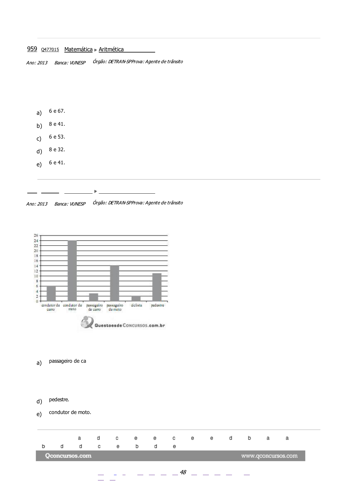 <p>14/04/2017 https://www.qconcursos.com/questoes/imprimir?ano_publicacao=2017++2016++2015++2014+2013&area=&assunto=&caderno_id=&cargo=&cod…</p><p>https://www.qconcursos.com/questoes/imprimir?ano_publicacao=2017++2016++2015++2014+2013&area=&assunto=&caderno_id=&cargo=&codigo=&di… 7/8</p><p>e) foi suficiente, e sobraram R$ 2.000,00.</p><p>Ano: 2013 Banca: VUNESP Órgão: DETRANSPProva: Agente de trânsito</p><p>a) 6 e 67.</p><p>b) 8 e 41.</p><p>c) 6 e 53.</p><p>d) 8 e 32.</p><p>e) 6 e 41.</p><p>Ano: 2013 Banca: VUNESP Órgão: DETRANSPProva: Agente de trânsito</p><p>a) passageiro de carro.</p><p>b) condutor de carro.</p><p>c) passageiro de moto.</p><p>d) pedestre.</p><p>e) condutor de moto.</p><p>959 Q477015 Matemática Aritmética e Problemas</p><p>Uma coleção de miniaturas de brinquedos é formada por 328 carrinhos, 256 motos e 192 caminhões. Os</p><p>brinquedos serão organizados em grupos com a mesma quantidade, de modo que cada grupo seja formado pelo</p><p>mesmo tipo de miniatura. Desejandose que cada grupo tenha o maior número possível de miniaturas, então o</p><p>número de brinquedos em cada grupo e a quantidade de grupos formados com motos são, respectivamente,</p><p>960 Q477016 Matemática Aritmética e Problemas</p><p>O gráfico apresenta a distribuição de vítimas de trânsito no mês de julho de 2013, segundo o tipo de usuário da</p><p>via pública em uma determinada cidade brasileira.</p><p>O grupo que corresponde a 2/5 do total de vítimas é o de</p><p>Respostas 941: 942: 943: 944: 945: 946: 947: 948: 949: 950: 951: 952: 953:</p><p>954: 955: 956: 957: 958: 959: 960:</p><p>← 1 2 … 44 45 46 47 48 49 50 51 52 … 56</p><p>57 →</p><p>https://www.qconcursos.com/questoes/imprimir?ano_publicacao=2017++2016++2015++2014+2013&area=&assunto=&caderno_id=&cargo=&codigo=&disciplina=13&escolaridade=&esfera=&instituto=&minissimulado_id=&modalidade=&nao_resolvidas=&nivel_dificuldade=&order=questao_aplicada_em+desc&organizadora=152&page=47&palavra_chave=&per_page=20&possui_anotacoes=&possui_comentarios=&possui_comentarios_gerais=&possui_gabarito_comentado_texto_e_video=&possui_material_apoio=undefined&product_id=1&prova=&q=&resolvidas=&resolvidas_certas=&resolvidas_erradas=&sem_anuladas=&sem_desatualizadas=&sem_dos_meus_cadernos=&user_id=751001</p><p>https://www.qconcursos.com/questoes/imprimir?ano_publicacao=2017++2016++2015++2014+2013&area=&assunto=&caderno_id=&cargo=&codigo=&disciplina=13&escolaridade=&esfera=&instituto=&minissimulado_id=&modalidade=&nao_resolvidas=&nivel_dificuldade=&order=questao_aplicada_em+desc&organizadora=152&page=1&palavra_chave=&per_page=20&possui_anotacoes=&possui_comentarios=&possui_comentarios_gerais=&possui_gabarito_comentado_texto_e_video=&possui_material_apoio=undefined&product_id=1&prova=&q=&resolvidas=&resolvidas_certas=&resolvidas_erradas=&sem_anuladas=&sem_desatualizadas=&sem_dos_meus_cadernos=&user_id=751001</p><p>https://www.qconcursos.com/questoes/imprimir?ano_publicacao=2017++2016++2015++2014+2013&area=&assunto=&caderno_id=&cargo=&codigo=&disciplina=13&escolaridade=&esfera=&instituto=&minissimulado_id=&modalidade=&nao_resolvidas=&nivel_dificuldade=&order=questao_aplicada_em+desc&organizadora=152&page=2&palavra_chave=&per_page=20&possui_anotacoes=&possui_comentarios=&possui_comentarios_gerais=&possui_gabarito_comentado_texto_e_video=&possui_material_apoio=undefined&product_id=1&prova=&q=&resolvidas=&resolvidas_certas=&resolvidas_erradas=&sem_anuladas=&sem_desatualizadas=&sem_dos_meus_cadernos=&user_id=751001</p><p>https://www.qconcursos.com/questoes/imprimir?ano_publicacao=2017++2016++2015++2014+2013&area=&assunto=&caderno_id=&cargo=&codigo=&disciplina=13&escolaridade=&esfera=&instituto=&minissimulado_id=&modalidade=&nao_resolvidas=&nivel_dificuldade=&order=questao_aplicada_em+desc&organizadora=152&page=44&palavra_chave=&per_page=20&possui_anotacoes=&possui_comentarios=&possui_comentarios_gerais=&possui_gabarito_comentado_texto_e_video=&possui_material_apoio=undefined&product_id=1&prova=&q=&resolvidas=&resolvidas_certas=&resolvidas_erradas=&sem_anuladas=&sem_desatualizadas=&sem_dos_meus_cadernos=&user_id=751001</p><p>https://www.qconcursos.com/questoes/imprimir?ano_publicacao=2017++2016++2015++2014+2013&area=&assunto=&caderno_id=&cargo=&codigo=&disciplina=13&escolaridade=&esfera=&instituto=&minissimulado_id=&modalidade=&nao_resolvidas=&nivel_dificuldade=&order=questao_aplicada_em+desc&organizadora=152&page=45&palavra_chave=&per_page=20&possui_anotacoes=&possui_comentarios=&possui_comentarios_gerais=&possui_gabarito_comentado_texto_e_video=&possui_material_apoio=undefined&product_id=1&prova=&q=&resolvidas=&resolvidas_certas=&resolvidas_erradas=&sem_anuladas=&sem_desatualizadas=&sem_dos_meus_cadernos=&user_id=751001</p><p>https://www.qconcursos.com/questoes/imprimir?ano_publicacao=2017++2016++2015++2014+2013&area=&assunto=&caderno_id=&cargo=&codigo=&disciplina=13&escolaridade=&esfera=&instituto=&minissimulado_id=&modalidade=&nao_resolvidas=&nivel_dificuldade=&order=questao_aplicada_em+desc&organizadora=152&page=46&palavra_chave=&per_page=20&possui_anotacoes=&possui_comentarios=&possui_comentarios_gerais=&possui_gabarito_comentado_texto_e_video=&possui_material_apoio=undefined&product_id=1&prova=&q=&resolvidas=&resolvidas_certas=&resolvidas_erradas=&sem_anuladas=&sem_desatualizadas=&sem_dos_meus_cadernos=&user_id=751001</p><p>https://www.qconcursos.com/questoes/imprimir?ano_publicacao=2017++2016++2015++2014+2013&area=&assunto=&caderno_id=&cargo=&codigo=&disciplina=13&escolaridade=&esfera=&instituto=&minissimulado_id=&modalidade=&nao_resolvidas=&nivel_dificuldade=&order=questao_aplicada_em+desc&organizadora=152&page=47&palavra_chave=&per_page=20&possui_anotacoes=&possui_comentarios=&possui_comentarios_gerais=&possui_gabarito_comentado_texto_e_video=&possui_material_apoio=undefined&product_id=1&prova=&q=&resolvidas=&resolvidas_certas=&resolvidas_erradas=&sem_anuladas=&sem_desatualizadas=&sem_dos_meus_cadernos=&user_id=751001</p><p>ht