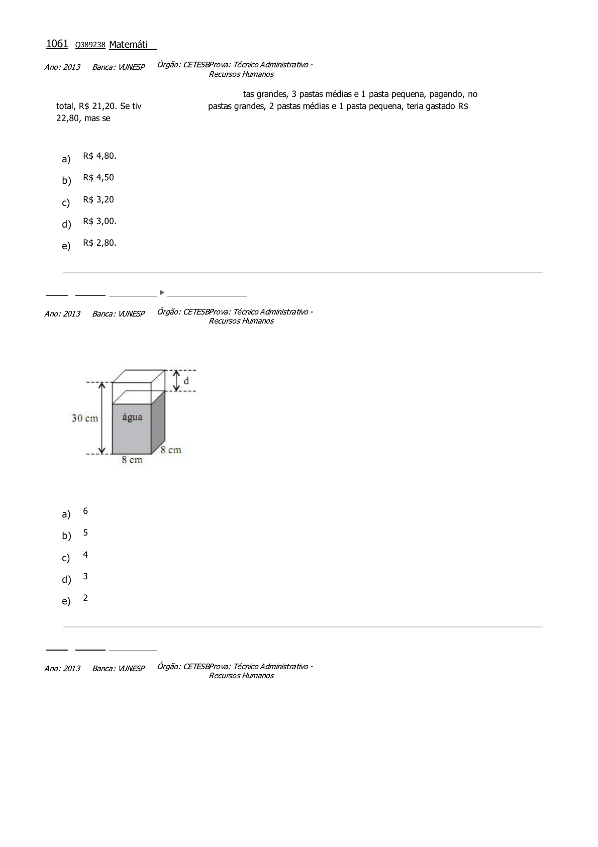 <p>14/04/2017 https://www.qconcursos.com/questoes/imprimir?ano_publicacao=2017++2016++2015++2014+2013&area=&assunto=&caderno_id=&cargo=&cod…</p><p>https://www.qconcursos.com/questoes/imprimir?ano_publicacao=2017++2016++2015++2014+2013&area=&assunto=&caderno_id=&cargo=&codigo=&di… 1/9</p><p>Ano: 2013 Banca: VUNESP Órgão: CETESBProva: Técnico Administrativo </p><p>Recursos Humanos</p><p>a) R$ 4,80.</p><p>b) R$ 4,50</p><p>c) R$ 3,20</p><p>d) R$ 3,00.</p><p>e) R$ 2,80.</p><p>Ano: 2013 Banca: VUNESP Órgão: CETESBProva: Técnico Administrativo </p><p>Recursos Humanos</p><p>a) 6</p><p>b) 5</p><p>c) 4</p><p>d) 3</p><p>e) 2</p><p>Ano: 2013 Banca: VUNESP Órgão: CETESBProva: Técnico Administrativo </p><p>Recursos Humanos</p><p>1061 Q389238 Matemática</p><p>Uma pessoa foi a uma papelaria e comprou 2 pastas grandes, 3 pastas médias e 1 pasta pequena, pagando, no</p><p>total, R$ 21,20. Se tivesse comprado 3 pastas grandes, 2 pastas médias e 1 pasta pequena, teria gastado R$</p><p>22,80, mas se tivesse comprado 3 pastas de cada tamanho teria gastado R$ 30,00. A diferença de preço entre a</p><p>pasta mais cara e a pasta mais barata era.</p><p>1062 Q389239 Matemática Geometria Espacial</p><p>Em uma jarra de fundo quadrado, medindo 8 cm de lado e 30 cm de altura, foram despejadas 5 canecas, todas contendo 320 mL de água,</p><p>fazendo com que a jarra não ficasse totalmente cheia, conforme mostra a figura.</p><p>A distância d, em cm, entre o nível da água na jarra e a borda superior é:</p><p>1063 Q389240 Matemática</p><p>O jornal Folha de S.Paulo publicou em 14 de janeiro de 2013, a seguinte informação:</p><p>BETA</p>