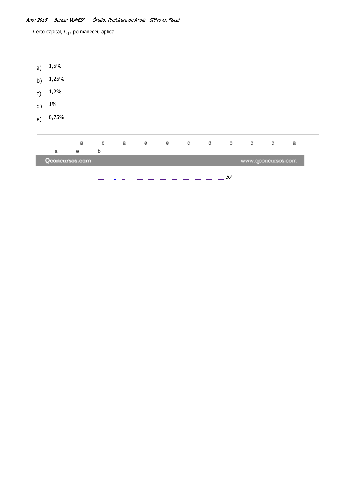<p>14/04/2017 https://www.qconcursos.com/questoes/imprimir?ano_publicacao=2017++2016++2015++2014+2013&area=&assunto=&caderno_id=&cargo=&cod…</p><p>https://www.qconcursos.com/questoes/imprimir?ano_publicacao=2017++2016++2015++2014+2013&area=&assunto=&caderno_id=&cargo=&codigo=&di… 6/6</p><p>Ano: 2015 Banca: VUNESP Órgão: Prefeitura de Arujá SPProva: Fiscal</p><p>a) 1,5%</p><p>b) 1,25%</p><p>c) 1,2%</p><p>d) 1%</p><p>e) 0,75%</p><p>Certo capital, C1, permaneceu aplicado durante 4 meses a uma taxa de juro simples de 18% ao ano e rendeu R$</p><p>450,00 de juros. Outro capital, C2, igual a 80% de C1, foi aplicado por 8 meses e rendeu R$ 600,00 de juros. O</p><p>capital C2 foi aplicado a uma taxa mensal de juros simples de</p><p>Respostas 1121: 1122: 1123: 1124: 1125: 1126: 1127: 1128: 1129: 1130: 1131:</p><p>1132: 1133: 1134:</p><p>← 1 2 … 49 50 51 52 53 54 55 56 57 →</p><p>https://www.qconcursos.com/questoes/imprimir?ano_publicacao=2017++2016++2015++2014+2013&area=&assunto=&caderno_id=&cargo=&codigo=&disciplina=13&escolaridade=&esfera=&instituto=&minissimulado_id=&modalidade=&nao_resolvidas=&nivel_dificuldade=&order=questao_aplicada_em+desc&organizadora=152&page=56&palavra_chave=&per_page=20&possui_anotacoes=&possui_comentarios=&possui_comentarios_gerais=&possui_gabarito_comentado_texto_e_video=&possui_material_apoio=undefined&product_id=1&prova=&q=&resolvidas=&resolvidas_certas=&resolvidas_erradas=&sem_anuladas=&sem_desatualizadas=&sem_dos_meus_cadernos=&user_id=751001</p><p>https://www.qconcursos.com/questoes/imprimir?ano_publicacao=2017++2016++2015++2014+2013&area=&assunto=&caderno_id=&cargo=&codigo=&disciplina=13&escolaridade=&esfera=&instituto=&minissimulado_id=&modalidade=&nao_resolvidas=&nivel_dificuldade=&order=questao_aplicada_em+desc&organizadora=152&page=1&palavra_chave=&per_page=20&possui_anotacoes=&possui_comentarios=&possui_comentarios_gerais=&possui_gabarito_comentado_texto_e_video=&possui_material_apoio=undefined&product_id=1&prova=&q=&resolvidas=&resolvidas_certas=&resolvidas_erradas=&sem_anuladas=&sem_desatualizadas=&sem_dos_meus_cadernos=&user_id=751001</p><p>https://www.qconcursos.com/questoes/imprimir?ano_publicacao=2017++2016++2015++2014+2013&area=&assunto=&caderno_id=&cargo=&codigo=&disciplina=13&escolaridade=&esfera=&instituto=&minissimulado_id=&modalidade=&nao_resolvidas=&nivel_dificuldade=&order=questao_aplicada_em+desc&organizadora=152&page=2&palavra_chave=&per_page=20&possui_anotacoes=&possui_comentarios=&possui_comentarios_gerais=&possui_gabarito_comentado_texto_e_video=&possui_material_apoio=undefined&product_id=1&prova=&q=&resolvidas=&resolvidas_certas=&resolvidas_erradas=&sem_anuladas=&sem_desatualizadas=&sem_dos_meus_cadernos=&user_id=751001</p><p>https://www.qconcursos.com/questoes/imprimir?ano_publicacao=2017++2016++2015++2014+2013&area=&assunto=&caderno_id=&cargo=&codigo=&disciplina=13&escolaridade=&esfera=&instituto=&minissimulado_id=&modalidade=&nao_resolvidas=&nivel_dificuldade=&order=questao_aplicada_em+desc&organizadora=152&page=49&palavra_chave=&per_page=20&possui_anotacoes=&possui_comentarios=&possui_comentarios_gerais=&possui_gabarito_comentado_texto_e_video=&possui_material_apoio=undefined&product_id=1&prova=&q=&resolvidas=&resolvidas_certas=&resolvidas_erradas=&sem_anuladas=&sem_desatualizadas=&sem_dos_meus_cadernos=&user_id=751001</p><p>https://www.qconcursos.com/questoes/imprimir?ano_publicacao=2017++2016++2015++2014+2013&area=&assunto=&caderno_id=&cargo=&codigo=&disciplina=13&escolaridade=&esfera=&instituto=&minissimulado_id=&modalidade=&nao_resolvidas=&nivel_dificuldade=&order=questao_aplicada_em+desc&organizadora=152&page=50&palavra_chave=&per_page=20&possui_anotacoes=&possui_comentarios=&possui_comentarios_gerais=&possui_gabarito_comentado_texto_e_video=&possui_material_apoio=undefined&product_id=1&prova=&q=&resolvidas=&resolvidas_certas=&resolvidas_erradas=&sem_anuladas=&sem_desatualizadas=&sem_dos_meus_cadernos=&user_id=751001</p><p>https://www.qconcursos.com/questoes/imprimir?ano_publicacao=2017++2016++2015++2014+2013&area=&assunto=&caderno_id=&cargo=&codigo=&disciplina=13&escolaridade=&esfera=&instituto=&minissimulado_id=&modalidade=&nao_resolvidas=&nivel_dificuldade=&order=questao_aplicada_em+desc&organizadora=152&page=51&palavra_chave=&per_page=20&possui_anotacoes=&possui_comentarios=&possui_comentarios_gerais=&possui_gabarito_comentado_texto_e_video=&possui_material_apoio=undefined&product_id=1&prova=&q=&resolvidas=&resolvidas_certas=&resolvidas_erradas=&sem_anuladas=&sem_desatualizadas=&sem_dos_meus_cadernos=&user_id=751001</p><p>https://www.qconcursos.com/questoes/imprimir?ano_publicacao=2017++2016++2015++2014+2013&area=&assunto=&caderno_id=&cargo=&codigo=&disciplina=13&escolaridade=&esfera=&instituto=&minissimulado_id=&modalidade=&nao_resolvidas=&nivel_dificuldade=&order=questao_aplicada_em+desc&organizadora=152&page=52&palavra_chave=&per_page=20&possui_anotacoes=&possui_comentarios=&possui_comentarios_gerais=&possui_gabarito_comentado_texto_e_video=&possui_material_apoio=undefined&product_id=1&prova=&q=&resolvidas=&resolvidas_certas=&resolvidas_erradas=&sem_anuladas=&sem_desatualizadas=&sem_dos_meus_cadernos=&user_id=751001</p><p>https://www.qconcursos.com/questoes/imprimir?ano_publicacao=2017++2016++2015++2014+2013&area=&assunto=&caderno_id=&cargo=&codigo=&disciplina=13&escolaridade=&esfera=&instituto=&minissimulado_id=&modalidade=&nao_resolvidas=&nivel_dificuldade=&order=questao_aplicada_em+desc&organizadora=152&page=53&palavra_chave=&per_page=20&possui_anotacoes=&possui_comentarios=&possui_comentarios_gerais=&possui_gabarito_comentado_texto_e_video=&possui_material_apoio=undefined&product_id=1&prova=&q=&resolvidas=&resolvidas_certas=&resolvidas_erradas=&sem_anuladas=&sem_desatualizadas=&sem_dos_meus_cadernos=&user_id=751001</p><p>https://www.qconcursos.com/questoes/imprimir?ano_publicacao=2017++2016++2015++2014+2013&area=&assunto=&caderno_id=&cargo=&codigo=&disciplina=13&escolaridade=&esfera=&instituto=&minissimul