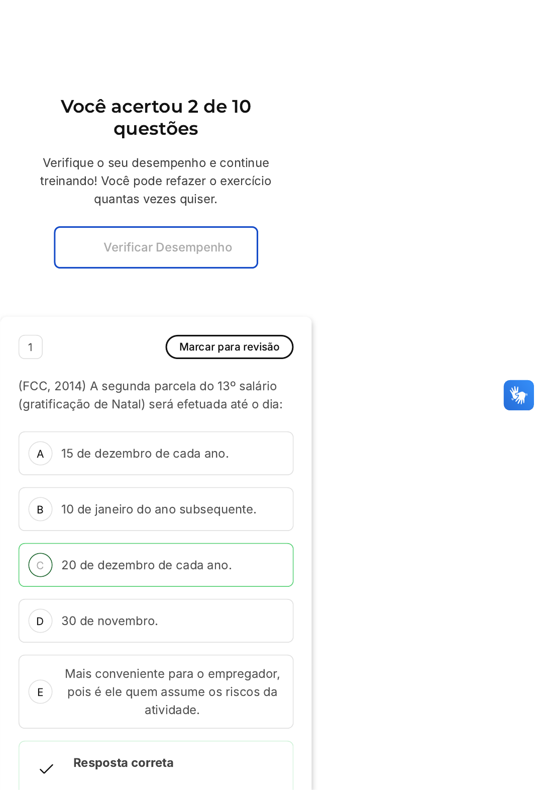 <p>Você acertou 2 de 10</p><p>questões</p><p>Verifique o seu desempenho e continue</p><p>treinando! Você pode refazer o exercício</p><p>quantas vezes quiser.</p><p>Verificar Desempenho</p><p>A</p><p>B</p><p>C</p><p>D</p><p>E</p><p>1 Marcar para revisão</p><p>�FCC, 2014� A segunda parcela do 13º salário</p><p>(gratificação de Natal) será efetuada até o dia:</p><p>15 de dezembro de cada ano.</p><p>10 de janeiro do ano subsequente.</p><p>20 de dezembro de cada ano.</p><p>30 de novembro.</p><p>Mais conveniente para o empregador,</p><p>pois é ele quem assume os riscos da</p><p>atividade.</p><p>Resposta correta</p><p>A</p><p>B</p><p>C</p><p>Parabéns, você selecionou a</p><p>alternativa correta. Confira o</p><p>gabarito comentado!</p><p>Gabarito Comentado</p><p>De acordo com a legislação trabalhista</p><p>brasileira, a segunda parcela do 13º salário</p><p>deve ser paga até o dia 20 de dezembro de</p><p>cada ano. Portanto, a alternativa correta é</p><p>a "C", que afirma que a segunda parcela do</p><p>13º salário será efetuada até o dia 20 de</p><p>dezembro de cada ano.</p><p>2 Marcar para revisão</p><p>�UFPR, 2015� Sobre o direito a férias, conforme</p><p>disposto na Consolidação das Leis do Trabalho,</p><p>assinale a alternativa incorreta:</p><p>Todo empregado terá direito</p><p>anualmente ao gozo de um período de</p><p>férias, sem prejuízo da remuneração.</p><p>Após cada período de 12 (doze) meses</p><p>de vigência do contrato de trabalho, o</p><p>empregado terá direito a férias.</p><p>Não terá direito a férias o empregado</p><p>que, no curso do período aquisitivo,</p><p>permanecer em gozo de licença, com</p><p>percepção de salários, por mais de 30</p><p>(trinta) dias.</p><p>D</p><p>E</p><p>As férias serão concedidas por ato do</p><p>empregador, como regra, em um só</p><p>período, nos 12 (doze) meses</p><p>subsequentes à data em que o</p><p>empregado tiver adquirido o direito.</p><p>Como regra, a época da concessão</p><p>das férias será a que melhor consulte</p><p>os interesses do empregado.</p><p>Resposta incorreta</p><p>Opa! A alternativa correta é a letra</p><p>E. Confira o gabarito comentado!</p><p>Gabarito Comentado</p><p>A alternativa E está incorreta. De acordo</p><p>com a Consolidação das Leis do Trabalho</p><p>�CLT�, a concessão das férias não é</p><p>determinada pelos interesses do</p><p>empregado, mas sim pelo empregador.</p><p>Embora o empregado possa expressar</p><p>suas preferências, a decisão final sobre</p><p>quando as férias serão concedidas cabe ao</p><p>empregador. Portanto, a afirmação de que</p><p>a época da concessão das férias será a</p><p>que melhor consulte os interesses do</p><p>empregado não está correta.</p><p>3 Marcar para revisão</p><p>�Cespe, 2009� Com relação ao 13º salário,</p><p>assinale a opção correta:</p><p>A</p><p>B</p><p>C</p><p>D</p><p>E</p><p>O empregador deverá proceder ao</p><p>adiantamento da primeira parcela do</p><p>13º salário no mês de novembro de</p><p>cada ano e, ao da segunda parcela,</p><p>em dezembro.</p><p>Todos os empregados deverão</p><p>receber o pagamento da primeira</p><p>parcela do 13º salário no mesmo mês</p><p>de cada ano, em face do princípio da</p><p>igualdade.</p><p>Na dispensa com justa causa, cabe o</p><p>pagamento do 13º salário proporcional</p><p>ao empregado.</p><p>O pagamento da primeira parcela do</p><p>13º salário deverá ser feito entre</p><p>fevereiro e novembro de cada ano, e o</p><p>valor corresponderá à metade do</p><p>salário percebido no mês anterior, não</p><p>estando o empregador obrigado a</p><p>pagar o adiantamento, no mesmo mês,</p><p>a todos os seus empregados.</p><p>Todas as alternativas estão incorretas.</p><p>Resposta incorreta</p><p>Opa! A alternativa correta é a letra</p><p>D. Confira o gabarito comentado!</p><p>Gabarito Comentado</p><p>A alternativa correta é a D. Segundo a</p><p>legislação trabalhista brasileira, o</p><p>pagamento da primeira parcela do 13º</p><p>salário deve ser feito entre os meses de</p><p>fevereiro e novembro de cada ano. O valor</p><p>A</p><p>B</p><p>C</p><p>desta parcela corresponde à metade do</p><p>salário que o empregado recebeu no mês</p><p>anterior. Importante ressaltar que o</p><p>empregador não é obrigado a realizar o</p><p>pagamento do adiantamento a todos os</p><p>seus empregados no mesmo mês. Cada</p><p>empresa pode estabelecer um cronograma</p><p>de pagamento que melhor atenda às suas</p><p>necessidades, desde que respeite o</p><p>período estipulado pela lei.</p><p>4 Marcar para revisão</p><p>�Cespe/Cebraspe, 2008� Assinale a opção</p><p>correta, a respeito de férias, contrato individual</p><p>de trabalho e trabalho noturno.</p><p>A indenização pelo não deferimento</p><p>das férias no tempo oportuno será</p><p>calculada com base na remuneração</p><p>devida ao empregado na época da</p><p>reclamação ou, se for o caso, na da</p><p>extinção do contrato.</p><p>Reconhecida a culpa recíproca na</p><p>rescisão do contrato de trabalho (art.</p><p>484 da CLT�, o empregado tem direito</p><p>a 50% do valor do aviso prévio e do</p><p>13º salário, não lhe sendo devidas</p><p>férias proporcionais.</p><p>As faltas ou ausências decorrentes de</p><p>acidente do trabalho são consideradas</p><p>para os efeitos de duração de férias e</p><p>cálculo da gratificação natalina.</p><p>D</p><p>E</p><p>A transferência para o período diurno</p><p>de trabalho não implica a perda do</p><p>direito ao adicional noturno.</p><p>Após cada período de 12 meses de</p><p>vigência de contrato de trabalho, o</p><p>empregado terá direito a férias de 12</p><p>dias consecutivos, quando houver tido</p><p>de 15 a 23 faltas.</p><p>Resposta correta</p><p>Parabéns, você selecionou a</p><p>alternativa correta. Confira o</p><p>gabarito comentado!</p><p>Gabarito Comentado</p><p>A alternativa correta é a letra A. Segundo a</p><p>legislação tra