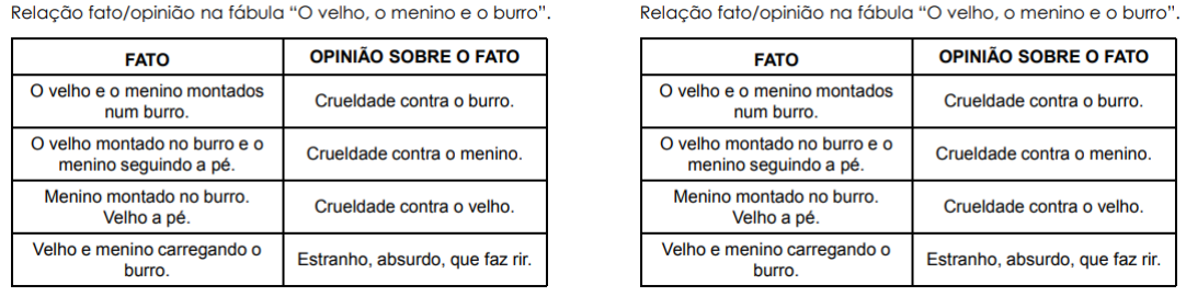 <p>BLOG TUDO SALA DE AULA / ATIV. 01</p><p>SUPORTE DE REFORÇO PEDAGÓGICO – BLOCO 02</p><p>ALUNO (A): ___________________________________</p><p>PROFESSOR (A): ______________________________</p><p>O VELHO, O MENINO E O BURRO</p><p>Um velho e um menino seguiam pela estrada</p><p>montados num burro. Pelo caminho, as pessoas com as quais</p><p>cruzavam diziam:</p><p>– Que crueldade a desses dois! Querem matar o</p><p>burro!</p><p>O velho, impressionadíssimo com os comentários,</p><p>mandou o menino descer. Mais adiante, outras pessoas,</p><p>observando a cena, diziam:</p><p>– Que velho malvado, refestelado no burro, e o</p><p>menino, coitado, andando a pé!</p><p>O velho, então, desceu do burro e mandou o menino</p><p>montar. Daí a pouco, outras pessoas, vendo a cena,</p><p>comentaram:</p><p>– Onde já se viu coisa igual? Um menino cheio de</p><p>vida, montado no burro, e o velho a caminhar pela estrada!</p><p>Depois dessa, o velho não teve dúvidas.</p><p>Mandou o menino descer e ambos, com esforço,</p><p>passaram a carregar o burro. Está claro que os comentários</p><p>não se fizeram demorar, e desta vez seguidos de</p><p>gargalhadas.</p><p>Evidentemente, todo o mundo estranhava os dois</p><p>carregarem o burro.</p><p>1 – Volte ao quadro, escolha um dos fatos do texto e dê</p><p>a sua opinião.</p><p>_____________________________________________</p><p>_____________________________________________</p><p>_____________________________________________</p><p>2 – Envolva, no texto, a expressão que traduz o estado</p><p>do velho, após ouvir os comentários das pessoas sobre</p><p>o fato de o velho e o menino seguirem pela estrada</p><p>montados num burro. O que essa expressão tem a nos</p><p>dizer?</p><p>_____________________________________________</p><p>_____________________________________________</p><p>3 – Risque a palavra que foi utilizada para caracterizar o</p><p>velho: “– Que velho malvado, refestelado no burro, e o</p><p>menino, coitado, andando a pé!”. Esse trecho é um fato</p><p>ou uma opinião? Justifique a sua resposta.</p><p>_____________________________________________</p><p>_____________________________________________</p><p>_____________________________________________</p><p>4 – Qual foi o comportamento do velho ao longo da</p><p>narrativa, diante dos comentários das pessoas?</p><p>_____________________________________________</p><p>_____________________________________________</p><p>5 – O texto transmite um ensinamento ao leitor. Qual?</p><p>_____________________________________________</p><p>_____________________________________________</p><p>6- Você concorda com o que se deseja transmitir?</p><p>Justifique sua resposta.</p><p>_____________________________________________</p><p>_____________________________________________</p><p>BLOG TUDO SALA DE AULA / ATIV. 01</p><p>SUPORTE DE REFORÇO PEDAGÓGICO - BLOCO 02</p><p>ALUNO (A): ___________________________________</p><p>PROFESSOR (A): ______________________________</p><p>O VELHO, O MENINO E O BURRO</p><p>Um velho e um menino seguiam pela estrada</p><p>montados num burro. Pelo caminho, as pessoas com as quais</p><p>cruzavam diziam:</p><p>– Que crueldade a desses dois! Querem matar o</p><p>burro!</p><p>O velho, impressionadíssimo com os comentários,</p><p>mandou o menino descer. Mais adiante, outras pessoas,</p><p>observando a cena, diziam:</p><p>– Que velho malvado, refestelado no burro, e o</p><p>menino, coitado, andando a pé!</p><p>O velho, então, desceu do burro e mandou o menino</p><p>montar. Daí a pouco, outras pessoas, vendo a cena,</p><p>comentaram:</p><p>– Onde já se viu coisa igual? Um menino cheio de</p><p>vida, montado no burro, e o velho a caminhar pela estrada!</p><p>Depois dessa, o velho não teve dúvidas.</p><p>Mandou o menino descer e ambos, com esforço,</p><p>passaram a carregar o burro. Está claro que os comentários</p><p>não se fizeram demorar, e desta vez seguidos de</p><p>gargalhadas.</p><p>Evidentemente, todo o mundo estranhava os dois</p><p>carregarem o burro.</p><p>1 – Volte ao quadro, escolha um dos fatos do texto e dê</p><p>a sua opinião.</p><p>_____________________________________________</p><p>_____________________________________________</p><p>_____________________________________________</p><p>2 – Envolva, no texto, a expressão que traduz o estado</p><p>do velho, após ouvir os comentários das pessoas sobre</p><p>o fato de o velho e o menino seguirem pela estrada</p><p>montados num burro. O que essa expressão tem a nos</p><p>dizer?</p><p>_____________________________________________</p><p>_____________________________________________</p><p>3 – Risque a palavra que foi utilizada para caracterizar o</p><p>velho: “– Que velho malvado, refestelado no burro, e o</p><p>menino, coitado, andando a pé!”. Esse trecho é um fato</p><p>ou uma opinião? Justifique a sua resposta.</p><p>_____________________________________________</p><p>_____________________________________________</p><p>_____________________________________________</p><p>4 – Qual foi o comportamento do velho ao longo da</p><p>narrativa, diante dos comentários das pessoas?</p><p>_____________________________________________</p><p>_____________________________________________</p><p>5 – O texto transmite um ensinamento ao leitor. Qual?</p><p>_____________________________________________</p><p>_____________________________________________</p><p>6- Você concorda com o que se deseja transmitir?</p><p>Justifique sua resposta.</p><p>_____________________________________________</p><p>_____________________________________________</p><p>BLOG TUDO SALA DE AULA / ATIV. 02</p><p>SUPORTE DE REFORÇO PEDAGÓGICO - BLOCO 02</p><p>ALUNO (A): ___________________________________</p><p>PROFESSOR (A): ______________________________</p><p>A MENINA CORAJOSA</p><p>Esta história aconteceu com a minha bisavó paterna,</p><p>e foi contada pela filha dela, que é minha avó. Quando</p><p>cria