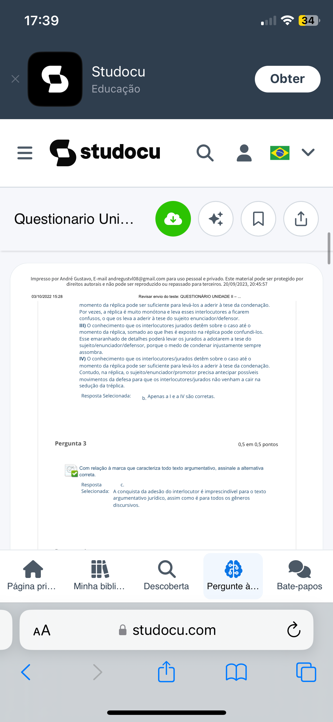 17:39 34 X S Studocu Obter Educação studocu Questionario Uni.. Impresso por André E-mail andregustvl08@gmail.com para uso pessoal e privado. Este material pode ser protegido por direitos autorais e não pode ser reproduzido ou repassado para terceiros. 20/09/2023, 20:45:57 03/10/2022 15:28 Revisar envio do teste: QUESTIONÁRIO UNIDADE II momento da réplica pode ser suficiente para levá-los a aderir à tese da condenação. Por vezes, a réplica é muito e leva esses interlocutores a ficarem confusos, o que os leva a aderir à tese do sujeito III) o conhecimento que os interlocutores jurados detêm sobre o caso até o momento da réplica, somado ao que lhes é exposto na réplica pode confundi-los. Esse emaranhado de detalhes poderá levar os jurados a adotarem a tese do sujeito/enunciador/defensor, porque o medo de condenar injustamente sempre assombra. IV) o conhecimento que os interlocutores/jurados detêm sobre o caso até o momento da réplica pode ser suficiente para levá-los a aderir à tese da condenação. Contudo, na réplica, sujeito/enunciador/promotor precisa antecipar possíveis movimentos da defesa para que os interlocutores/jurados não venham a cain na sedução da tréplica. Resposta Selecionada: b. Apenas a IV são corretas. Pergunta 3 0,5 em 0,5 pontos Com relação à marca que caracteriza todo texto argumentativo, assinale a alternativa correta. Resposta C. Selecionada: A conquista da adesão do interlocutor é imprescindível para o texto argumentativo jurídico, assim como é para todos os gêneros discursivos. Página pri... Minha bibli... Descoberta Pergunte à... Bate-papos AA studocu.com
