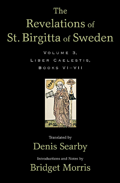 <p>The Revelations of St. Birgitta</p><p>of Sweden</p><p>Volume 3</p><p>FIGURE 1. Birgitta receiving a revelation at Alvastra monastery, possibly depicting Book</p><p>VI 86. Reprinted by permission of the Royal Library Manuscripts Division, National</p><p>Library of Sweden, “Eriksberg MS”, A 70b.fol.5r.</p><p>The Revelations</p><p>of St. Birgitta</p><p>of Sweden</p><p>Volume 3</p><p>Liber Caelestis, Books VI–VII</p><p>TRANSLATED BY DENIS SEARBY</p><p>WITH INTRODUCTIONS AND NOTES</p><p>BY BRIDGET MORRIS</p><p>Oxford University Press, Inc., publishes works that further</p><p>Oxford University’s objective of excellence</p><p>in research, scholarship, and education.</p><p>Oxford New York</p><p>Auckland Cape Town Dar es Salaam Hong Kong Karachi</p><p>Kuala Lumpur Madrid Melbourne Mexico City Nairobi</p><p>New Delhi Shanghai Taipei Toronto</p><p>With offi ces in</p><p>Argentina Austria Brazil Chile Czech Republic France Greece</p><p>Guatemala Hungary Italy Japan Poland Portugal Singapore</p><p>South Korea Switzerland Thailand Turkey Ukraine Vietnam</p><p>Copyright © 2012 by Oxford University Press, Inc.</p><p>Published by Oxford University Press, Inc.</p><p>198 Madison Avenue, New York, New York 10016</p><p>http://www.oup.com</p><p>Oxford is a registered trademark of Oxford University Press</p><p>All rights reserved. No part of this publication may be reproduced,</p><p>stored in a retrieval system, or transmitted, in any form or by any means,</p><p>electronic, mechanical, photocopying, recording, or otherwise,</p><p>without the prior permission of Oxford University Press.</p><p>Library of Congress Cataloging-in-Publication Data</p><p>Bridget, of Sweden, Saint, ca. 1303–1373.</p><p>[Revelationes. English]</p><p>The revelations of St. Birgitta of Sweden/translated by Denis Searby; introductions and notes</p><p>by Bridget Morris.</p><p>p. cm.</p><p>Includes bibliographical references and index.</p><p>ISBN 978-0-19-516644-6 (v.1)</p><p>ISBN 978-0-19-516626-2 (v.2)</p><p>ISBN 978-0-19-516627-9 (v.3)</p><p>1. Private revelations. 2. Visions. I. Searby, Denis Michael. II. Title.</p><p>BX4700.B62E5 2005</p><p>248.2 0 9-dc 22 2005047277</p><p>1 3 5 7 9 8 6 4 2</p><p>Printed in the United States of America</p><p>on acid-free paper</p><p>http://www.oup.com</p><p>Acknowledgments</p><p>Once again, we would like to express our thanks to Stephan</p><p>Borgehammar for his help in bringing this volume to fruition and</p><p>not least with the translation of Book VII. We are grateful also to</p><p>Riksbankens Jubileumsfond (The Bank of Sweden Tercentenary</p><p>Foundation) for its continued fi nancial support, and to Kungl.</p><p>Vitterhets Historie och Antikvitetets Akademien, Stockholm, for its</p><p>administrative support.</p><p>Acknowledgment is due also to Lennart Karlsson, Annette</p><p>Landen, and Lars Berggren who have kindly supplied images and</p><p>given permission to reproduce them.</p><p>The present volume contains Books VI and VII only. Book VII is</p><p>the last of the books in the central canon of the Revelationes , and</p><p>consequently, after careful consideration, we have chosen to refl ect</p><p>the integrity of the original editorial arrangement and to assign Book</p><p>VIII to volume 4, which will now contain all the extraneous materials</p><p>that are attributed to St. Birgitta.</p><p>This page intentionally left blank</p><p>Contents</p><p>Abbreviations, xiii</p><p>The Entire Birgittine Corpus, xv</p><p>BOOK VI</p><p>Introduction, 5</p><p>CHAPTER 1 On Christ’s Physical Beauty, 19</p><p>CHAPTER 2 A Sick Man who Repented on his Deathbed Suffers</p><p>in Purgatory, 19</p><p>CHAPTER 3 A Devil Tempts a Friar; In the Explanation a Witch</p><p>Tempts a Priest, 20</p><p>CHAPTER 4 A Wise Man must Preach Boldly, Suffer Patiently, and</p><p>Deal Justly, 21</p><p>CHAPTER 5 Christ Describes a Place Where the Wicked Torment</p><p>their Brethren, 22</p><p>CHAPTER 6 Birgitta Has Shown Impatience, 23</p><p>CHAPTER 7 On a Deacon Who Must Work For the Conversion Of</p><p>his Brethren, 24</p><p>CHAPTER 8 Some Monks Lived in a Worldly Fashion and Did Not</p><p>Heed Birgitta’s Reproaches, 25</p><p>CHAPTER 9 On an Unrepentant Impious Priest; And on His</p><p>Dreadful Death, 26</p><p>CHAPTER 10 On a Swedish Aristocrat in Purgatory; The Living May</p><p>Still Make Amends on His Behalf, 28</p><p>CHAPTER 11 Everything Fell into Agitation At the Crucifi xion, 32</p><p>viii CONTENTS</p><p>CHAPTER 12 Mary is Like a Beehive, 33</p><p>CHAPTER 13 Three Resolutions, 34</p><p>CHAPTER 14 How Birgitta was Called to Follow Christ in Love, 34</p><p>CHAPTER 15 On the Greed and Ambition of Roman Priests, especially a</p><p>priest of St. Peter’s Church, 36</p><p>CHAPTER 16 A Worldly Woman Undergoes Severe Punishment, 38</p><p>CHAPTER 17 The Devil Wants to Tempt Birgitta; Mary Wants to Protect</p><p>Her, 39</p><p>CHAPTER 18 Consolation Disdained is Like a Drink Thrown in the Giver’s</p><p>Face, 40</p><p>CHAPTER 19 On a Sinful Monk who Follows the Desires of the Flesh, 42</p><p>CHAPTER 20 One of Birgitta’s Kinsmen Must Improve his Lifestyle and</p><p>Contemplate the Lord’s Passion; He is Converted and Dies, 44</p><p>CHAPTER 21 Punishment For a Man in Purgatory is Reduced, 46</p><p>CHAPTER 22 Advice For a Bishop Who Converts, 47</p><p>CHAPTER 23 The Virgin Mary Prays for a Nobleman Described as a</p><p>Robber, 49</p><p>CHAPTER 24 The Same Man Must Atone For his Earlier Offenses, 52</p><p>CHAPTER 25 A Threat To the Same Man, 53</p><p>CHAPTER 26 The King should Work to Rebuild the Church, 54</p><p>CHAPTER 27 The Proud do not Heed God’s Commandments, 55</p><p>CHAPTER 28 A Soul is Described as a Stillborn Child and Condemned, 57</p><p>CHAPTER 29 Birgitta Should Receive the Sacrament of the Eucharist More</p><p>Frequently, 59</p><p>CHAPTER 30 The Will is Like the Roots of a Tree that are Gnawed at By a</p><p>Mole; God is Like a Skillful Gardener; Application of This to a</p><p>Mendicant Prior, 60</p><p>CHAPTER 31