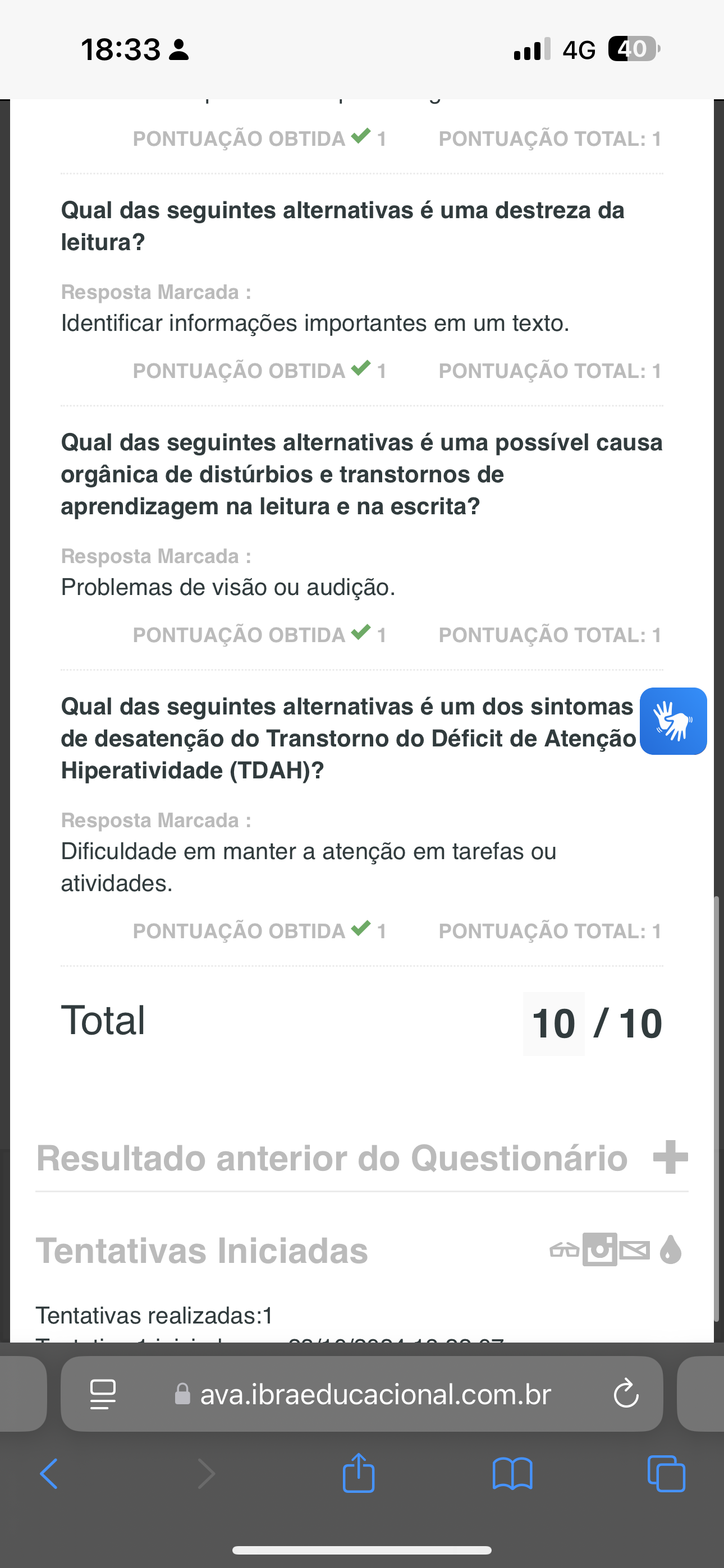 18:33 4G 40 PONTUAÇÃO OBTIDA 1 PONTUAÇÃO TOTAL: 1 Qual das seguintes alternativas é uma destreza da leitura? Resposta Marcada : Identificar informações importantes em um texto. PONTUAÇÃO OBTIDA 1 PONTUAÇÃO TOTAL: 1 Qual das seguintes alternativas é uma possível causa orgânica de distúrbios e transtornos de aprendizagem na leitura e na escrita? Resposta Marcada : Problemas de visão ou audição. PONTUAÇÃO OBTIDA 1 PONTUAÇÃO TOTAL: 1 Qual das seguintes alternativas é um dos sintomas de desatenção do Transtorno do Déficit de Atenção Hiperatividade (TDAH)? Resposta Marcada : Dificuldade em manter a atenção em tarefas ou atividades. PONTUAÇÃO OBTIDA 1 PONTUAÇÃO TOTAL: 1 Total Resultado anterior do Questionário + Tentativas Iniciadas Tentativas realizadas:1 ava.ibraeducacional.com.br