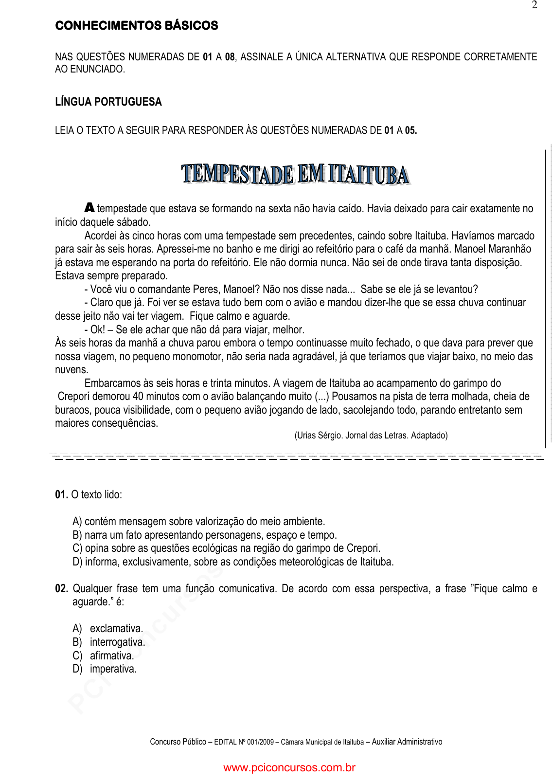 <p>pcimarkpci MDAwMDowMDAwOjAwMDA6MDAwMDowMDAwOmZmZmY6YzkzNzoyZTRm:V2VkLCAyMyBPY3QgMjAyNCAxOTozMToxNyAtMDMwMA==</p><p>www.pciconcursos.com.br</p><p>Concurso Público – EDITAL Nº 001/2009 – Câmara Municipal de Itaituba – Auxiliar Administrativo</p><p>2</p><p>CONHECIMENTOS BÁSICOSCONHECIMENTOS BÁSICOSCONHECIMENTOS BÁSICOSCONHECIMENTOS BÁSICOS</p><p>NAS QUESTÕES NUMERADAS DE 01 A 08, ASSINALE A ÚNICA ALTERNATIVA QUE RESPONDE CORRETAMENTE</p><p>AO ENUNCIADO.</p><p>LÍNGUA PORTUGUESA</p><p>LEIA O TEXTO A SEGUIR PARA RESPONDER ÀS QUESTÕES NUMERADAS DE 01 A 05.</p><p>A tempestade que estava se formando na sexta não havia caído. Havia deixado para cair exatamente no</p><p>início daquele sábado.</p><p>Acordei às cinco horas com uma tempestade sem precedentes, caindo sobre Itaituba. Havíamos marcado</p><p>para sair às seis horas. Apressei-me no banho e me dirigi ao refeitório para o café da manhã. Manoel Maranhão</p><p>já estava me esperando na porta do refeitório. Ele não dormia nunca. Não sei de onde tirava tanta disposição.</p><p>Estava sempre preparado.</p><p>- Você viu o comandante Peres, Manoel? Não nos disse nada... Sabe se ele já se levantou?</p><p>- Claro que já. Foi ver se estava tudo bem com o avião e mandou dizer-lhe que se essa chuva continuar</p><p>desse jeito não vai ter viagem. Fique calmo e aguarde.</p><p>- Ok! – Se ele achar que não dá para viajar, melhor.</p><p>Às seis horas da manhã a chuva parou embora o tempo continuasse muito fechado, o que dava para prever que</p><p>nossa viagem, no pequeno monomotor, não seria nada agradável, já que teríamos que viajar baixo, no meio das</p><p>nuvens.</p><p>Embarcamos às seis horas e trinta minutos. A viagem de Itaituba ao acampamento do garimpo do</p><p>Creporí demorou 40 minutos com o avião balançando muito (...) Pousamos na pista de terra molhada, cheia de</p><p>buracos, pouca visibilidade, com o pequeno avião jogando de lado, sacolejando todo, parando entretanto sem</p><p>maiores consequências.</p><p>(Urias Sérgio. Jornal das Letras. Adaptado)</p><p>01. O texto lido:</p><p>A) contém mensagem sobre valorização do meio ambiente.</p><p>B) narra um fato apresentando personagens, espaço e tempo.</p><p>C) opina sobre as questões ecológicas na região do garimpo de Crepori.</p><p>D) informa, exclusivamente, sobre as condições meteorológicas de Itaituba.</p><p>02. Qualquer frase tem uma função comunicativa. De acordo com essa perspectiva, a frase ”Fique calmo e</p><p>aguarde.” é:</p><p>A) exclamativa.</p><p>B) interrogativa.</p><p>C) afirmativa.</p><p>D) imperativa.</p><p>www.pciconcursos.com.br</p><p>pcimarkpci MDAwMDowMDAwOjAwMDA6MDAwMDowMDAwOmZmZmY6YzkzNzoyZTRm:V2VkLCAyMyBPY3QgMjAyNCAxOTozMToxNyAtMDMwMA==</p><p>www.pciconcursos.com.br</p><p>Concurso Público – EDITAL Nº 001/2009 – Câmara Municipal de Itaituba – Auxiliar Administrativo</p><p>3</p><p>03. Em “... se essa chuva continuar desse jeito não vai ter viagem” o SE tem a função sintática de:</p><p>A) conclusão.</p><p>B) comparação.</p><p>C) condição.</p><p>D) tempo.</p><p>04. A expressão grifada em “... nossa viagem, no pequeno monomotor, não seria nada agradável, já que</p><p>teríamos que viajar baixo ...” pode ser substituída, sem prejuízo para o sentido da frase, por:</p><p>A) pois.</p><p>B) embora.</p><p>C) como.</p><p>D) mas.</p><p>05. A respeito de elementos linguísticos do texto, assinale a única informação correta.</p><p>A) Em “Você viu o comandante Peres, Manoel?”, a vírgula ocorre para separar um aposto.</p><p>B) Em “Não nos disse nada”, o pronome pessoal antecipa o verbo porque a frase é negativa.</p><p>C) Em “refeitório” e “consequências”, há acento gráfico obrigatório porque são proparoxítonas.</p><p>D) Em “A tempestade (...) não havia caído”, o verbo está no singular porque tem o sentido de existir.</p><p>NOÇÕES DE INFORMÁTICA</p><p>06. Utilizando-se o sistema operacional Windows, é correto afirmar:</p><p>A) O Excel é um software de processamento de texto que não possui capacidade de desenvolver fórmulas</p><p>matemáticas.</p><p>B) Um ícone de atalho consiste em um software capaz de desenvolver apresentações gráficas e textuais.</p><p>C) O software Power Point é indicado para desenvolver fórmulas e expressões matemáticas.</p><p>D) Os arquivos são utilizados para armazenar dados e podem ser criados em pastas para melhor organizar</p><p>o disco rígido.</p><p>07. O botão “Novo” presente na barra de ferramentas “Padrão” do aplicativo Editor de Texto do Open Office</p><p>permite abrir um arquivo novo ...</p><p>A) dos aplicativos Editor de Texto, Planilha, Desenho e Fórmula, apenas.</p><p>B) de qualquer aplicativos do Open Office.</p><p>C) do aplicativo Editor de Texto, apenas.</p><p>D) dos aplicativos Editor de Texto e Editor de Fórmulas, apenas.</p><p>08. Analise e marque a alternativa correta:</p><p>A) A finalidade de um backup é manter cópia de arquivo em local seguro para possibilitar a sua recuperação</p><p>caso o arquivo original venha a ser perdido.</p><p>B) Um E-mail indesejável, enviado com a finalidade de propaganda e sem a devida autorização do receptor,</p><p>pode ser classificado de Hacker.</p><p>C) O backup de um disco rígido é utilizado para eliminar todos os arquivos desse disco, liberando espaço</p><p>físico para o armazenamento de novos arquivos.</p><p>D) O sistema operacional Linux possui a funcionalidade denominada de format que é executada quando o</p><p>usuário deseja uma cópia de segurança dos seus arquivos.</p><p>www.pciconcursos.com.br</p><p>pcimarkpci MDAwMDowMDAwOjAwMDA6MDAwMDowMDAwOmZmZmY6YzkzNzoyZTRm:V2VkLCAyMyBPY3QgMjAyNCAxOTozMToxNyAtMDMwMA==</p><p>www.pciconcursos.com.br</p><p>Concurso Público – EDITAL Nº 001/2009 – Câmara Municipal de Itaituba – Auxiliar Administrativo</p><p>4</p><p>CONHECIMENTOSCONHECIMENTOSCONHECIMENTOSCONHECIMENTOS ESPECÍFICOS ESPE