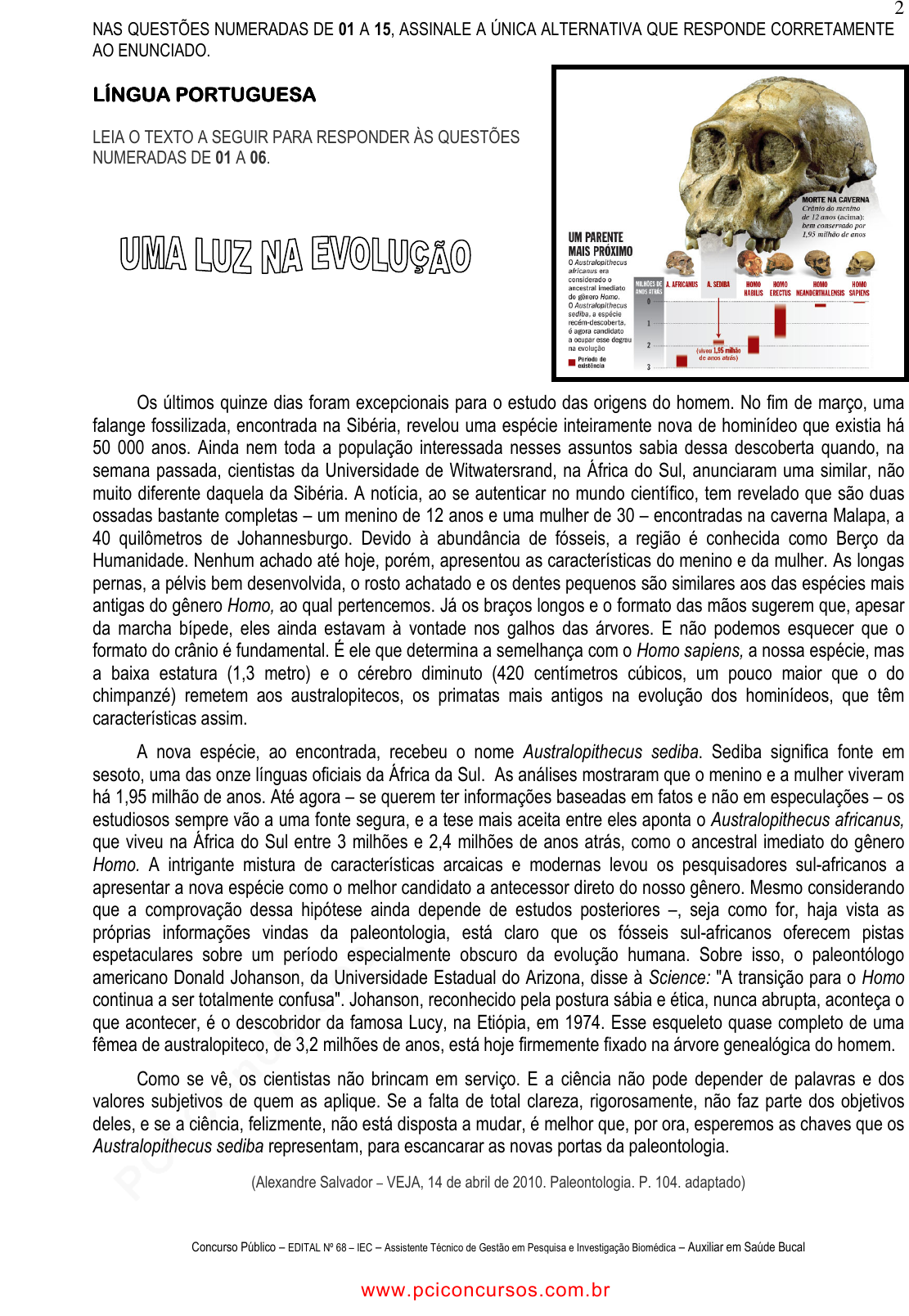 <p>Pesquisa e Investigação Biomédica – Auxiliar em Saúde Bucal</p><p>4</p><p>05. Entre os elementos coesivos em destaque e os referentes indicados nos itens a seguir, ocorre relação de</p><p>equivalência, no nível do texto, em:</p><p>1. “... não muito diferente daquela da Sibéria.” = “... população interessada ...”</p><p>2. “... eles ainda estavam à vontade nos galhos das árvores.” = “... os braços longos e o formato das mãos ...”.</p><p>3. “... mais antigos na evolução dos hominídeos, que têm características assim.” = “... a baixa estatura (1,3</p><p>metro) e o cérebro diminuto (420 centímetros cúbicos, um pouco maior que o do chimpanzé)..”.</p><p>4. “Sobre isso, o paleontólogo americano Donald Johanson ...” = “... um período especialmente obscuro da</p><p>evolução humana.”.</p><p>O correto está em:</p><p>A) 1, 2 e 3, apenas.</p><p>B) 1 e 2, apenas.</p><p>C) 3 e 4, apenas.</p><p>D) 1, 2, 3 e 4.</p><p>06. Avalie a afirmativas a respeito dos elementos que constituem o texto:</p><p>1. Em: “... A nova espécie, ao encontrada, recebeu ...”; o elo coesivo em destaque estabelece,coerentemente,</p><p>uma relação de tempo. Pode ser substituído por quando, sem prejuízo para o sentido da frase.</p><p>2. Em: “... reconhecido pela postura sábia e ética, nunca abrupta, aconteça o que acontecer ...”; a expressão</p><p>em destaque caracteriza orações justapostas de valor adverbial concessivo.</p><p>3. Em: “Até agora – se querem ter informações baseadas em fatos e não em especulações ...”; há uma</p><p>relação de condição entre a oração em destaque e as informações referidas posteriormente.</p><p>4. Em: “Se a falta de total clareza, rigorosamente, não faz parte dos objetivos deles, e se a ciência, felizmente,</p><p>não está disposta a mudar, é melhor que, por ora, esperemos as chaves que os Australopithecus sediba</p><p>representam, para escancarar as novas portas da paleontologia.”; o termo em destaque estabelece uma</p><p>situação hipotética e inicia uma oração que exprime uma consequência do que se declara na oração</p><p>principal.</p><p>O correto está em:</p><p>A) 1, 2 e 3, apenas.</p><p>B) 1 e 2, apenas.</p><p>C) 3 e 4, apenas.</p><p>D) 1, 2, 3 e 4.</p><p>www.pciconcursos.com.br</p><p>pcimarkpci MDAwMDowMDAwOjAwMDA6MDAwMDowMDAwOmZmZmY6YzkzNzoyZTRm:V2VkLCAyMyBPY3QgMjAyNCAxOTozMjozMCAtMDMwMA==</p><p>www.pciconcursos.com.br</p><p>Concurso Público – EDITAL Nº 68 – IEC – Assistente Técnico de Gestão em Pesquisa e Investigação Biomédica – Auxiliar em Saúde Bucal</p><p>5</p><p>MATEMÁTICAMATEMÁTICAMATEMÁTICAMATEMÁTICA</p><p>07. Uma torneira A enche um tanque em 2 horas e a torneira B em 3 horas. Abre-se a torneira A para</p><p>abastecer o tanque e esta, por problemas técnicos, só o abastece durante 45 minutos. Para que o tanque fique</p><p>completamente cheio, a torneira B necessitará de</p><p>A) 1 h 30 min 40 s.</p><p>B) 1 h 48 min.</p><p>C) 1 h 52 min 30 s.</p><p>D) 2 h 05 min.</p><p>08. A proliferação do número de bactérias de uma cultura é observada pela expressão ta.b)t(f ==== , cujo gráfico</p><p>se encontra ao lado. Nestas condições, o número de bactérias após 3 horas de observação será de</p><p>A) 160 000.</p><p>B) 150 000.</p><p>C) 120 000.</p><p>D) 108 000.</p><p>09. Num restaurante, a média das despesas de uma turma de jovens presentes foi de R$ 29,00, sendo que a</p><p>média gasta pelos rapazes foi de R$ 33,00 a média gasta pelas moças foi de R$ 23,00. Nestas condições, se R</p><p>é o número de rapazes e M é o número de moças, podemos afirmar que</p><p>A) R = 2M.</p><p>B) 2R = 3M.</p><p>C) R = 3M.</p><p>D) 2R = 5M.</p><p>10. Para assistir aos jogos da copa 2010, os proprietários das casas de um condomínio resolveram comprar um</p><p>telão, no valor de R$ 8.100,00, onde todos contribuiriam com quantias iguais. No momento da compra, 7</p><p>proprietários alegando dificuldades financeiras, desistiram da coleta, acarretando desta forma uma aumento de</p><p>R$ 126,00 na quota dos demais. Sendo assim, se todos os proprietários tivessem participado da coleta, caberia</p><p>a cada um a quantia de</p><p>A) R$ 270,00.</p><p>B) R$ 300,00.</p><p>C) R$ 324,00.</p><p>D) R$ 337,50.</p><p>11. No triângulo ao lado cabe a relação</p><p>A) b = a.cos(A) + c.cos(C).</p><p>B) a = b.cos(C) + c.cos(B).</p><p>C) c = a.sen(A) + b.sen(B).</p><p>D) b = a.sen(C) + c.sen(A).</p><p>www.pciconcursos.com.br</p><p>pcimarkpci MDAwMDowMDAwOjAwMDA6MDAwMDowMDAwOmZmZmY6YzkzNzoyZTRm:V2VkLCAyMyBPY3QgMjAyNCAxOTozMjozMCAtMDMwMA==</p><p>www.pciconcursos.com.br</p><p>Concurso Público – EDITAL Nº 68 – IEC – Assistente Técnico de Gestão em Pesquisa e Investigação Biomédica – Auxiliar em Saúde Bucal</p><p>6</p><p>INFORMÁTICAINFORMÁTICAINFORMÁTICAINFORMÁTICA</p><p>12. O manuseio de tabelas é uma das facilidades oferecidas pelo editor de textos Microsoft Word, versão 2003.</p><p>Sobre o processo de criação e manuseio de tabelas, é correto afirmar:</p><p>A) uma tabela pode ser classificada em ordem alfabética crescente de uma de suas colunas, bastando para</p><p>isso, selecionar a coluna escolhida para a classificação, e no menu “Tabela”, utilizar a opção “Converter</p><p>tabela”.</p><p>B) é possível a divisão de uma tabela em três tabelas, por meio da opção “Dividir tabela”, que consta no menu</p><p>“Tabela”, e com a informação do parâmetro 3(três), que indica em quantas partes se deseja dividir a tabela</p><p>original.</p><p>C) a opção “AutoFormatação de tabela”, que consta no menu “Tabela”, permite que sejam criados outros tipos</p><p>de formatação de tabelas, além dos tipos padrões oferecidos.</p><p>D) a opção “AutoAjuste”, que consta no menu “Tabela”, permite estabelecer o tipo e tamanho das letras do</p><p>conteúdo e cabeçalho da tabela.</p><p>13. Marque a alternativa que apresent