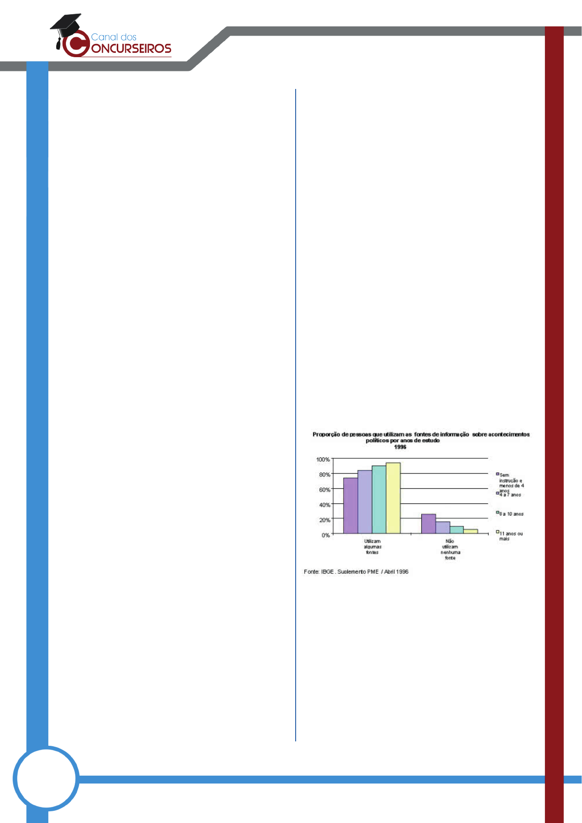 <p>74</p><p>tas com os elementos que formam uma coleção.</p><p>São elas: união, intersecção e diferença.</p><p>Lembre-se que na matemática os conjuntos rep-</p><p>resentam a reunião de diversos objetos. Quando</p><p>os elementos que formam o conjunto são númer-</p><p>os, são chamados de conjuntos numéricos.</p><p>Os conjuntos numéricos são:</p><p>Números Naturais (N)</p><p>Números Inteiros (Z)</p><p>Números Racionais (Q)</p><p>Números Irracionais (I)</p><p>Números Reais (R)</p><p>Conjunto Complementar</p><p>Dado um conjunto A, podemos encontrar o con-</p><p>junto complementar de A que é determinado pe-</p><p>los elementos de um conjunto universo que não</p><p>pertençam a A.</p><p>Este conjunto pode ser representado por AC ou</p><p>CA</p><p>U ou Ā</p><p>Quando temos um conjunto B, tal que B está con-</p><p>tido em A (B ⊂ A), a diferença A - B é igual ao</p><p>complemento de B.</p><p>Exemplo:</p><p>Dados os conjuntos A= {a, b, c, d, e, f} e B = {d, e,</p><p>f, g, h}, indique o conjunto diferença entre eles.</p><p>Para encontrar a diferença, primeiro devemos</p><p>identificar quais elementos pertencem ao con-</p><p>junto A e que também aparecem ao conjunto B.</p><p>No exemplo, identificamos que os elementos d, e</p><p>e f pertencem a ambos os conjuntos. Assim, va-</p><p>mos retirar esses elementos do resultado. Logo, o</p><p>conjunto diferença de A menos B sera dado por:</p><p>A – B = {a, b, c}</p><p>2.4 - Análise gráfica</p><p>Gráficos são representações visuais utilizadas</p><p>para exibir dados, sejam eles, sobre determinada</p><p>informação, ou valores numéricos.</p><p>Geralmente, são utilizados para demostrar pa-</p><p>drões, tendências e ainda, comparar informações</p><p>qualitativas e quantitativas num determinado es-</p><p>paço de tempo.</p><p>São ferramentas utilizadas em diversas áreas</p><p>de estudo (matemática, estatística, geografia,</p><p>economia, história, etc.) para facilitar a visual-</p><p>ização de alguns dados, bem como para tornar os</p><p>dados mais claros e informativos.</p><p>Dessa forma, o uso de gráficos torna a interpre-</p><p>tação e/ou análise mais rápida e objetiva.</p><p>Elementos dos Gráficos</p><p>Alguns elementos importantes que estão incluí-</p><p>dos nos gráficos são:</p><p>Título: geralmente possuem um título a respeito</p><p>da informação que será apresentada.</p><p>Fonte: muitos gráficos, sobretudo os da área de</p><p>estatística, apresentam a fonte, ou seja, de onde</p><p>as informações foram retiradas. Também podem</p><p>apresentar o ano de publicação da fonte referida.</p><p>2.3 - Análise gráfica</p>