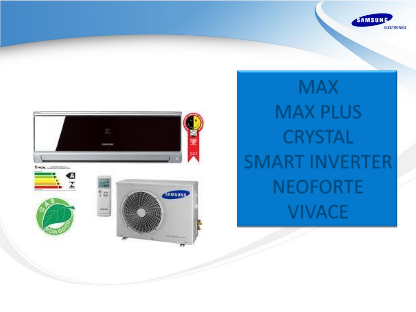 <p>1</p><p>Manual de Treinamento</p><p>MAX</p><p>MAX PLUS</p><p>CRYSTAL</p><p>SMART INVERTER</p><p>NEOFORTE</p><p>VIVACE</p><p>Condicionadores de Ar (SPLIT)</p><p>Ricardo Nunes</p><p>Fevereiro/2012</p><p>2</p><p>Índice</p><p> Introdução ao Curso</p><p> Apresentação dos Produtos (Características Técnicas)</p><p> Estrutura dos Códigos dos Produtos</p><p> Vista Explodida</p><p> Diagrama de Conexões</p><p> Ciclo Básico de Refrigeração</p><p> Desmontagem/Montagem dos Produtos</p><p> Tecnologia Inverter (Características/Vantagens/Circuitos)</p><p> Modos de Teste</p><p> Códigos de Erro</p><p> Configuração através do Controle Remoto</p><p> Solução de Problemas (Convencional)</p><p> Solução de Problemas (Inverter)</p><p> Ferramentas, Instrumentos e Insumos necessários para Instalação</p><p>3</p><p>Índice (cont.)</p><p> Cálculo de Carga Térmica</p><p> Melhor Local para Instalação: Evaporadora e Condensadora</p><p> Instalação de Dreno</p><p> Instrumentos de Medição: Técnicas de Utilização</p><p> Interligação Elétrica entre as Unidades Interna e Externa</p><p> Conexão da Tubulação: Alta e Baixa Pressão</p><p> Isolamento Térmico da Tubulação</p><p> Pressurização com Nitrogênio e Testes de Vazamento</p><p> Desidratação (Vácuo)</p><p> Como adicionar fluído refrigerante R22/R410A</p><p> Reoperação dos Produtos</p><p> Cálculo de Rendimento</p><p> Procedimentos de Segurança</p><p> Encerramento do Curso</p><p>4</p><p>MAX CRYSTAL</p><p>VIVACE</p><p>SMART - INVERTER</p><p>Apresentação dos Produtos</p><p>MAX – plus</p><p>NEO FORTE</p><p>5</p><p>Características Técnicas:</p><p> Capacidade:</p><p> Frio: 9000/12000/18000/24000 BTU/h</p><p> Quente/Frio: 9000/12000/18000/24000 BTU/h</p><p> Modo Good Sleep Mode</p><p> Samsung Smart Saver</p><p> Filtro de Ar</p><p>Fluído Refrigerante: R22</p><p> Compressor Rotativo</p><p> Alimentação: 220V/60Hz</p><p> Revestimento Condensadora: Blue Fin</p><p> Para maiores informações acesse: www.samsung.com.br</p><p>Apresentação dos Produtos (Características Técnicas)</p><p>MAX</p><p>http://www.samsung.com.br/</p><p>6</p><p>Características Técnicas:</p><p> Capacidade:</p><p> Frio: 9000/12000/18000/24000 BTU/h</p><p> Quente/Frio: 9000/12000/18000/24000 BTU/h</p><p> Modo Good Sleep Mode</p><p> Samsung Smart Saver</p><p> MPI: Micro Plasma Ion</p><p> Filtro Catechin</p><p> Filtro Desodorizador</p><p>Fluído Refrigerante: R22</p><p> Compressor Rotativo</p><p> Alimentação: 220V/60Hz</p><p> Revestimento Condensadora: Blue Fin</p><p>Apresentação dos Produtos (Características Técnicas)</p><p>CRYSTAL</p><p>7</p><p>Características Técnicas:</p><p> Capacidade:</p><p> Quente/Frio: 9000/12000/18000/24000 BTU/h</p><p> Modo Good Sleep Mode</p><p> Samsung Smart Saver</p><p> Evaporador Silver Nano</p><p> Filtro Desodorizador</p><p>Fluído Refrigerante: R410A</p><p> Compressor Rotativo (SCROLL)</p><p> S Inverter</p><p> Alimentação: 220V/60Hz</p><p> Revestimento Condensadora: Green Fin</p><p>Apresentação dos Produtos (Características Técnicas)</p><p>NEO FORTE</p><p>8</p><p>Características Técnicas:</p><p> Capacidade:</p><p> Quente/Frio: 9000/12000/18000 BTU/h</p><p> Modo Good Sleep Mode</p><p> MPI: Micro Plasma Ion</p><p> Samsung Smart Saver</p><p> Evaporador Silver Nano</p><p> Filtro Catechin</p><p> Filtro Desodorizador</p><p> Filtro Purificador</p><p>Fluído Refrigerante: R410A</p><p> Compressor Rotativo (SCROLL)</p><p> S Inverter</p><p> Alimentação: 220V/60Hz</p><p> Revestimento Condensadora: Green Fin</p><p>Apresentação dos Produtos (Características Técnicas)</p><p>VIVACE</p><p>9</p><p>Apresentação dos Produtos (Características Técnicas)</p><p>MAX Plus</p><p>9K/ 12K/ 18K/ 24k Btus</p><p>Frio / Quente-Frio</p><p>9k e 12k - Frio</p><p>9k - Quente / Frio</p><p>com gabinete plástico.</p><p>10</p><p>Apresentação dos Produtos (Características Técnicas)</p><p>Smart Inverter</p><p>9K/ 12K/ 18K/ 24k Btus</p><p>Frio / Quente-Frio</p><p>Good Sleep</p><p>A melhor temperatura para um sono profundo</p><p>Cooling Mode • Estágio de queda de temperatura</p><p>Facilita o sono pela queda de temperatura</p><p>• Estágio do sono</p><p>Relaxa o seu corpo e aumenta a temperatura gradativamente</p><p>• Estágio “acordar”</p><p>Permite que você acorde com um ar mais confortável e faz com</p><p>que se sinta mais disposto.</p><p>0 1 2 3 4 5 6 7 8</p><p>Tempo</p><p>(hr)</p><p>1℃ Set</p><p>Temp</p><p>-1℃</p><p>-2℃</p><p>2℃</p><p>3℃</p><p>Temp.</p><p>Se o tempo selecionado for maior</p><p>que 8h esta seção será repetida.</p><p>Filtro Full HD</p><p>Qualidade de filtragem superior</p><p>• Menor espessura dos</p><p>filamentos e maior densidade</p><p>de filamentos por cm2.</p><p>• Maior retenção de partículas</p><p>sem perda de vazão de ar.</p><p>Retenção de Partículas 80%</p><p>Air</p><p>Poeira</p><p>Full HD</p><p>Filter</p><p>Air</p><p>Poeira</p><p>Ar</p><p>Poeira</p><p>Filtro Comum</p><p>Ar</p><p>Poeira</p><p>Retenção de Partículas 40%</p><p>• Filtros de alta densidade, são mais eficientes na</p><p>retenção de partículas sólidas, além de serem</p><p>confeccionados com material bactericida.</p><p>• Os filtros são reutilizáveis, bastando lavá-los em água</p><p>corrente para mantê-los sempre limpos.</p><p>Full HD 60 Full HD 80</p><p>×40</p><p>×150</p><p>Ø Filamento (㎛)</p><p>211 134 69</p><p>916 549 298</p><p>100% -60% -33%</p><p>Retenção de</p><p>Poeira 40% 60% 80%</p><p>Feature</p><p>Comum</p><p>Full HD Filter</p><p>Distância entre</p><p>Filamentos (㎛)</p><p>Revestimento Anti-Bacteria</p><p>Auto Cleaning</p><p>Modo Autolimpante</p><p>Quando o ar-condicionado está desligado, é mantido o</p><p>funcionamento do ventilador para a secagem interna</p><p>para a proteção contra bactérias e crescimento de mofo.</p><p>A diferença de temperatura interna e</p><p>externa causa umidade</p><p>na serpentina.</p><p>Quando o aparelho é desligado, ele</p><p>acumula a umidad