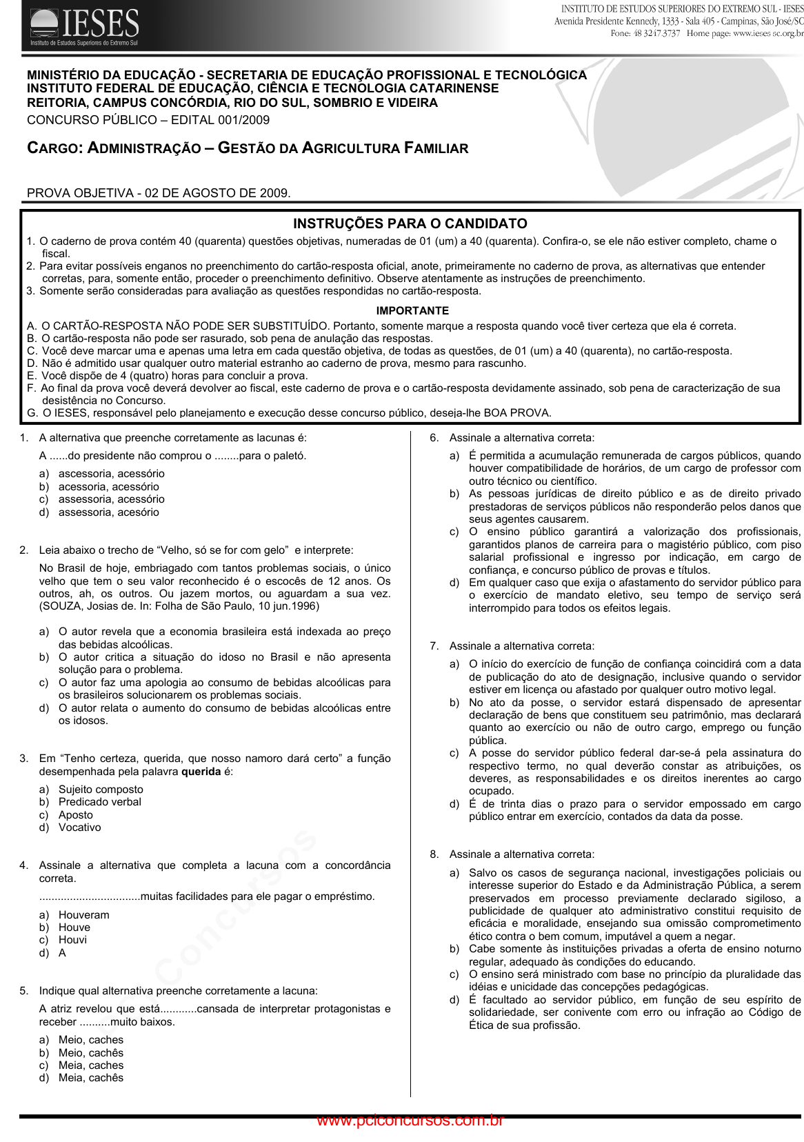 <p>pcimarkpci MDAwMDowMDAwOjAwMDA6MDAwMDowMDAwOmZmZmY6OTU0ZTpiYjZm:V2VkLCAyMyBPY3QgMjAyNCAyMToxNjo1NSAtMDMwMA==</p><p>www.pciconcursos.com.br</p><p>MINISTÉRIO DA EDUCAÇÃO - SECRETARIA DE EDUCAÇÃO PROFISSIONAL E TECNOLÓGICA</p><p>INSTITUTO FEDERAL DE EDUCAÇÃO, CIÊNCIA E TECNOLOGIA CATARINENSE</p><p>REITORIA, CAMPUS CONCÓRDIA, RIO DO SUL, SOMBRIO E VIDEIRA</p><p>CONCURSO PÚBLICO – EDITAL 001/2009</p><p>CARGO: ADMINISTRAÇÃO – GESTÃO DA AGRICULTURA FAMILIAR</p><p>PROVA OBJETIVA - 02 DE AGOSTO DE 2009.</p><p>INSTRUÇÕES PARA O CANDIDATO</p><p>1. O caderno de prova contém 40 (quarenta) questões objetivas, numeradas de 01 (um) a 40 (quarenta). Confira-o, se ele não estiver completo, chame o</p><p>fiscal.</p><p>2. Para evitar possíveis enganos no preenchimento do cartão-resposta oficial, anote, primeiramente no caderno de prova, as alternativas que entender</p><p>corretas, para, somente então, proceder o preenchimento definitivo. Observe atentamente as instruções de preenchimento.</p><p>3. Somente serão consideradas para avaliação as questões respondidas no cartão-resposta.</p><p>IMPORTANTE</p><p>A. O CARTÃO-RESPOSTA NÃO PODE SER SUBSTITUÍDO. Portanto, somente marque a resposta quando você tiver certeza que ela é correta.</p><p>B. O cartão-resposta não pode ser rasurado, sob pena de anulação das respostas.</p><p>C. Você deve marcar uma e apenas uma letra em cada questão objetiva, de todas as questões, de 01 (um) a 40 (quarenta), no cartão-resposta.</p><p>D. Não é admitido usar qualquer outro material estranho ao caderno de prova, mesmo para rascunho.</p><p>E. Você dispõe de 4 (quatro) horas para concluir a prova.</p><p>F. Ao final da prova você deverá devolver ao fiscal, este caderno de prova e o cartão-resposta devidamente assinado, sob pena de caracterização de sua</p><p>desistência no Concurso.</p><p>G. O IESES, responsável pelo planejamento e execução desse concurso público, deseja-lhe BOA PROVA.</p><p>1. A alternativa que preenche corretamente as lacunas é:</p><p>A ......do presidente não comprou o ........para o paletó.</p><p>a) ascessoria, acessório</p><p>b) acessoria, acessório</p><p>c) assessoria, acessório</p><p>d) assessoria, acesório</p><p>2. Leia abaixo o trecho de “Velho, só se for com gelo” e interprete:</p><p>No Brasil de hoje, embriagado com tantos problemas sociais, o único</p><p>velho que tem o seu valor reconhecido é o escocês de 12 anos. Os</p><p>outros, ah, os outros. Ou jazem mortos, ou aguardam a sua vez.</p><p>(SOUZA, Josias de. In: Folha de São Paulo, 10 jun.1996)</p><p>a) O autor revela que a economia brasileira está indexada ao preço</p><p>das bebidas alcoólicas.</p><p>b) O autor critica a situação do idoso no Brasil e não apresenta</p><p>solução para o problema.</p><p>c) O autor faz uma apologia ao consumo de bebidas alcoólicas para</p><p>os brasileiros solucionarem os problemas sociais.</p><p>d) O autor relata o aumento do consumo de bebidas alcoólicas entre</p><p>os idosos.</p><p>3. Em “Tenho certeza, querida, que nosso namoro dará certo” a função</p><p>desempenhada pela palavra querida é:</p><p>a) Sujeito composto</p><p>b) Predicado verbal</p><p>c) Aposto</p><p>d) Vocativo</p><p>4. Assinale a alternativa que completa a lacuna com a concordância</p><p>correta.</p><p>.................................muitas facilidades para ele pagar o empréstimo.</p><p>a) Houveram</p><p>b) Houve</p><p>c) Houvi</p><p>d) A</p><p>5. Indique qual alternativa preenche corretamente a lacuna:</p><p>A atriz revelou que está............cansada de interpretar protagonistas e</p><p>receber ..........muito baixos.</p><p>a) Meio, caches</p><p>b) Meio, cachês</p><p>c) Meia, caches</p><p>d) Meia, cachês</p><p>6. Assinale a alternativa correta:</p><p>a) É permitida a acumulação remunerada de cargos públicos, quando</p><p>houver compatibilidade de horários, de um cargo de professor com</p><p>outro técnico ou científico.</p><p>b) As pessoas jurídicas de direito público e as de direito privado</p><p>prestadoras de serviços públicos não responderão pelos danos que</p><p>seus agentes causarem.</p><p>c) O ensino público garantirá a valorização dos profissionais,</p><p>garantidos planos de carreira para o magistério público, com piso</p><p>salarial profissional e ingresso por indicação, em cargo de</p><p>confiança, e concurso público de provas e títulos.</p><p>d) Em qualquer caso que exija o afastamento do servidor público para</p><p>o exercício de mandato eletivo, seu tempo de serviço será</p><p>interrompido para todos os efeitos legais.</p><p>7. Assinale a alternativa correta:</p><p>a) O início do exercício de função de confiança coincidirá com a data</p><p>de publicação do ato de designação, inclusive quando o servidor</p><p>estiver em licença ou afastado por qualquer outro motivo legal.</p><p>b) No ato da posse, o servidor estará dispensado de apresentar</p><p>declaração de bens que constituem seu patrimônio, mas declarará</p><p>quanto ao exercício ou não de outro cargo, emprego ou função</p><p>pública.</p><p>c) A posse do servidor público federal dar-se-á pela assinatura do</p><p>respectivo termo, no qual deverão constar as atribuições, os</p><p>deveres, as responsabilidades e os direitos inerentes ao cargo</p><p>ocupado.</p><p>d) É de trinta dias o prazo para o servidor empossado em cargo</p><p>público entrar em exercício, contados da data da posse.</p><p>8. Assinale a alternativa correta:</p><p>a) Salvo os casos de segurança nacional, investigações policiais ou</p><p>interesse superior do Estado e da Administração Pública, a serem</p><p>preservados em processo previamente declarado sigiloso, a</p><p>publicidade de qualquer ato administrativo constitui requisito de</p><p>eficácia e moralidade, ensejando sua omissão comprometimento</p><p>ético contra o bem comum, imputável a quem a negar.</p><p>b) Cabe somente às instituições privadas 