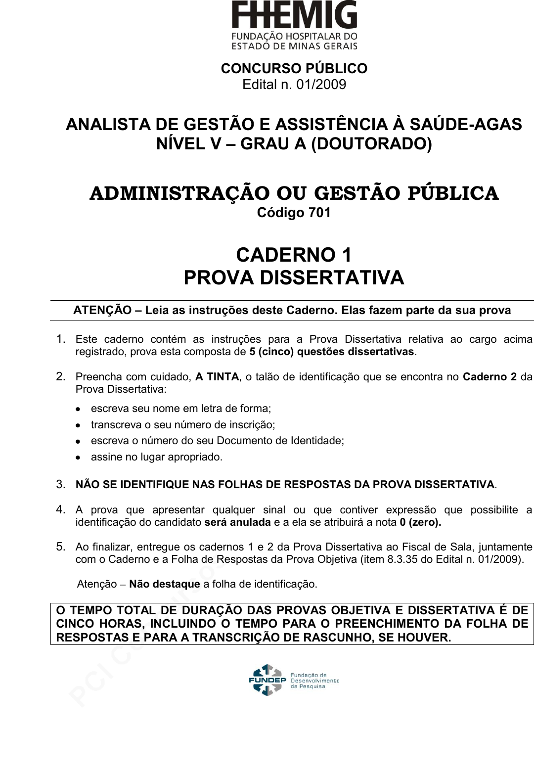 <p>pcimarkpci MDAwMDowMDAwOjAwMDA6MDAwMDowMDAwOmZmZmY6OTU0ZTpiYjZm:V2VkLCAyMyBPY3QgMjAyNCAyMToxODozMCAtMDMwMA==</p><p>www.pciconcursos.com.br</p><p>CONCURSO PÚBLICO</p><p>Edital n. 01/2009</p><p>ANALISTA DE GESTÃO E ASSISTÊNCIA À SAÚDE-AGAS</p><p>NÍVEL V – GRAU A (DOUTORADO)</p><p>ADMINISTRAÇÃO OU GESTÃO PÚBLICA</p><p>Código 701</p><p>CADERNO 1</p><p>PROVA DISSERTATIVA</p><p>ATENÇÃO – Leia as instruções deste Caderno. Elas fazem parte da sua prova</p><p>1. Este caderno contém as instruções para a Prova Dissertativa relativa ao cargo acima</p><p>registrado, prova esta composta de 5 (cinco) questões dissertativas.</p><p>2. Preencha com cuidado, A TINTA, o talão de identificação que se encontra no Caderno 2 da</p><p>Prova Dissertativa:</p><p>escreva seu nome em letra de forma;</p><p>transcreva o seu número de inscrição;</p><p>escreva o número do seu Documento de Identidade;</p><p>assine no lugar apropriado.</p><p>3. NÃO SE IDENTIFIQUE NAS FOLHAS DE RESPOSTAS DA PROVA DISSERTATIVA.</p><p>4. A prova que apresentar qualquer sinal ou que contiver expressão que possibilite a</p><p>identificação do candidato será anulada e a ela se atribuirá a nota 0 (zero).</p><p>5. Ao finalizar, entregue os cadernos 1 e 2 da Prova Dissertativa ao Fiscal de Sala, juntamente</p><p>com o Caderno e a Folha de Respostas da Prova Objetiva (item 8.3.35 do Edital n. 01/2009).</p><p>Atenção Não destaque a folha de identificação.</p><p>O TEMPO TOTAL DE DURAÇÃO DAS PROVAS OBJETIVA E DISSERTATIVA É DE</p><p>CINCO HORAS, INCLUINDO O TEMPO PARA O PREENCHIMENTO DA FOLHA DE</p><p>RESPOSTAS E PARA A TRANSCRIÇÃO DE RASCUNHO, SE HOUVER.</p><p>pcimarkpci MDAwMDowMDAwOjAwMDA6MDAwMDowMDAwOmZmZmY6OTU0ZTpiYjZm:V2VkLCAyMyBPY3QgMjAyNCAyMToxODozMCAtMDMwMA==</p><p>www.pciconcursos.com.br</p><p>2</p><p>ORIENTAÇÕES GERAIS</p><p>1. Nos termos do subitem 8.3.34 do Edital, as instruções constantes nos Cadernos de</p><p>Questões das Provas Objetiva e Dissertativa, na Folha de Respostas e no Caderno de</p><p>Resposta da Prova Dissertativa complementam o Edital e deverão ser rigorosamente</p><p>observadas e seguidas pelo candidato.</p><p>2. A versão definitiva da resposta (ou a sua transcrição, caso tenha sido feita</p><p>em rascunho) deverá ser registrada no espaço próprio do Caderno 2 que</p><p>contém a folha de identificação.</p><p>3. Nos termos do subitem 8.3.31 do Edital, somente serão permitidos assinalamentos na</p><p>Folha de Respostas feitos com caneta esferográfica de tinta azul ou preta, vedada</p><p>qualquer colaboração ou participação de terceiros, respeitadas as condições</p><p>solicitadas e concedidas a portadores de necessidades especiais.</p><p>4. Nos termos do subitem 8.3.38 do Edital, serão considerados nulos a Folha de</p><p>Respostas da Prova Objetiva e o Caderno de Respostas da Prova Dissertativa que</p><p>estiverem marcados ou escritos, respectivamente, a lápis, bem como com qualquer</p><p>forma de identificação do candidato fora do lugar especificamente indicado para tal</p><p>finalidade.</p><p>5. Nos termos do item E.6 do Anexo E do Edital, recomenda-se evitar rasuras, não</p><p>sendo permitido o uso de corretivos.</p><p>6. Nos termos do item E.5 do Anexo E do Edital, o candidato que não obedecer aos</p><p>limites de números de linhas solicitados nas provas abertas será apenado de acordo</p><p>com os seguintes critérios:</p><p>[...];</p><p>desconto de 0,5 (meio) ponto por linha que exceda o máximo estipulado.</p><p>7. O valor total desta prova é de 30 (trinta) pontos. (Edital, subitem 8.2.3, alínea</p><p>“b”)</p><p>8. Nos termos do item E.1 do Anexo E do Edital, as provas dissertativas serão corrigidas</p><p>de acordo com os critérios estabelecidos na seguinte tabela.</p><p>Desenvolvimento do conteúdo</p><p>Valor total</p><p>por questão</p><p>1. Compreensão / conhecimento do conteúdo proposto e Propriedade da</p><p>resposta – CP</p><p>2,5</p><p>2. Argumentação Pertinente e suficiente em relação à questão apresentada</p><p>– AP</p><p>2,5</p><p>3. Emprego correto das normas gramaticais e do vocabulário</p><p>Morfossintaxe – M (estruturação de período, concordâncias, regências,</p><p>emprego de crase e colocação pronominal)</p><p>Pontuação – P</p><p>Ortografia – O</p><p>Desconto de 0,1 ponto por erro, totalizando o desconto máximo de 1,0</p><p>ponto</p><p>1,0</p><p>TOTAL 6,0</p><p>pcimarkpci MDAwMDowMDAwOjAwMDA6MDAwMDowMDAwOmZmZmY6OTU0ZTpiYjZm:V2VkLCAyMyBPY3QgMjAyNCAyMToxODozMCAtMDMwMA==</p><p>www.pciconcursos.com.br</p><p>3</p><p>9. Nos termos do item E.3 do Anexo E do Edital, na correção de cada questão, quando</p><p>for atribuída nota zero nos quesitos 1 e 2 da tabela descrita no item E.1 do Anexo E,</p><p>haverá atribuição de nota zero à questão inteira.</p><p>10. Nos termos do item E.7 do Anexo E do Edital, será atribuída nota zero a cada questão</p><p>da Prova Dissertativa:</p><p>a) em branco;</p><p>b) que não for redigida com caneta de tinta azul ou preta;</p><p>c) que apresentar o uso de corretivo;</p><p>d) que apresentar qualquer tipo de identificação em local indevido, conforme disposto</p><p>no caderno de provas;</p><p>e) considerada ilegível ou desenvolvida em forma de desenhos, números, versos,</p><p>espaçamento excessivo entre letras, palavras e parágrafos, bem como em códigos</p><p>alheios à língua portuguesa escrita ou em idioma diverso do português;</p><p>f) cujo conteúdo versar sobre tema diverso do proposto;</p><p>g) que fuja da tipologia proposta na questão aberta.</p><p>pcimarkpci MDAwMDowMDAwOjAwMDA6MDAwMDowMDAwOmZmZmY6OTU0ZTpiYjZm:V2VkLCAyMyBPY3QgMjAyNCAyMToxODozMCAtMDMwMA==</p><p>www.pciconcursos.com.br</p><p>4</p><p>Prova Dissertativa</p><p>Questão 1</p><p>APRESENTE as diferenças entre os modelos de administração pública denominados</p><p>Patrimonialista, Burocrático de Weber e Gerencial.</p><p>ATENÇÃO – A resposta a ser elaborada deve conter, no má