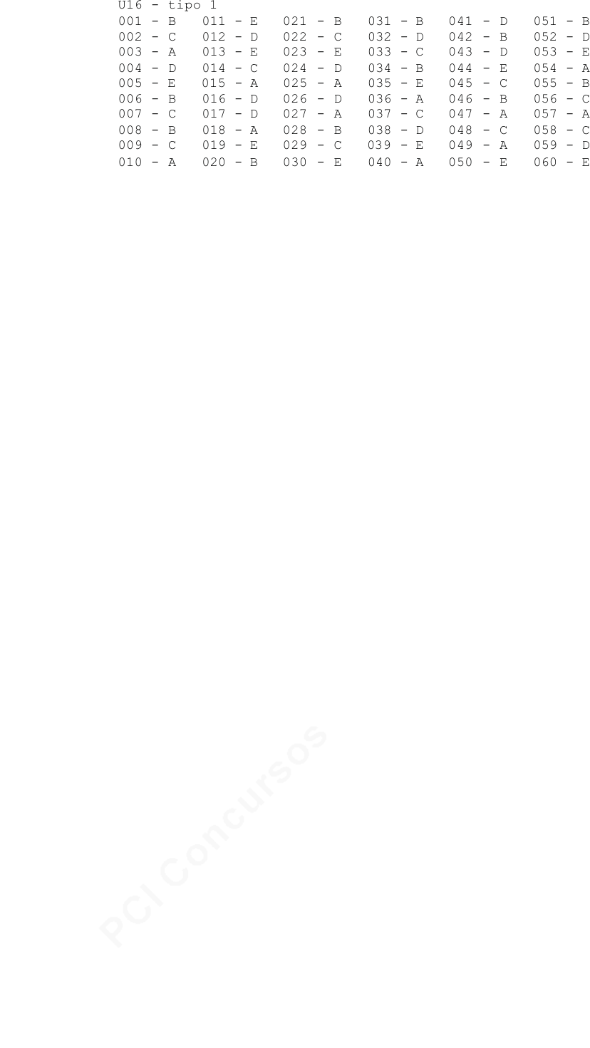 <p>pcimarkpci MDAwMDowMDAwOjAwMDA6MDAwMDowMDAwOmZmZmY6OTU0ZTpiYjZm:V2VkLCAyMyBPY3QgMjAyNCAyMToyOTowMyAtMDMwMA==</p><p>www.pciconcursos.com.br</p><p>U16 - tipo 1</p><p>001 - B 011 - E 021 - B 031 - B 041 - D 051 - B</p><p>002 - C 012 - D 022 - C 032 - D 042 - B 052 - D</p><p>003 - A 013 - E 023 - E 033 - C 043 - D 053 - E</p><p>004 - D 014 - C 024 - D 034 - B 044 - E 054 - A</p><p>005 - E 015 - A 025 - A 035 - E 045 - C 055 - B</p><p>006 - B 016 - D 026 - D 036 - A 046 - B 056 - C</p><p>007 - C 017 - D 027 - A 037 - C 047 - A 057 - A</p><p>008 - B 018 - A 028 - B 038 - D 048 - C 058 - C</p><p>009 - C 019 - E 029 - C 039 - E 049 - A 059 - D</p><p>010 - A 020 - B 030 - E 040 - A 050 - E 060 - E</p>