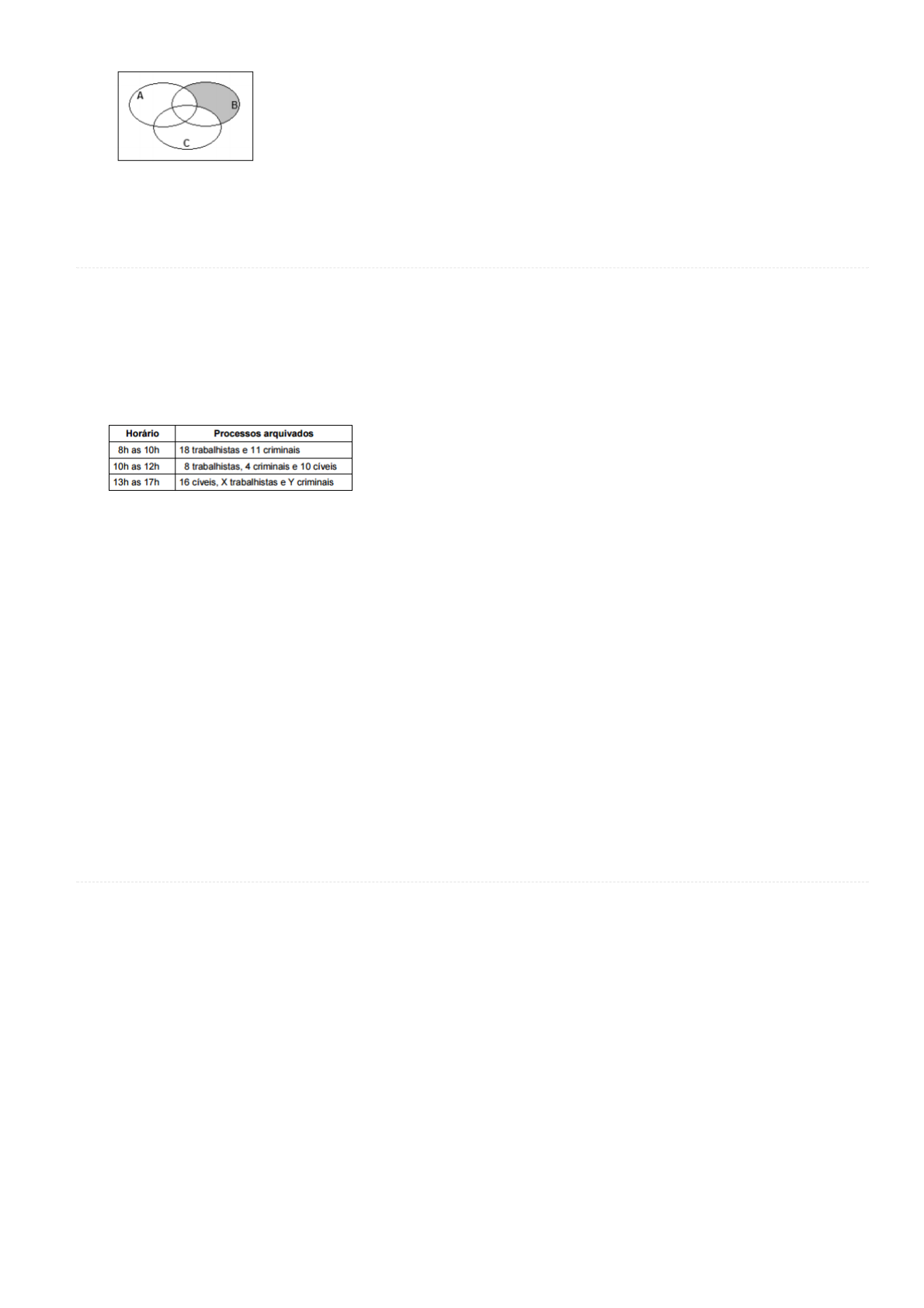 <p>09/12/2017 Questões de Concursos e Perguntas de Concursos Públicos- Aprova Concursos</p><p>https://www.aprovaconcursos.com.br/questoes-de-concurso/questoes/disciplina/Racioc%25C3%25ADnio+L%25C3%25B3gico/banca/FCC/filtro/2… 6/9</p><p>e)</p><p>910) Q403013 (/questoes-de-concurso/questao/403013) (/questoes-de-concurso/questao/403013#imprimir)</p><p>Provas: FCC - 2004 - TRT - 9ª REGIÃO (PR) - Técnico Judiciário - Informática (/questoes-de-concurso/prova/fcc-2004-trt-9-ordf-regiao-pr-tecnico-judiciario-informatica)</p><p>Disciplina: Raciocínio Lógico (/questoes-de-concurso/disciplina/raciocinio-logico) - Assuntos: (/questoes-de-concurso/questoes/assunto/)</p><p>Em um dia de trabalho, certo funcionário de um fórum</p><p>arquivou 31 processos trabalhistas, 35 processos criminais</p><p>e alguns processos cíveis. Sabe-se que o serviço completo</p><p>foi realizado de acordo com o seguinte cronograma:</p><p>Em relação aos processos arquivados pelo funcionário</p><p>nesse dia, é correto a�rmar que</p><p>a)</p><p>o total de cíveis é maior que o total de trabalhistas.</p><p>b)</p><p>o total de cíveis é maior do que X + Y.</p><p>c)</p><p>o total de cíveis é menor que X.</p><p>d)</p><p>o total de cíveis é menor que Y.</p><p>e)</p><p>X é maior que Y.</p><p>911) Q403018 (/questoes-de-concurso/questao/403018) (/questoes-de-concurso/questao/403018#imprimir)</p><p>Provas: FCC - 2004 - TRT - 9ª REGIÃO (PR) - Técnico Judiciário - Informática (/questoes-de-concurso/prova/fcc-2004-trt-9-ordf-regiao-pr-tecnico-judiciario-informatica)</p><p>FCC - 2004 - TRT - 9ª REGIÃO (PR) - Técnico Judiciário - Área Serviços Gerais (/questoes-de-concurso/prova/fcc-2004-trt-9-ordf-regiao-pr-tecnico-judiciario-area-servicos-gerais)</p><p>FCC - 2004 - TRT - 9ª REGIÃO (PR) - Técnico Judiciário - Enfermagem (/questoes-de-concurso/prova/fcc-2004-trt-9-ordf-regiao-pr-tecnico-judiciario-enfermagem)</p><p>FCC - 2004 - TRT - 9ª REGIÃO (PR) - Técnico Judiciário - Programação (/questoes-de-concurso/prova/fcc-2004-trt-9-ordf-regiao-pr-tecnico-judiciario-programacao)</p><p>FCC - 2004 - TRT - 9ª REGIÃO (PR) - Técnico Judiciário - Artes Gráficas (/questoes-de-concurso/prova/fcc-2004-trt-9-ordf-regiao-pr-tecnico-judiciario-artes-graficas)</p><p>FCC - 2004 - TRT - 9ª REGIÃO (PR) - Técnico Judiciário - Obras e Metalurgia (/questoes-de-concurso/prova/fcc-2004-trt-9-ordf-regiao-pr-tecnico-judiciario-obras-e-metalurgia)</p><p>FCC - 2004 - TRT - 9ª REGIÃO (PR) - Técnico Judiciário - Telecomunicações e Eletricidade (/questoes-de-concurso/prova/fcc-2004-trt-9-ordf-regiao-pr-tecnico-judiciario-telecomunicacoes-</p><p>FCC - 2004 - TRT - 9ª REGIÃO (PR) - Técnico Judiciário - Área Administrativa (/questoes-de-concurso/prova/fcc-2004-trt-9-ordf-regiao-pr-tecnico-judiciario-area-administrativa)</p><p>FCC - 2004 - TRT - 9ª REGIÃO (PR) - Técnico Judiciário - Transporte (/questoes-de-concurso/prova/fcc-2004-trt-9-ordf-regiao-pr-tecnico-judiciario-transporte)</p><p>FCC - 2004 - TRT - 9ª REGIÃO (PR) - Técnico Judiciário - Instalações Lógicas e Elétricas (/questoes-de-concurso/prova/fcc-2004-trt-9-ordf-regiao-pr-tecnico-judiciario-instalacoes-logicas-e</p><p>Disciplina: Raciocínio Lógico (/questoes-de-concurso/disciplina/raciocinio-logico) - Assuntos: (/questoes-de-concurso/questoes/assunto/)</p><p>Em uma urna contendo 2 bolas brancas, 1 bola preta,</p><p>3 bolas cinzas, acrescenta-se 1 bola, que pode ser branca,</p><p>preta ou cinza. Em seguida, retira-se dessa urna, sem</p><p>reposição, um total de 5 bolas. Sabe-se que apenas 2 das</p><p>bolas retiradas eram brancas e que não restaram bolas</p><p>pretas na urna após a retirada. Em relação às bolas que</p><p>restaram na urna, é correto a�rmar que</p><p>https://www.aprovaconcursos.com.br/questoes-de-concurso/prova/fcc-2004-trt-9-ordf-regiao-pr-tecnico-judiciario-area-administrativa</p><p>https://www.aprovaconcursos.com.br/questoes-de-concurso/disciplina/raciocinio-logico</p><p>https://www.aprovaconcursos.com.br/questoes-de-concurso/prova/fcc-2004-trt-9-ordf-regiao-pr-tecnico-judiciario-obras-e-metalurgia</p><p>https://www.aprovaconcursos.com.br/questoes-de-concurso/disciplina/raciocinio-logico</p><p>https://www.aprovaconcursos.com.br/questoes-de-concurso/questao/403018</p><p>https://www.aprovaconcursos.com.br/questoes-de-concurso/prova/fcc-2004-trt-9-ordf-regiao-pr-tecnico-judiciario-informatica</p><p>https://www.aprovaconcursos.com.br/questoes-de-concurso/prova/fcc-2004-trt-9-ordf-regiao-pr-tecnico-judiciario-programacao</p><p>https://www.aprovaconcursos.com.br/questoes-de-concurso/prova/fcc-2004-trt-9-ordf-regiao-pr-tecnico-judiciario-instalacoes-logicas-e-eletricas</p><p>https://www.aprovaconcursos.com.br/questoes-de-concurso/prova/fcc-2004-trt-9-ordf-regiao-pr-tecnico-judiciario-enfermagem</p><p>https://www.aprovaconcursos.com.br/questoes-de-concurso/questao/403013</p><p>https://www.aprovaconcursos.com.br/questoes-de-concurso/prova/fcc-2004-trt-9-ordf-regiao-pr-tecnico-judiciario-artes-graficas</p><p>https://www.aprovaconcursos.com.br/questoes-de-concurso/prova/fcc-2004-trt-9-ordf-regiao-pr-tecnico-judiciario-informatica</p><p>https://www.aprovaconcursos.com.br/questoes-de-concurso/prova/fcc-2004-trt-9-ordf-regiao-pr-tecnico-judiciario-area-servicos-gerais</p><p>https://www.aprovaconcursos.com.br/questoes-de-concurso/questao/403013#imprimir</p><p>https://www.aprovaconcursos.com.br/questoes-de-concurso/prova/fcc-2004-trt-9-ordf-regiao-pr-tecnico-judiciario-telecomunicacoes-e-eletricidade</p><p>https://www.aprovaconcursos.com.br/questoes-de-concurso/prova/fcc-2004-trt-9-ordf-regiao-pr-tecnico-judiciario-transporte</p><p>https://www.aprovaconcursos.com.br/questoes-de-concurso/questao/403018#imprimir</p><p>https://www.aprovaconcursos.com.br/questoes-de-concurso/questoes/assunto/</p><p>https://www.aprovaconcursos.com.br/questoes-de-concurso/questoes/assunto/</p>