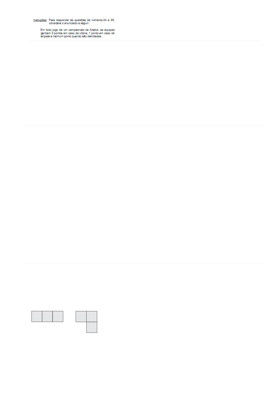 <p>09/12/2017 Questões de Concursos e Perguntas de Concursos Públicos- Aprova Concursos</p><p>https://www.aprovaconcursos.com.br/questoes-de-concurso/questoes/disciplina/Racioc%25C3%25ADnio+L%25C3%25B3gico/banca/FCC/filtro/2… 3/7</p><p>Outra equipe que disputa esse campeonato conquistou um total de 16 pontos nos nove primeiros jogos. O número de vitórias obtido por essa equipe</p><p>nesses nove jogos</p><p>a) pode ter sido igual a 3 ou 4 ou 5.</p><p>b) somente pode ter sido igual a 4 ou 5.</p><p>c) certamente foi 3.</p><p>d) certamente foi 4.</p><p>e) certamente foi 5.</p><p>531) Q139593 (/questoes-de-concurso/questao/139593) (/questoes-de-concurso/questao/139593#imprimir)</p><p>Provas: FCC - 2012 - TST - Técnico Judiciário - Programação (/questoes-de-concurso/prova/fcc-2012-tst-tecnico-judiciario-programacao)</p><p>Disciplina: Raciocínio Lógico (/questoes-de-concurso/disciplina/raciocinio-logico) - Assuntos:</p><p>1. Estruturas lógicas (tabela verdade) (/questoes-de-concurso/questoes/assunto/1.+Estruturas+l%C3%B3gicas+%28tabela+verdade%29)</p><p>Huguinho, Zezinho e Luizinho, três irmãos gêmeos, estavam brincando na casa de seu tio quando um deles quebrou seu vaso de estimação. Ao saber</p><p>do ocorrido, o tio perguntou a cada um deles quem havia quebrado o vaso. Leia as respostas de cada um.</p><p>Huguinho → Eu não quebrei o vaso!</p><p>Zezinho → Foi o Luizinho quem quebrou o vaso!</p><p>Luizinho → O Zezinho está mentindo!</p><p>Sabendo que somente um dos três falou a verdade, conclui-se que o sobrinho que quebrou o vaso e o que disse a verdade são, respectivamente,</p><p>a) Huguinho e Luizinho.</p><p>b) Huguinho e Zezinho.</p><p>c) Zezinho e Huguinho.</p><p>d) Luizinho e Zezinho.</p><p>e) Luizinho e Huguinho.</p><p>532) Q139598 (/questoes-de-concurso/questao/139598) (/questoes-de-concurso/questao/139598#imprimir)</p><p>Provas: FCC - 2012 - TST - Técnico Judiciário - Programação (/questoes-de-concurso/prova/fcc-2012-tst-tecnico-judiciario-programacao)</p><p>FCC - 2012 - TST - Técnico Judiciário - Área Administrativa (/questoes-de-concurso/prova/fcc-2012-tst-tecnico-judiciario-area-administrativa)</p><p>Disciplina: Raciocínio Lógico (/questoes-de-concurso/disciplina/raciocinio-logico) - Assuntos:</p><p>1. Estruturas lógicas (tabela verdade) (/questoes-de-concurso/questoes/assunto/1.+Estruturas+l%C3%B3gicas+%28tabela+verdade%29)</p><p>Marina possui um jogo de montar composto por várias peças quadradas, todas de mesmo tamanho. A única forma de juntar duas peças é unindo-as de</p><p>modo que elas �quem com um único lado em comum. Juntando-se três dessas peças, é possível formar apenas dois tipos diferentes de �guras,</p><p>mostradas abaixo.</p><p>Note que as duas �guras podem aparecer em diferentes posições, o que não caracteriza novos tipos de �guras. O número de tipos diferentes de �guras</p><p>que podem ser formados juntando-se quatro dessas peças é igual a</p><p>a) 4.</p><p>b) 5.</p><p>c) 6.</p><p>d) 7.</p><p>https://www.aprovaconcursos.com.br/questoes-de-concurso/disciplina/raciocinio-logico</p><p>https://www.aprovaconcursos.com.br/questoes-de-concurso/questoes/assunto/1.+Estruturas+l%C3%B3gicas+%28tabela+verdade%29</p><p>https://www.aprovaconcursos.com.br/questoes-de-concurso/questao/139598#imprimir</p><p>https://www.aprovaconcursos.com.br/questoes-de-concurso/prova/fcc-2012-tst-tecnico-judiciario-programacao</p><p>https://www.aprovaconcursos.com.br/questoes-de-concurso/questao/139593</p><p>https://www.aprovaconcursos.com.br/questoes-de-concurso/questoes/assunto/1.+Estruturas+l%C3%B3gicas+%28tabela+verdade%29</p><p>https://www.aprovaconcursos.com.br/questoes-de-concurso/questao/139598</p><p>https://www.aprovaconcursos.com.br/questoes-de-concurso/prova/fcc-2012-tst-tecnico-judiciario-area-administrativa</p><p>https://www.aprovaconcursos.com.br/questoes-de-concurso/questao/139593#imprimir</p><p>https://www.aprovaconcursos.com.br/questoes-de-concurso/prova/fcc-2012-tst-tecnico-judiciario-programacao</p><p>https://www.aprovaconcursos.com.br/questoes-de-concurso/disciplina/raciocinio-logico</p>