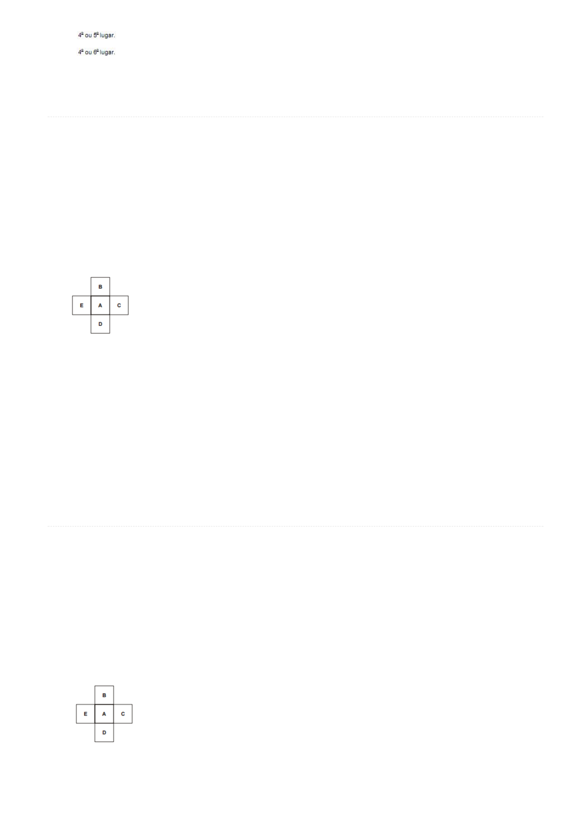<p>09/12/2017 Questões de Concursos e Perguntas de Concursos Públicos- Aprova Concursos</p><p>https://www.aprovaconcursos.com.br/questoes-de-concurso/questoes/disciplina/Racioc%25C3%25ADnio+L%25C3%25B3gico/banca/FCC/filtro/2… 6/7</p><p>d)</p><p>e)</p><p>553) Q311522 (/questoes-de-concurso/questao/311522) (/questoes-de-concurso/questao/311522#imprimir)</p><p>Provas: FCC - 2012 - TJ-PE - Analista Judiciário - Pedagogia (/questoes-de-concurso/prova/fcc-2012-tj-pe-analista-judiciario-pedagogia)</p><p>Disciplina: Raciocínio Lógico (/questoes-de-concurso/disciplina/raciocinio-logico) - Assuntos: (/questoes-de-concurso/questoes/assunto/)</p><p>A �gura mostra uma composição de cinco quadrados,</p><p>todos com medida dos lados iguais a 4 cm. Imagine que o</p><p>quadrado C se desloque, sobre o lado comum entre C e A,</p><p>a distância de 1 cm aproximando-se do quadrado D.</p><p>Imagine também que o quadrado D se desloque, sobre o</p><p>lado comum entre D e A, à distância de 2 cm aproximando-</p><p>se de E. Ainda imagine que o quadrado E se desloque,</p><p>sobre o lado comum entre E e A, à distância de 3 cm</p><p>aproximando-se de B.</p><p>O contorno da �gura resultante dessas alterações imaginadas</p><p>simultaneamente é um polígono com o número de</p><p>lados igual a</p><p>a) 14.</p><p>b) 16.</p><p>c) 20.</p><p>d) 24.</p><p>e) 25.</p><p>554) Q311642 (/questoes-de-concurso/questao/311642) (/questoes-de-concurso/questao/311642#imprimir)</p><p>Provas: FCC - 2012 - TJ-PE - Analista Judiciário - Biblioteconomia (/questoes-de-concurso/prova/fcc-2012-tj-pe-analista-judiciario-biblioteconomia)</p><p>Disciplina: Raciocínio Lógico (/questoes-de-concurso/disciplina/raciocinio-logico) - Assuntos: (/questoes-de-concurso/questoes/assunto/)</p><p>A �gura mostra uma composição de cinco quadrados,</p><p>todos com medida dos lados iguais a 4 cm. Imagine que o</p><p>quadrado C se desloque, sobre o lado comum entre C e A,</p><p>a distância de 1 cm aproximando-se do quadrado D.</p><p>Imagine também que o quadrado D se desloque, sobre o</p><p>lado comum entre D e A, à distância de 2 cm aproximando-</p><p>se de E. Ainda imagine que o quadrado E se desloque,</p><p>sobre o lado comum entre E e A, à distância de 3 cm</p><p>aproximando-se de B.</p><p>O contorno da �gura resultante dessas alterações imaginadas</p><p>simultaneamente é um polígono com o número de</p><p>lados igual a</p><p>https://www.aprovaconcursos.com.br/questoes-de-concurso/disciplina/raciocinio-logico</p><p>https://www.aprovaconcursos.com.br/questoes-de-concurso/questao/311522</p><p>https://www.aprovaconcursos.com.br/questoes-de-concurso/prova/fcc-2012-tj-pe-analista-judiciario-pedagogia</p><p>https://www.aprovaconcursos.com.br/questoes-de-concurso/prova/fcc-2012-tj-pe-analista-judiciario-biblioteconomia</p><p>https://www.aprovaconcursos.com.br/questoes-de-concurso/questoes/assunto/</p><p>https://www.aprovaconcursos.com.br/questoes-de-concurso/questao/311522#imprimir</p><p>https://www.aprovaconcursos.com.br/questoes-de-concurso/questoes/assunto/</p><p>https://www.aprovaconcursos.com.br/questoes-de-concurso/questao/311642#imprimir</p><p>https://www.aprovaconcursos.com.br/questoes-de-concurso/questao/311642</p><p>https://www.aprovaconcursos.com.br/questoes-de-concurso/disciplina/raciocinio-logico</p>