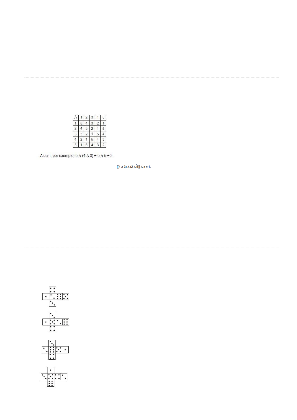 <p>09/12/2017 Questões de Concursos e Perguntas de Concursos Públicos- Aprova Concursos</p><p>https://www.aprovaconcursos.com.br/questoes-de-concurso/questoes/disciplina/Racioc%25C3%25ADnio+L%25C3%25B3gico/banca/FCC/filtro/2… 4/9</p><p>b) 6.</p><p>c) 8.</p><p>d) 9.</p><p>e) 10.</p><p>832) Q96335 (/questoes-de-concurso/questao/96335) (/questoes-de-concurso/questao/96335#imprimir)</p><p>Provas:</p><p>FCC - 2006 - TRT - 6ª Região (PE) - Analista Judiciário - Área Judiciária - Execução de Mandados (/questoes-de-concurso/prova/fcc-2006-trt-6-ordf-regiao-pe-analista-judiciario-area-judicia</p><p>Disciplina: Raciocínio Lógico (/questoes-de-concurso/disciplina/raciocinio-logico) - Assuntos: (/questoes-de-concurso/questoes/assunto/)</p><p>Considere que a tábua abaixo de�ne uma operação ?, sobre o conjunto E = {1, 2, 3, 4, 5}.</p><p>Nessas condições, se x é um elemento de E, tal que , então o valor de x é</p><p>a) 1.</p><p>b) 2.</p><p>c) 3.</p><p>d) 4.</p><p>e) 5.</p><p>833) Q96241 (/questoes-de-concurso/questao/96241) (/questoes-de-concurso/questao/96241#imprimir)</p><p>Provas: FCC - 2006 - TRT - 6ª Região (PE) - Técnico Judiciário - Área Administrativa (/questoes-de-concurso/prova/fcc-2006-trt-6-ordf-regiao-pe-tecnico-judiciario-area-administrativa)</p><p>Disciplina: Raciocínio Lógico (/questoes-de-concurso/disciplina/raciocinio-logico) - Assuntos: 6. Psicotécnico (/questoes-de-concurso/questoes/assunto/6.+Psicot%C3%A9cnico)</p><p>Sabe-se que os pontos marcados nas faces opostas de um dado devem somar 7 pontos. Assim sendo, qual das �guras seguintes NÃO pode ser a</p><p>plani�cação de um dado?</p><p>a)</p><p>b)</p><p>c)</p><p>d)</p><p>https://www.aprovaconcursos.com.br/questoes-de-concurso/disciplina/raciocinio-logico</p><p>https://www.aprovaconcursos.com.br/questoes-de-concurso/prova/fcc-2006-trt-6-ordf-regiao-pe-analista-judiciario-area-judiciaria-execucao-de-manda</p><p>https://www.aprovaconcursos.com.br/questoes-de-concurso/questoes/assunto/</p><p>https://www.aprovaconcursos.com.br/questoes-de-concurso/questao/96241</p><p>https://www.aprovaconcursos.com.br/questoes-de-concurso/questao/96335</p><p>https://www.aprovaconcursos.com.br/questoes-de-concurso/questao/96241#imprimir</p><p>https://www.aprovaconcursos.com.br/questoes-de-concurso/questao/96335#imprimir</p><p>https://www.aprovaconcursos.com.br/questoes-de-concurso/disciplina/raciocinio-logico</p><p>https://www.aprovaconcursos.com.br/questoes-de-concurso/questoes/assunto/6.+Psicot%C3%A9cnico</p><p>https://www.aprovaconcursos.com.br/questoes-de-concurso/prova/fcc-2006-trt-6-ordf-regiao-pe-tecnico-judiciario-area-administrativa</p>