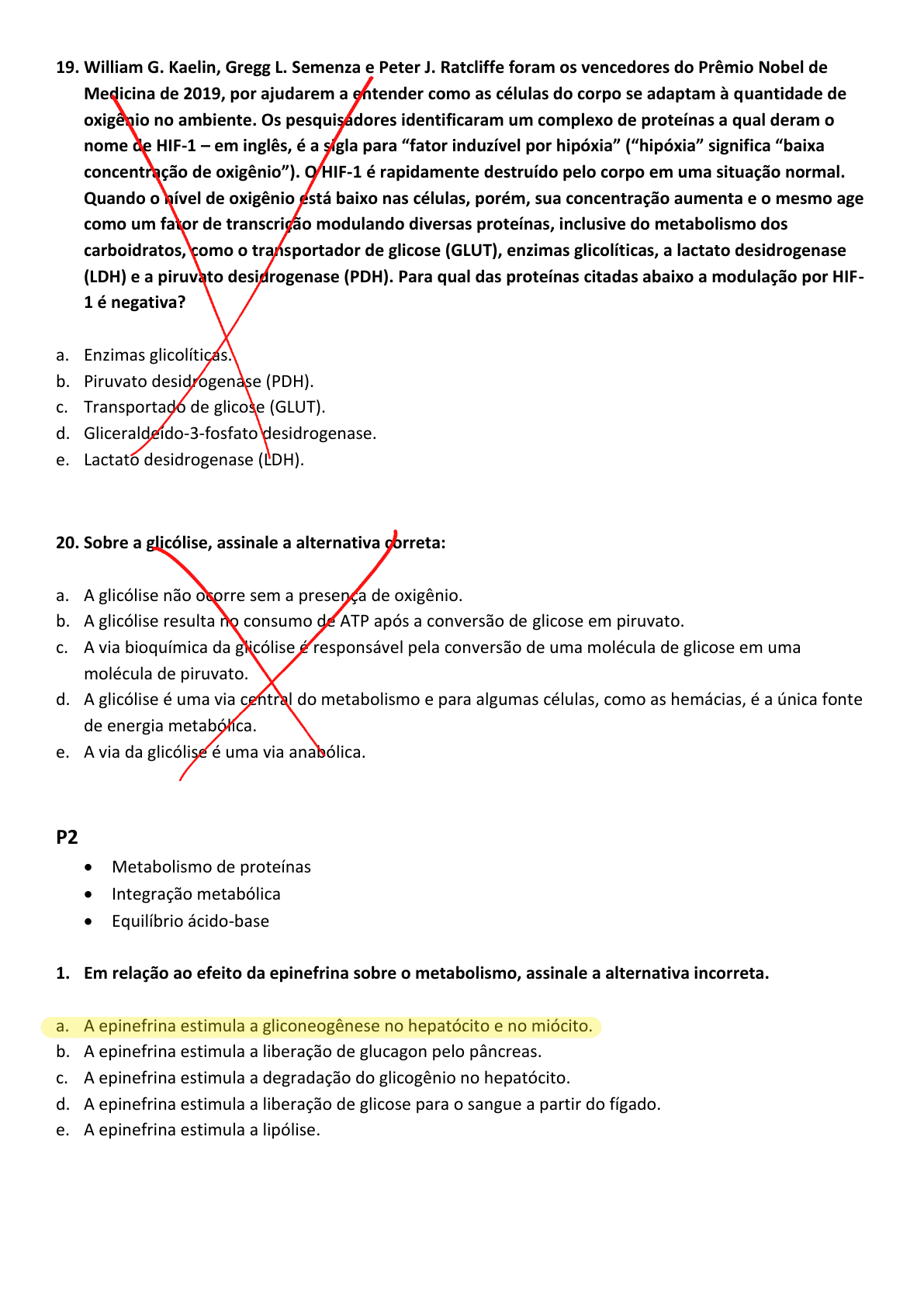 <p>19. William G. Kaelin, Gregg L. Semenza e Peter J. Ratcliffe foram os vencedores do Prêmio Nobel de</p><p>Medicina de 2019, por ajudarem a entender como as células do corpo se adaptam à quantidade de</p><p>oxigênio no ambiente. Os pesquisadores identificaram um complexo de proteínas a qual deram o</p><p>nome de HIF-1 – em inglês, é a sigla para “fator induzível por hipóxia” (“hipóxia” significa “baixa</p><p>concentração de oxigênio”). O HIF-1 é rapidamente destruído pelo corpo em uma situação normal.</p><p>Quando o nível de oxigênio está baixo nas células, porém, sua concentração aumenta e o mesmo age</p><p>como um fator de transcrição modulando diversas proteínas, inclusive do metabolismo dos</p><p>carboidratos, como o transportador de glicose (GLUT), enzimas glicolíticas, a lactato desidrogenase</p><p>(LDH) e a piruvato desidrogenase (PDH). Para qual das proteínas citadas abaixo a modulação por HIF-</p><p>1 é negativa?</p><p>a. Enzimas glicolíticas.</p><p>b. Piruvato desidrogenase (PDH).</p><p>c. Transportado de glicose (GLUT).</p><p>d. Gliceraldeído-3-fosfato desidrogenase.</p><p>e. Lactato desidrogenase (LDH).</p><p>20. Sobre a glicólise, assinale a alternativa correta:</p><p>a. A glicólise não ocorre sem a presença de oxigênio.</p><p>b. A glicólise resulta no consumo de ATP após a conversão de glicose em piruvato.</p><p>c. A via bioquímica da glicólise é responsável pela conversão de uma molécula de glicose em uma</p><p>molécula de piruvato.</p><p>d. A glicólise é uma via central do metabolismo e para algumas células, como as hemácias, é a única fonte</p><p>de energia metabólica.</p><p>e. A via da glicólise é uma via anabólica.</p><p>P2</p><p>• Metabolismo de proteínas</p><p>• Integração metabólica</p><p>• Equilíbrio ácido-base</p><p>1. Em relação ao efeito da epinefrina sobre o metabolismo, assinale a alternativa incorreta.</p><p>a. A epinefrina estimula a gliconeogênese no hepatócito e no miócito.</p><p>b. A epinefrina estimula a liberação de glucagon pelo pâncreas.</p><p>c. A epinefrina estimula a degradação do glicogênio no hepatócito.</p><p>d. A epinefrina estimula a liberação de glicose para o sangue a partir do fígado.</p><p>e. A epinefrina estimula a lipólise.</p><p>2. A gliconeogênese é uma via metabólica indispensável na manutenção da glicemia em períodos de</p><p>jejum, e os aminoácidos são uma importante fonte de carbonos para essa via, como os citados nas</p><p>alternativas abaixo, exceto:</p><p>a. Fenilalanina.</p><p>b. Isoleucina.</p><p>c. Leucina.</p><p>d. Valina.</p><p>e. Treonina.</p><p>3. A manutenção da glicemia dentro da faixa normal é uma prioridade do organismo, principalmente</p><p>porque a glicose é um combustível essencial ao cérebro, e elevações do nível de glicose podem</p><p>causar diversas alterações teciduais. Nesse contexto, a sinalização dos hormônios insulina e glucagon</p><p>é fundamental para a manutenção da glicemia. A insulina opõe-se aos níveis altos, enquanto o</p><p>glucagon opões aos níveis baixos de glicose sanguínea. Assinale a alternativa que não apresenta um</p><p>efeito da insulina no sentido de se opor aos níveis altos de glicose sanguínea.</p><p>a. Inibição da frutose-1,6-bifosfatase (FBPase-1).</p><p>b. Inibição da glicogênio fosforilase.</p><p>c. Ativação do GLUT-4.</p><p>d. Inibição da acetil-CoA carboxilase.</p><p>e. Ativação da glicogênio sintase.</p><p>4. Sobre o metabolismo do heme, assinale a alternativa incorreta.</p><p>a. A hepatite pode levar à icterícia, uma vez que torna o fígado menos capaz de transportar a bilirrubina</p><p>para os dutos biliares.</p><p>b. A glicuronil-bilirrubina transferase é uma enzima hepática responsável pela conjugação da bilirrubina.</p><p>c. A bilirrubina direta comumente encontra-se aumentada em neonatos, devido à baixa atividade da</p><p>glicuronil-bilirrubina transferase.</p><p>d. Na icterícia hemolítica, ocorre aumento da bilirrubina indireta.</p><p>e. A obstrução do duto biliar por cálculos biliares ou tumor levam ao aumento da bilirrubina direta.</p><p>5. Paciente do sexo masculino apresentou no exame de gasometria arterial pH sanguíneo de 7,30, pCO2</p><p>de 52 mmHg e níveis de HCO3- em 18 mEq/L (valores de referência: pH 7,35-7,45; pCO2 35-45 mmHg;</p><p>HCO3- 22-26 mEq/L). Assinale a alternativa com o diagnóstico correto para esta paciente:</p><p>a. Acidose mista.</p><p>b. Acidose respiratória.</p><p>c. Acidose metabólica.</p><p>d. Alcalose metabólica.</p><p>e. Alcalose respiratória.</p><p>6. Sobre o hormônio adiponectina, assinale a alternativa correta.</p><p>a. A adiponectina é produzida pelo pâncreas e atua através da ativação da AMPK.</p><p>b. A adiponectina é produzida pelo hipotálamo, e aumenta o apetite.</p><p>c. A adiponectina possui muitos efeitos sobre as vias metabólicas, incluindo inibição da glicólise.</p><p>d. A liberação de adiponectina ocorre após expansão do tecido adiposo.</p><p>e. A adiponectina é liberada após retração do tecido adiposo, e ativa a oxidação de ácidos graxos.</p><p>7. Paciente do sexo masculino, com circunferência abdominal de 110 cm, pressão arterial sistólica de</p><p>140 mmHg e diastólico de 87 mmHg. Após jejum de 12 horas, os exames laboratoriais demonstraram</p><p>níveis de triglicerídeos circulantes de 153 mg/dL, 35 mg/dL de HDL e 142 mg/dL de glicose. O exame</p><p>de sangue foi repetido em outra ocasião, com 12h de jejum, e o paciente apresentou 156 mg/dL de</p><p>triglicerídeos, 34 mg/dL de HDL e 146 mg/dL de glicose. Baseado nos dados disponíveis, assinale a</p><p>alternativa com o diagnóstico correto para este paciente:</p><p>a. Síndrome metabólica.</p><p>b. Pré-diabetes.</p><p>c. Diabetes mellitus e síndrome metabólica.</p><p>d. Diabetes mellitus.</p><p>e. Hipercolesterolemia.</p><p>8. Paciente do sexo feminino apresentou no exame de