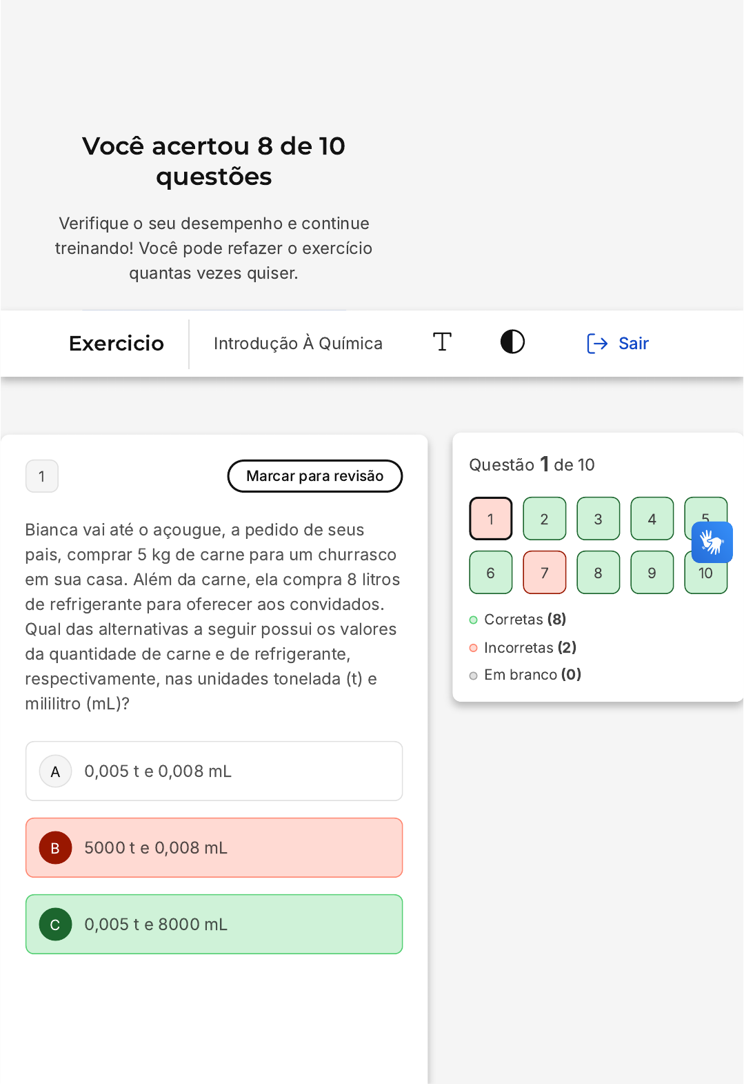 <p>Você acertou 8 de 10</p><p>questões</p><p>Verifique o seu desempenho e continue</p><p>treinando! Você pode refazer o exercício</p><p>quantas vezes quiser.</p><p>Verificar Desempenho</p><p>A</p><p>B</p><p>C</p><p>1 Marcar para revisão</p><p>Bianca vai até o açougue, a pedido de seus</p><p>pais, comprar 5 kg de carne para um churrasco</p><p>em sua casa. Além da carne, ela compra 8 litros</p><p>de refrigerante para oferecer aos convidados.</p><p>Qual das alternativas a seguir possui os valores</p><p>da quantidade de carne e de refrigerante,</p><p>respectivamente, nas unidades tonelada (t) e</p><p>mililitro (mL)?</p><p>0,005 t e 0,008 mL</p><p>5000 t e 0,008 mL</p><p>0,005 t e 8000 mL</p><p>Questão 1 de 10</p><p>Corretas �8�</p><p>Incorretas �2�</p><p>Em branco �0�</p><p>1 2 3 4 5</p><p>6 7 8 9 10</p><p>Exercicio Introdução À Química Sair</p><p>D</p><p>E</p><p>5000 t e 8000 mL</p><p>0,005 t e 0,8 mL</p><p>Resposta incorreta</p><p>Opa! A alternativa correta é a letra</p><p>C. Confira o gabarito comentado!</p><p>Gabarito Comentado</p><p>A questão pede a conversão de 5 kg de</p><p>carne para toneladas e 8 litros de</p><p>refrigerante para mililitros. Para isso,</p><p>utilizamos regras de três simples,</p><p>considerando as equivalências entre as</p><p>unidades de medida.</p><p>Para a massa, sabemos que 1 tonelada</p><p>equivale a 1000 kg. Portanto, para</p><p>converter 5 kg em toneladas, temos:</p><p>1 t ---------- 1000Kg</p><p>x --------- 5 Kg</p><p>1000x = 1 . 5</p><p>1000x = 5</p><p>x = 5 / 1000</p><p>x = 0,005 t</p><p>Para o volume, sabemos que 1 litro equivale</p><p>a 1000 mL. Portanto, para converter 8 litros</p><p>em mililitros, temos:</p><p>1 L ---------- 1000 mL</p><p>8 L --------- x</p><p>x = 8 .1000</p><p>x = 8000 mL</p><p>Portanto, a alternativa correta é a C, que</p><p>apresenta os valores 0,005 t para a carne e</p><p>8000 mL para o refrigerante.</p><p>A</p><p>B</p><p>C</p><p>D</p><p>E</p><p>2 Marcar para revisão</p><p>Em um teste de aptidão em um concurso da</p><p>Polícia Militar de um determinado estado, o</p><p>candidato deve percorrer uma distância de</p><p>2400 metros em um tempo de 12 minutos. Qual</p><p>alternativa indica os valores de distância e</p><p>tempo em km e hora, respectivamente?</p><p>2,4 km e 2 h</p><p>4,2 km e 0,2 h</p><p>0,24 km e 0,2 h</p><p>4,2 km e 2 h</p><p>2,4 km e 0,2 h</p><p>Resposta correta</p><p>Parabéns, você selecionou a</p><p>alternativa correta. Confira o</p><p>gabarito comentado!</p><p>Gabarito Comentado</p><p>A</p><p>B</p><p>3 Marcar para revisão</p><p>A alquimia - mistura de arte, ciência e magia</p><p>precursora da química ¿ elencou como</p><p>objetivos a busca do elixir da longa vida e da</p><p>pedra filosofal que permitiria a transformação</p><p>de metais comuns em ouro. Inobstante</p><p>o insucesso de suas pesquisas naquele campo</p><p>restrito, a alquimia deixou um grande legado</p><p>para a ciência química. Assinale a opção que</p><p>corresponde a contribuições efetivas da</p><p>alquimia.</p><p>A elaboração do Elixir da longa vida e</p><p>a Pedra Filosofal.</p><p>Subsídios que conduziram as</p><p>pesquisas sobre a transmutação dos</p><p>metais.</p><p>C</p><p>D</p><p>E</p><p>Contribuições para o estabelecimento</p><p>das leis das combinações químicas.</p><p>O conceito de átomo e muitas</p><p>informações que embasaram a teoria</p><p>atômica moderna.</p><p>A descoberta de muitas substâncias, a</p><p>invenção de equipamentos e os</p><p>trabalhos na área de metalurgia.</p><p>Resposta correta</p><p>Parabéns, você selecionou a</p><p>alternativa correta. Confira o</p><p>gabarito comentado!</p><p>Gabarito Comentado</p><p>A alquimia deixou um grande legado para a</p><p>ciência química, principalmente na</p><p>descoberta de muitas substâncias, na</p><p>invenção de equipamentos e nos trabalhos</p><p>na área de metalurgia.</p><p>4 Marcar para revisão</p><p>A densidade de uma substância corresponde à</p><p>razão entre sua massa e seu volume. A</p><p>densidade da platina é de 21,45 g/cm e a</p><p>densidade do gelo é de 0,92 g/cm . Quantos</p><p>algarismos significativos existem nos valores</p><p>das densidades da platina e do gelo,</p><p>respectivamente?</p><p>3</p><p>3</p><p>A</p><p>B</p><p>C</p><p>D</p><p>E</p><p>2 e 2.</p><p>3 e 4.</p><p>4 e 3.</p><p>2 e 4.</p><p>4 e 2.</p><p>Resposta correta</p><p>Parabéns, você selecionou a</p><p>alternativa correta. Confira o</p><p>gabarito comentado!</p><p>Gabarito Comentado</p><p>Os algarismos significativos são os dígitos</p><p>de um número que carregam informações</p><p>sobre a precisão desse número. No caso</p><p>da densidade da platina, que é 21,45</p><p>g/cm , temos 4 algarismos significativos</p><p>�2, 1, 4 e 5�. Já para a densidade do gelo,</p><p>que é 0,92 g/cm , temos 2 algarismos</p><p>significativos �9 e 2�. Portanto, a resposta</p><p>correta é 4 e 2.</p><p>3</p><p>3</p><p>5 Marcar para revisão</p><p>A balança analítica é um instrumento de</p><p>pesagem amplamente utilizado em laboratórios</p><p>e ambientes de pesquisa, especialmente em</p><p>áreas como química, farmácia, biologia e</p><p>A</p><p>B</p><p>C</p><p>D</p><p>E</p><p>ciências médicas. Qual é o cuidado importante</p><p>ao utilizar a balança analítica para pesagens?</p><p>Realizar pesagens de materiais</p><p>quentes imediatamente após o</p><p>aquecimento</p><p>Instalar a balança próxima a portas e</p><p>janelas para melhor circulação de ar</p><p>Utilizar luvas ou papel para evitar a</p><p>transferência de gordura ou umidade</p><p>das mãos</p><p>Deixar as portas da balança abertas</p><p>durante os procedimentos de tara e</p><p>pesagem</p><p>Não se preocupar com a centralização</p><p>do peso no prato da balança</p><p>Resposta correta</p><p>Parabéns, você selecionou a</p><p>alternativa correta. Confira o</p><p>gabarito comentado!</p><p>Gabarito Comentado</p><p>É importante utilizar luvas ou papel ao</p><p>manipular