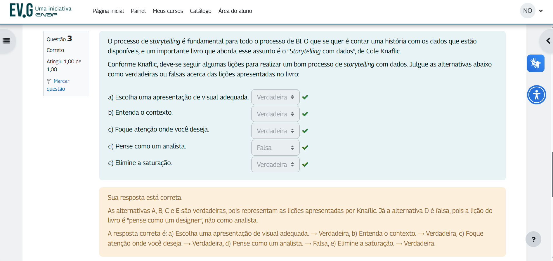 EV.G Uma iniciativa Página inicial Painel Meus cursos Catálogo Área do aluno NO Questão 3 o processo de storytelling é fundamental para todo o processo de o que se quer é contar uma história com os dados que estão Correto disponíveis, e um importante livro que aborda esse assunto é o "Storytelling com dados", de Cole Knaflic. Atingiu 1,00 de Conforme Knaflic, deve-se seguir algumas lições para realizar um bom processo de storytelling com dados. Julgue as alternativas abaixo 1,00 como verdadeiras ou falsas acerca das lições apresentadas no livro: Marcar questão a) Escolha uma apresentação de visual adequada. Verdadeira b) Entenda o contexto. Verdadeira c) Foque atenção onde você deseja. Verdadeira d) Pense como um analista. Falsa e) Elimine a saturação. Verdadeira Sua resposta está correta. As alternativas A, B, C e E são verdadeiras, pois representam as lições apresentadas por Knaflic. Já a alternativa D é falsa, pois a lição do livro é "pense como um designer", não como analista. A resposta correta é: a) Escolha uma apresentação de visual adequada. Verdadeira, b) Entenda o contexto. Verdadeira, c) Foque ? atenção onde você deseja. Verdadeira, d) Pense como um analista. Falsa, e) Elimine a saturação. Verdadeira.