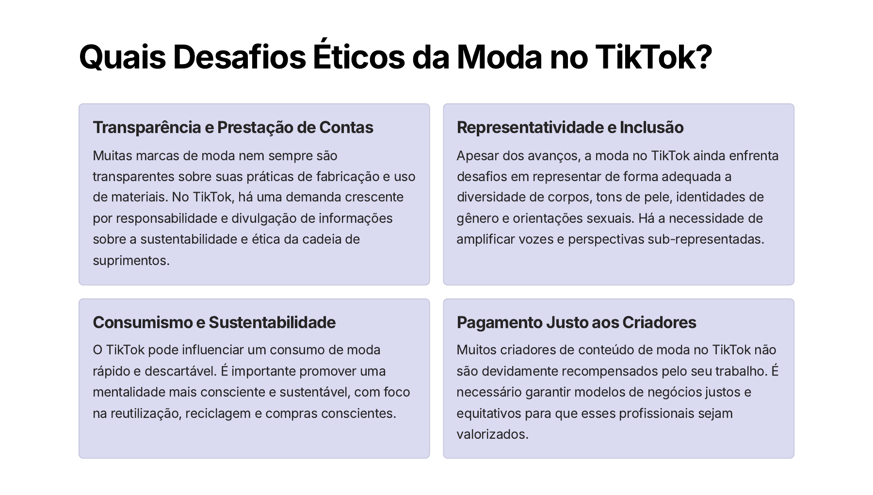 <p>Quais Desafios Éticos da Moda no TikTok?</p><p>Transparência e Prestação de Contas</p><p>Muitas marcas de moda nem sempre são</p><p>transparentes sobre suas práticas de fabricação e uso</p><p>de materiais. No TikTok, há uma demanda crescente</p><p>por responsabilidade e divulgação de informações</p><p>sobre a sustentabilidade e ética da cadeia de</p><p>suprimentos.</p><p>Representatividade e Inclusão</p><p>Apesar dos avanços, a moda no TikTok ainda enfrenta</p><p>desafios em representar de forma adequada a</p><p>diversidade de corpos, tons de pele, identidades de</p><p>gênero e orientações sexuais. Há a necessidade de</p><p>amplificar vozes e perspectivas sub-representadas.</p><p>Consumismo e Sustentabilidade</p><p>O TikTok pode influenciar um consumo de moda</p><p>rápido e descartável. É importante promover uma</p><p>mentalidade mais consciente e sustentável, com foco</p><p>na reutilização, reciclagem e compras conscientes.</p><p>Pagamento Justo aos Criadores</p><p>Muitos criadores de conteúdo de moda no TikTok não</p><p>são devidamente recompensados pelo seu trabalho. É</p><p>necessário garantir modelos de negócios justos e</p><p>equitativos para que esses profissionais sejam</p><p>valorizados.</p><p>Qual O Papel da Tecnologia na</p><p>Moda do TikTok?</p><p>A tecnologia desempenha um papel fundamental na evolução da moda no</p><p>TikTok. As ferramentas digitais permitem que os criadores de conteúdo</p><p>expressem sua criatividade de maneiras inovadoras, desde os aplicativos</p><p>de edição de vídeo que possibilitam efeitos visuais impressionantes, até as</p><p>plataformas de comércio eletrônico que facilitam a compra imediata de</p><p>looks. Além disso, a inteligência artificial e a análise de dados fornecem</p><p>insights valiosos sobre as tendências de moda emergentes, permitindo que</p><p>as marcas se antecipem às preferências dos consumidores. Essa sinergia</p><p>entre tecnologia e moda impulsiona a rápida difusão de novos estilos e o</p><p>engajamento dos usuários no TikTok.</p>