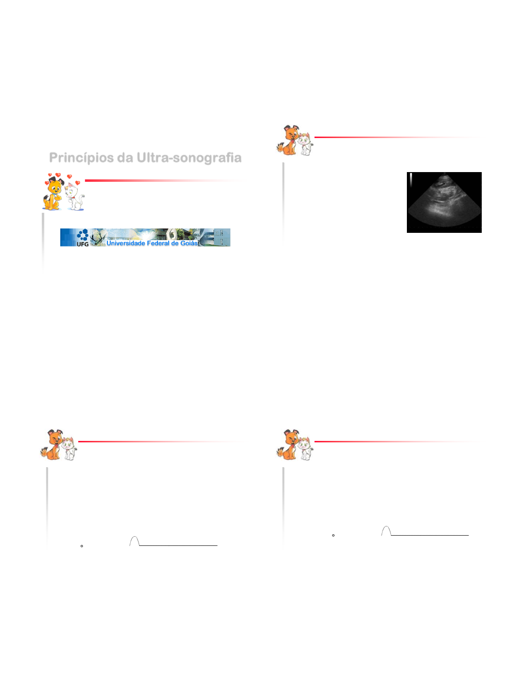 <p>09/03/2010</p><p>1</p><p>Princípios da Ultra-sonografia</p><p>Profª. Naida Cristina Borges</p><p>Conceitos Gerais</p><p> Exame altamente interativo</p><p> Interpretação</p><p> Anatomia normal x alterado</p><p> Momento do exame</p><p>Princípios Físicos</p><p> ULTRA-SOM</p><p> Ondas mecânicas com freqüência superior a 20kHz</p><p> Humanos = 20 Hz a 20kHz</p><p> Cães = 15Hz a 50 kHz</p><p> Golfinhos = 150Hz a 150kHz</p><p> Morcegos = 1 kHz a 120 kHz</p><p>Princípios Físicos</p><p> Onda</p><p> Comprimento</p><p> Freqüência</p><p> Velocidade de propagação</p><p>http://www.ufg.br/index.php</p><p>09/03/2010</p><p>2</p><p> Comprimento</p><p> Distância que a onda percorre durante um ciclo</p><p> Freqüência</p><p> Número de vezes que uma onda é repetida</p><p> Velocidade de propagação</p><p> Freqüência (ciclo/s) x Comprimento (m)</p><p>Princípios Físicos Princípios Físicos</p><p>Freqüência</p><p>Alta - Baixa</p><p>Penetração</p><p>Menor - Maior</p><p>Freqüência Alta</p><p>Melhor resolução</p><p>Comprimento de onda</p><p>Instrumentação Instrumentação</p><p>Lineares</p><p>Convexos e micro-convexos</p><p>Setoriais Endocavitários</p><p>09/03/2010</p><p>3</p><p>Formação da Imagem</p><p>Formação da Imagem</p><p>Meio 1</p><p>Meio 2</p><p>Refletido</p><p>Transmitido</p><p>(refração)</p><p>Dispersão</p><p>Incidente</p><p>Formação da Imagem Formação da Imagem</p><p>Transformados em imagem</p><p>ESCALA DE CINZA</p><p>Os ecos são analisados pelo</p><p>computador</p><p>A partir de ecos que retornam dos</p><p>tecidos ao transdutor após cada</p><p>pulso</p><p>09/03/2010</p><p>4</p><p>Formação da Imagem</p><p>Branco Ecos de </p><p>intensidade</p><p>Nuanças de cinza </p><p>Ecos média intensidade</p><p>Preto Ecos de </p><p>intensidade</p><p>Olho</p><p>humano</p><p>• 10 a 60</p><p>tons</p><p>RX</p><p>• 30 tons</p><p>US</p><p>• 32 a 128</p><p>tons</p><p>Tomo</p><p>•2000 tons</p><p>Formação da Imagem</p><p> Fatores que interferem</p><p> Impedância Acústica</p><p> Capacidade que os tecidos vivos possuem de resistir</p><p>ou impedir a transmissão do som</p><p> Intensidade dos ecos refletidos é determinada pela</p><p>diferença de impedância dos tecidos</p><p>Propriedades acústicas</p><p>Densidade</p><p>g/cm³ (p)</p><p>Velocidade</p><p>m/seg (v)</p><p>Impedância acústica</p><p>g/cm²seg (Z)</p><p>Ar 0,00129 333 0,00042</p><p>Água 1,0 1520 1,52</p><p>Sangue 1,0 1560 1,56</p><p>Gordura 0,97 1453 1,41</p><p>Músculo 1,07 1570 1,68</p><p>Fígado 1,06 1556 1,65</p><p>Pele 1,1 1954 2,15</p><p>Osso 1,85 3360 6,2</p><p>Formação da Imagem</p><p> Outros fatores que interferem</p><p> Freqüência do transdutor</p><p> Comprimento de pulso</p><p> Diâmetro do feixe</p><p> Resolução do monitor</p><p>09/03/2010</p><p>5</p><p>Interpretação da Imagem</p><p>Descrevendo a Imagem</p><p>Intensidade</p><p>X</p><p>Textura</p><p>X</p><p>Atenuação</p><p>Descrevendo a Imagem</p><p> Intensidade</p><p>• ecóicas ou hiperecóicasImagens ricas em</p><p>ecos</p><p>•hipoecóicasImagens pobres em</p><p>ecos</p><p>• anecóicas Imagens livres de</p><p>ecos</p><p>Descrevendo a Imagem</p><p> Relação de ecogenicidade</p><p>HIPERECÓICO</p><p>HIPO OU ISOECÓICO</p><p>BAÇO FÍGADO RIM</p><p>http://photobucket.com/</p><p>09/03/2010</p><p>6</p><p>Descrevendo a Imagem</p><p>Textura</p><p> Interpretação subjetiva</p><p> Tamanho, espaço e</p><p>regularidade dos pontos</p><p>Delicada ou</p><p>Grosseira</p><p>Uniforme ou</p><p>Homogênea</p><p>Não uniforme ou</p><p>Heterogênea</p><p>Descrevendo a Imagem</p><p> Atenuação</p><p> Alta ou Baixa</p><p> Responsável por artefatos</p><p> sombra acústica</p><p> reforço</p><p>Modos de Exibição dos Ecos</p><p>Modo A - Amplitude</p><p>A</p><p>m</p><p>p</p><p>li</p><p>tu</p><p>d</p><p>e</p><p>d</p><p>o</p><p>e</p><p>c</p><p>o</p><p>Distância</p><p>Pulso elétrico</p><p>Pulso ultrasônico</p><p>Interfaces refletoras</p><p>09/03/2010</p><p>7</p><p>Sistema US</p><p>Modo B</p><p>Pele</p><p>Órgãos</p><p>Monitor</p><p>Modo B - Bidimensional Modo M - Movimento</p><p>Movimento normal de mitral</p><p>Movimento anormal de mitral</p><p>Artefatos de Imagem</p><p>Artefatos de Imagem</p><p> Fenômenos de exibição que não representam</p><p>as estruturas</p><p> Afetam a qualidade e a interpretação</p><p> Conhecimento e identificação dos artefatos</p><p> Aumenta a habilidade do ultra-sonografista</p><p> Artefatos úteis</p><p>09/03/2010</p><p>8</p><p>Artefatos de Imagem</p><p> Quais são?</p><p> Reverberação</p><p> Imagem em espelho</p><p> Espessura de corte</p><p> Sombreamento simples e de contorno</p><p> Reforço</p><p> Artefato de manipulação</p><p>Reverberação</p><p> Ecos falsos e múltiplos de um único pulso</p><p>Reverberação</p><p> Características</p><p> Linhas</p><p> ecogênicas</p><p> brilhantes</p><p> paralelas</p><p> espaçadas ou não</p><p>Reverberação</p><p> Causada por refletores no caminho do som</p><p> 1º = interface pele-transdutor (reverberação externa)</p><p> 2º = interface ar-osso (reverberação interna)</p><p>09/03/2010</p><p>9</p><p>Reverberação</p><p> Tipo comum =</p><p> Ocorre</p><p> TGI</p><p> Limite diafragma</p><p> Objetos metálicos</p><p> Agulha de biopsia</p><p>“cauda de cometa”</p><p>Imagem em Espelho</p><p> Erro de interpretação quanto a localização de uma</p><p>estrutura ou órgão</p><p> Ocorre quando um refletor amplo e forte é</p><p>encontrado – pulmão ou intestino</p><p>Imagem em Espelho</p><p>Retardo no tempo de retorno do eco de uma estrutura</p><p>(FIGADO)</p><p>Existe um refletor potente atrás</p><p>(DIAFRAGMA-PULMÃO)</p><p>Os ecos do FIGADO são dispostos em posição mais</p><p>profunda em relação ao eixo do feixe</p><p>Espessura de corte</p><p> Imita a presença de sedimento</p><p> PSEUDO-SEDIMENTO</p><p> Vesículas</p><p> urinária e biliar</p><p>09/03/2010</p><p>10</p><p>Espessura de corte</p><p>Parte da largura do feixe fica fora</p><p>da estrutu