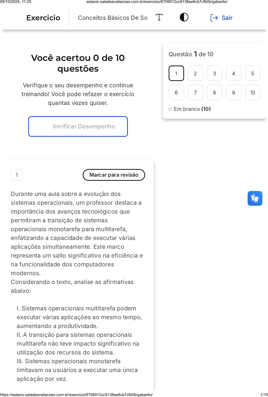 Você acertou 0 de 10 questões Verifique o seu desempenho e continue treinando! Você pode refazer o exercício quantas vezes quiser. Verificar Desempenho 1 Marcar para revisão Durante uma aula sobre a evolução dos sistemas operacionais, um professor destaca a importância dos avanços tecnológicos que permitiram a transição de sistemas operacionais monotarefa para multitarefa, enfatizando a capacidade de executar várias aplicações simultaneamente. Este marco representa um salto significativo na eficiência e na funcionalidade dos computadores modernos. Considerando o texto, analise as afirmativas abaixo: I��Sistemas operacionais multitarefa podem executar várias aplicações ao mesmo tempo, aumentando a produtividade. II��A transição para sistemas operacionais multitarefa não teve impacto significativo na utilização dos recursos do sistema. III��Sistemas operacionais monotarefa limitavam os usuários a executar uma única aplicação por vez. Questão 1 de 10 Em branco �10� 1 2 3 4 5 6 7 8 9 10 Exercicio Conceitos Básicos De So Sair 09/10/2024, 11:20 estacio.saladeavaliacoes.com.br/exercicio/6706912cc9138ee6cb7cfb0b/gabarito/ https://estacio.saladeavaliacoes.com.br/exercicio/6706912cc9138ee6cb7cfb0b/gabarito/ 1/15 A B C D E Assinale a opção que apresenta somente as afirmativas corretas. I e III estão corretas. I e II estão corretas. II e III estão corretas. Somente II está correta. Somente III está correta. Questão não respondida Opa! A alternativa correta é a letra A. Confira o gabarito comentado! Gabarito Comentado As afirmativas I e III estão corretas porque destacam, respectivamente, a principal vantagem dos sistemas operacionais multitarefa, que é a capacidade de executar múltiplas aplicações simultaneamente, e a limitação dos sistemas operacionais monotarefa, que é a capacidade de executar apenas uma aplicação por vez. A afirmativa II é incorreta porque a transição para sistemas operacionais multitarefa teve um impacto significativo na eficiência e utilização dos recursos do sistema, permitindo uma melhor gestão da memória, do processamento e das tarefas. 09/10/2024, 11:20 estacio.saladeavaliacoes.com.br/exercicio/6706912cc9138ee6cb7cfb0b/gabarito/ https://estacio.saladeavaliacoes.com.br/exercicio/6706912cc9138ee6cb7cfb0b/gabarito/ 2/15 A B C D E 2 Marcar para revisão �FAEPESUL/2019 � Adaptada) Sistemas operacionais são programas de software que gerenciam o hardware e os recursos de um computador, proporcionando uma interface para que outros programas possam acessar e utilizar esses recursos. Quando falamos de um sistema operacional multitarefas, é correto afirmar que: Permite a execução de mais de um programa ao mesmo tempo. Permite a execução de apenas um programa por vez. Limita em no máximo 5 programas em execução ao mesmo tempo. Não tem nenhuma relação com a quantidade de programas em execução ao mesmo tempo. Não existe sistema operacional multitarefas. Questão não respondida Opa! A alternativa correta é a letra A. Confira o gabarito comentado! Gabarito Comentado O conceito de um sistema operacional multitarefas é que ele permite a execução simultânea de mais de um programa. Isso é possível porque o sistema operacional 09/10/2024, 11:20 estacio.saladeavaliacoes.com.br/exercicio/6706912cc9138ee6cb7cfb0b/gabarito/ https://estacio.saladeavaliacoes.com.br/exercicio/6706912cc9138ee6cb7cfb0b/gabarito/ 3/15 A B C gerencia o acesso dos programas aos recursos do computador, alternando rapidamente entre as tarefas. Essa alternância é tão rápida que cria a impressão de que todos os programas estão sendo executados ao mesmo tempo. Portanto, a alternativa correta é a que afirma que um sistema operacional multitarefas permite a execução de mais de um programa ao mesmo tempo. 3 Marcar para revisão Sistemas operacionais multitarefa permitem que vários programas sejam executados simultaneamente. Esta capacidade melhora a eficiência e a usabilidade do computador, permitindo uma melhor gestão do tempo de processamento. Qual característica define um sistema operacional multitarefa? Gerenciar um único usuário e uma única tarefa por vez. A habilidade de executar um único programa por vez. Executar múltiplos programas usando um único processador. 09/10/2024, 11:20 estacio.saladeavaliacoes.com.br/exercicio/6706912cc9138ee6cb7cfb0b/gabarito/ https://estacio.saladeavaliacoes.com.br/exercicio/6706912cc9138ee6cb7cfb0b/gabarito/ 4/15 D E A B Permitir apenas a execução de aplicações de sistema. Requerer intervenção manual para troca entre programas. Questão não respondida Opa! A alternativa correta é a letra C. Confira o gabarito comentado! Gabarito Comentado Um sistema operacional multitarefa é capaz de gerenciar a execução simultânea de vários programas, compartilhando de forma eficaz os recursos do processador entre eles, o que maximiza a utilização do hardware e melhora a experiência do usuário. 4 Marcar para revisão Na arquitetura de sistemas operacionais, o kernel é a camada mais fundamental, oferecendo uma base sobre a qual os programas podem ser executados de maneira segura e eficiente. O que é o kernel em um sistema operacional? Um programa de aplicação que permite a edição de texto. A interface gráfica do usuário para configurações do sistema. 09/10/2024, 11:20 estacio.saladeavaliacoes.com.br/exercicio/6706912cc9138ee6cb7cfb0b/gabarito/ https://estacio.saladeavaliacoes.com.br/exercicio/6706912cc9138ee6cb7cfb0b/gabarito/ 5/15 C D E A camada fundamental que atua diretamente sobre o hardware. Um sistema de arquivos para organizar dados. O compilador responsável pela tradução de código de alto nível. Questão não respondida Opa! A alternativa correta é a letra C. Confira o gabarito comentado! Gabarito Comentado O kernel é a parte essencial de um sistema operacional, funcionando como a ponte entre os aplicativos e o processamento físico realizado pelo har