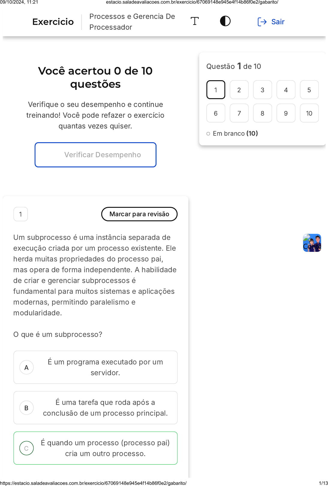 Você acertou 0 de 10 questões Verifique o seu desempenho e continue treinando! Você pode refazer o exercício quantas vezes quiser. Verificar Desempenho A B C 1 Marcar para revisão Um subprocesso é uma instância separada de execução criada por um processo existente. Ele herda muitas propriedades do processo pai, mas opera de forma independente. A habilidade de criar e gerenciar subprocessos é fundamental para muitos sistemas e aplicações modernas, permitindo paralelismo e modularidade. O que é um subprocesso? É um programa executado por um servidor. É uma tarefa que roda após a conclusão de um processo principal. É quando um processo (processo pai) cria um outro processo. Questão 1 de 10 Em branco �10� 1 2 3 4 5 6 7 8 9 10 Exercicio Processos e Gerencia De Processador Sair Conte 09/10/2024, 11:21 estacio.saladeavaliacoes.com.br/exercicio/67069148e945e4f14b86f0e2/gabarito/ https://estacio.saladeavaliacoes.com.br/exercicio/67069148e945e4f14b86f0e2/gabarito/ 1/13 D E É uma operação de baixa prioridade no sistema. É uma tarefa secundária de um thread. Questão não respondida Opa! A alternativa correta é a letra C. Confira o gabarito comentado! Gabarito Comentado Um subprocesso é quando um processo é criado gerando um vínculo hierárquico entre o processo criador (pai) e o processo criado (filho). Nesse contexto, o processo filho é considerado um subprocesso do processo pai. 2 Marcar para revisão Um analista de sistemas está investigando um problema de desempenho em um servidor que executa múltiplas instâncias de aplicativos web. Ele suspeita que o escalonamento de processos não está sendo eficiente, levando a altos tempos de espera e resposta. Considerando o texto, analise as afirmativas abaixo: I. O escalonamento de processos é irrelevante para o desempenho do sistema. II. Algoritmos de escalonamento visam distribuir o tempo de processador de forma justa entre todos os processos. III. Processos em estado de espera não consomem recursos do processador. Conte 09/10/2024, 11:21 estacio.saladeavaliacoes.com.br/exercicio/67069148e945e4f14b86f0e2/gabarito/ https://estacio.saladeavaliacoes.com.br/exercicio/67069148e945e4f14b86f0e2/gabarito/ 2/13 A B C D E Assinale a opção que apresenta somente as alternativas corretas. I, apenas. I e III, apenas. II e III, apenas. II, apenas. III, apenas. Questão não respondida Opa! A alternativa correta é a letra C. Confira o gabarito comentado! Gabarito Comentado A afirmativa I é incorreta porque o escalonamento de processos é crucial para o desempenho do sistema, especialmente em um ambiente multitarefa. A afirmativa II está correta, pois o objetivo dos algoritmos de escalonamento é justamente otimizar a distribuição do tempo de CPU entre os processos, melhorando o desempenho geral do sistema. A afirmativa III está correta, pois processos em estado de espera não consomem CPU. 3 Marcar para revisão Conte 09/10/2024, 11:21 estacio.saladeavaliacoes.com.br/exercicio/67069148e945e4f14b86f0e2/gabarito/ https://estacio.saladeavaliacoes.com.br/exercicio/67069148e945e4f14b86f0e2/gabarito/ 3/13 A B C D E Gerenciar eficientemente o tempo de CPU entre múltiplos processos é crucial para o desempenho do sistema. O escalonador de processos utiliza diferentes critérios para otimizar o uso do processador, melhorando a resposta do sistema a diversas cargas de trabalho. Qual tipo de escalonamento utiliza fatias de tempo para alternar a execução entre os processos, buscando equilibrar o uso do CPU? Prioridade. FCFS �First-Come, First-Served). SRTF �Shortest Remaining Time First). Multinível. Round Robin. Questão não respondida Opa! A alternativa correta é a letra E. Confira o gabarito comentado! Gabarito Comentado O escalonamento Round Robin é projetado para sistemas de compartilhamento de tempo, alternando a execução entre os processos em intervalos regulares ou fatias de tempo. Isso permite uma distribuição justa da CPU entre todos os processos, evitando a monopolização do processador por um único processo e reduzindo o Conte 09/10/2024, 11:21 estacio.saladeavaliacoes.com.br/exercicio/67069148e945e4f14b86f0e2/gabarito/ https://estacio.saladeavaliacoes.com.br/exercicio/67069148e945e4f14b86f0e2/gabarito/ 4/13 A B C D E tempo de espera para processos de menor demanda. 4 Marcar para revisão No desenvolvimento de software concorrente, a sincronização de processos é fundamental para evitar condições de corrida. Utilizar mecanismos adequados garante que os recursos sejam acessados de maneira segura e ordenada. Qual mecanismo é utilizado para evitar o acesso simultâneo a um recurso compartilhado? Variáveis de condição. Semáforos. Memória Compartilhada. Pipes. Filas de Mensagens. Questão não respondida Opa! A alternativa correta é a letra B. Confira o gabarito comentado! Gabarito Comentado Semáforos são mecanismos de sincronização que controlam o acesso a Conte 09/10/2024, 11:21 estacio.saladeavaliacoes.com.br/exercicio/67069148e945e4f14b86f0e2/gabarito/ https://estacio.saladeavaliacoes.com.br/exercicio/67069148e945e4f14b86f0e2/gabarito/ 5/13 A B C D E recursos compartilhados por múltiplos processos, utilizando um contador que determina quantos processos podem acessar o recurso simultaneamente, prevenindo condições de corrida. 5 Marcar para revisão Os algoritmos de escalonamento são fundamentais para o funcionamento dos sistemas operacionais modernos. Qual a principal função de um algoritmo de escalonamento? Determinar quanto tempo de UCP cada processo necessita. Evitar que processos CPU-bound monopolizem a UCP. Decidir qual dos processos prontos deve ser alocado à UCP. Assegurar que a UCP nunca fique ociosa. Distribuir a memória entre os processos. Questão não respondida Opa! A alternativa correta é a letra C. Confira o gabarito comentado! Conte 09/10/2024, 11:21 estacio.saladeavaliacoes.com.br/exercicio/67069148e945e4f14b86f0e2/gabarito/ https://estacio.saladeavaliacoes.com.br/ex