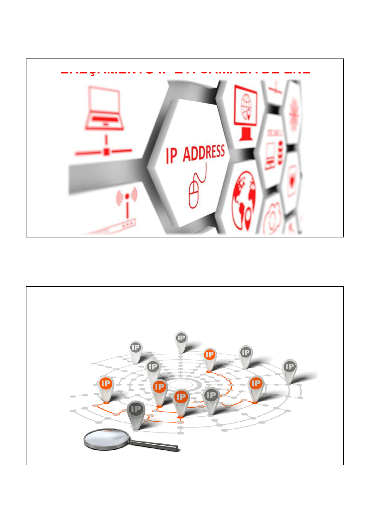 15 /10 /2024 1 ENDEREÇAMENTO IP E A CAMADA DE ENLACE Endereçamento IP e a camada de enlace são dois conceitos fundamentais em redes de computadores, embora operem em níveis diferentes do modelo OSI. 15 /10 /2024 2 Camada de Enlace: O Nível Físico da Comunicação • Função: A camada de enlace é responsável pela transmissão de dados entre dispositivos diretamente conectados em uma mesma rede. Ela se preocupa com a integridade dos dados, o controle de fluxo e o acesso ao meio físico. • Endereço físico (MAC): Cada dispositivo de rede possui um endereço físico único, conhecido como endereço MAC, gravado na sua placa de rede. Esse endereço é utilizado para identificar dispositivos na mesma rede local e é fundamental para a comunicação entre eles. • Protocolos: Exemplos de protocolos da camada de enlace incluem Ethernet, Wi-Fi e Token Ring. Endereçamento IP: A Identificação Lógica na Rede • Função: O endereço IP é um número único atribuído a cada dispositivo conectado a uma rede. Ele serve para identificar dispositivos em uma rede global e permitir o roteamento de pacotes entre diferentes redes. • Camada de rede: O endereçamento IP opera na camada de rede, um nível acima da camada de enlace. • Tipos de endereços IP: Existem diferentes classes de endereços IP (A, B, C, D e E), cada uma com um número específico de bits para identificar a rede e o host. • Roteamento: Os roteadores utilizam os endereços IP para determinar o melhor caminho para encaminhar pacotes de dados entre diferentes redes. 15 /10 /2024 3 Relação entre Endereçamento IP e Camada de Enlace • Complementaridade: Ambos os endereçamentos são essenciais para a comunicação em redes. O endereço MAC é utilizado para a comunicação local, enquanto o endereço IP permite a comunicação global. • Mapeamento: Para que um pacote de dados possa ser enviado de um dispositivo para outro, é necessário mapear o endereço IP para o endereço MAC. Essa tarefa é realizada por protocolos como ARP (Address Resolution Protocol). • Níveis diferentes: O endereço IP e o endereço MAC operam em níveis diferentes do modelo OSI. O endereço MAC é específico da camada de enlace, o endereço IP é utilizado na camada de rede. Simplificando: • Camada de enlace: Cuida da comunicação local entre dispositivos conectados à mesma rede, utilizando endereços MAC. • Endereçamento IP: Permite a comunicação global entre dispositivos em diferentes redes, utilizando endereços IP. • Complementaridade: Ambos os mecanismos são complementares e trabalham em conjunto para garantir a comunicação eficaz em redes de computadores. 15 /10 /2024 4 Exemplo prático: Imagine que você quer acessar um site na internet. Seu computador (com um endereço IP) envia um pacote de dados para o servidor do site (com outro endereço IP). O roteador da sua casa utiliza o endereço IP para determinar o melhor caminho para enviar o pacote. Ao chegar ao destino, o endereço IP é mapeado para o endereço MAC do servidor, permitindo a entrega do pacote. 15 /10 /2024 5 ENDEREÇAMENTO IP E A CAMADA DE ENLACE Endereçamento IP O endereço IP na versão 4 é formado por 32 bits, divididos em porção de host e porção de rede. A figura abaixo mostra a anatomia deste endereço. Os endereços IP são divididos em classes, conforme quadro abaixo: 15 /10 /2024 6 Características do Unicast: • A comunicação ocorre entre um único dispositivo de origem e um único dispositivo de destino. • É estabelecida uma conexão direta entre o remetente e o destinatário. • A informação é enviada de forma privada, garantindo que apenas o destinatário tenha acesso aos dados. • A comunicação é otimizada, pois os dados são enviados diretamente para o destinatário desejado, sem a necessidade de serem transmitidos para todos os dispositivos da rede. Exemplos de aplicações que utilizam Unicast • Navegação na web: Quando você digita um endereço de um site em seu navegador, seu computador envia uma solicitação unicast para o servidor daquele site. • Envio de e-mail: Ao enviar um e-mail para uma pessoa específica, a mensagem é enviada como um pacote unicast para o servidor de e-mail do destinatário. • Transferência de arquivos: Quando você baixa um arquivo de um servidor, a transferência ocorre através de uma conexão unicast. 15 /10 /2024 7 Em resumo: O unicast é o método mais comum de comunicação em redes, sendo utilizado em diversas aplicações do dia a dia. Sua principal característica é a direcionamento preciso dos dados para um único destinatário, garantindo privacidade e eficiência na transmissão. Características do Multicast: • A comunicação ocorre entre um único dispositivo de origem e um grupo de dispositivos de destino. • Os dados são enviados de forma otimizada, evitando a necessidade de enviar cópias individuais para cada destinatário. • Os dispositivos que desejam receber dados multicast se juntam a grupos específicos, identificados por endereços IP multicast. • Os roteadores da rede formam uma árvore de distribuição para encaminhar os dados multicast de forma eficiente para os membros dos grupos. 15 /10 /2024 8 Exemplos de aplicações que utilizam multicast: • Serviços de streaming como Netflix e YouTube utilizam multicast para transmitir para múltiplos espectadores simultaneamente. • Os servidores de jogos podem utilizar multicast para enviar atualizações de estado do jogo para todos os jogadores. • As empresas podem utilizar multicast para distribuir atualizações de software para um grande número de clientes. • As plataformas de videoconferência podem utilizar multicast para transmitir áudio e vídeo para todos os participantes. Em resumo: O multicast é uma técnica eficiente para transmitir dados para múltiplos destinatários em uma rede. Ele é amplamente utilizado em aplicações que exigem a distribuição simultânea de con