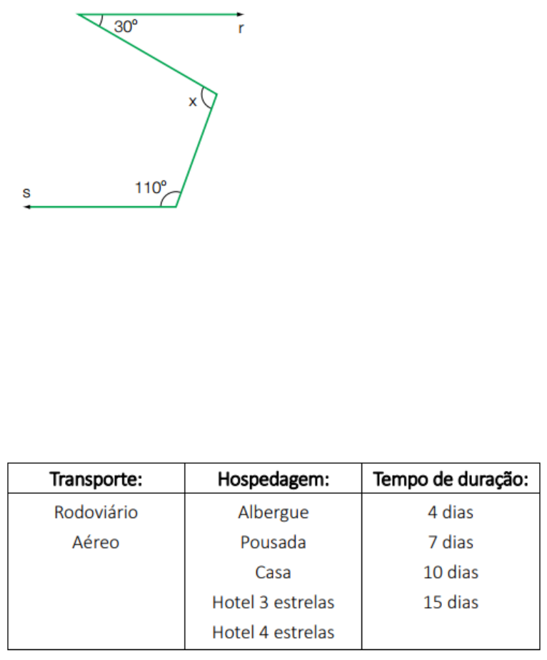 Questão 1091 Se r é paralela a s, qual é o valor de x? Matemática - Unidade 3 - Capítulo 7 - Retas coplanares - Exercícios (pg. 95 - 96) Questão 1092 Guilherme pretende comprar um pacote de viagem para uma praia da Região Nordeste do Brasil. Para isso, ao procurar uma agência de viagens, o vendedor lhe ofereceu a opção de escolher como será realizado o transporte, o tipo de hospedagem e o tempo de duração da viagem, de acordo com as seguintes opções: De quantas maneiras diferentes Guilherme pode montar seu pacote de viagem, escolhendo um tipo de transporte, um tipo de hospedagem e um tempo de duração, com base nas opções apresentadas pelo vendedor? Matemática - PNLD 2020 - 8º ano Questão 1093 O tabuleiro do jogo de xadrez tem 64 casas, 32 brancas e 32 pretas