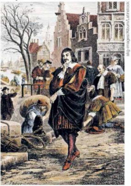 Descartes in Amsterdam (1629), de um desenho de Felix Philippoteaux. Coleção particular. A essência da ideia que uniu Fermat e Descartes na história da Matemática, quando aplicada ao plano, consiste em estabelecer uma correspondência que associe a uma reta ou curva do plano uma equação em duas variáveis que represente a figura e vice-versa. Para isso é preciso contar com um referencial no plano. Modernamente o referencial é formado por duas retas numeradas (eixos coordenados) perpendiculares e com a mesma origem. Numa carta de 1629 ao matemático francês Roberval (1602-1675), Fermat afirmou, por exemplo, que ax + by + c = 0, em que a, b, c são números reais dados, com a ? 0 ou b ? 0, é a equação de uma reta. (Lembrar que cada solução é um ponto (x0, y0) cujas coordenadas tornam verdadeira a equação.) Mas Fermat e Descartes não usavam o semieixo das ordenadas nem coordenadas negativas. A figura 1 mostra como a extremidade superior do segmento y (ordenada) levantado a partir da extremidade do segmento variável x (abscissa) representava o ponto P = (x, y). Fermat faria o mesmo só que com duas vogais maiúsculas, por exemplo (A, E). As ordenadas tinham uma inclinação constante em relação ao eixo horizontal — às vezes, de 90°. O referencial atualmente usado impôs-se com o tempo, vindo a ser adotado universalmente por volta do fim do século XVIII.