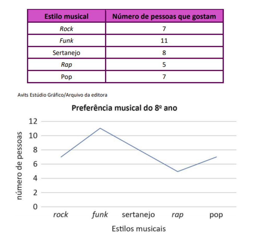 y(x - 1) Questão 1181 Um grupo de alunas do 8º ano resolveu descobrir, fazendo uma pesquisa com os alunos da sala de aula, qual é o estilo musical favorito entre rock, funk, sertanejo, rap e pop. Elas registraram os dados obtidos em um quadro e construíram um gráfico. Um aluno de outra sala observou o gráfico rapidamente e afirmou que o gosto musical da turma oscilou, ou seja, cresceu e depois diminuiu, mas voltou a crescer. As alunas responsáveis pela pesquisa ficaram intrigadas, porque não era essa informação que elas queriam mostrar. Responda: a) Quais características do gráfico apresentado levaram o aluno a interpretá-lo dessa maneira?