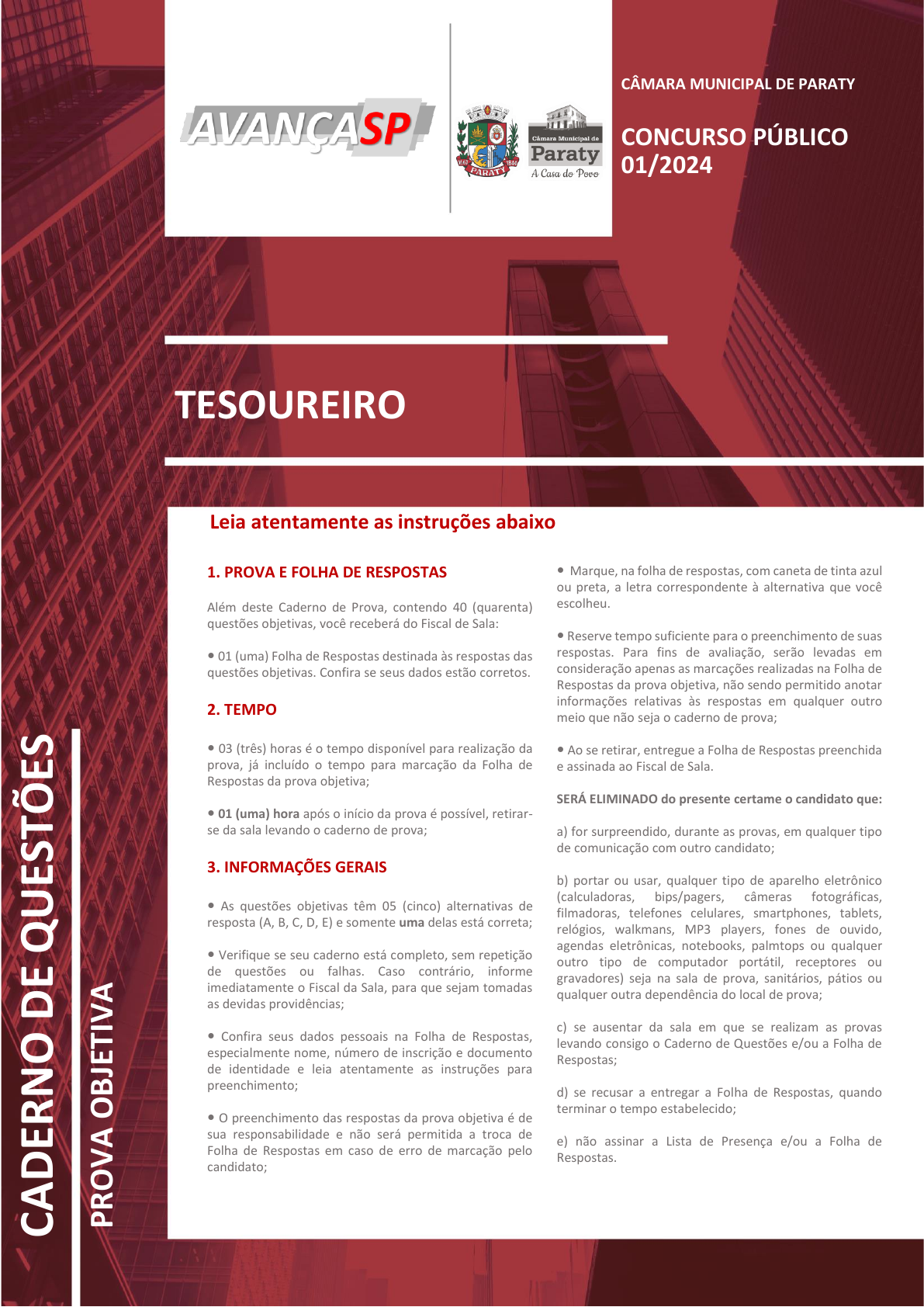 pcimarkpci MjgwNDo4MmRjOjEwYzc6MGQwMDoyM2E4OjcxNDk6MjQyOToyMDFm:VHVlLCAwOCBPY3QgMjAyNCAyMjo0Mjo1MCAtMDMwMA== www.pciconcursos.com.br TESOUREIRO Leia atentamente as instruções abaixo C A D ER N O D E Q U ES TÕ ES 1. PROVA E FOLHA DE RESPOSTAS Além deste Caderno de Prova, contendo 40 (quarenta) questões objetivas, você receberá do Fiscal de Sala: 01 (uma) Folha de Respostas destinada às respostas das questões objetivas. Confira se seus dados estão corretos. 2. TEMPO 03 (três) horas é o tempo disponível para realização da prova, já incluído o tempo para marcação da Folha de Respostas da prova objetiva; 01 (uma) hora após o início da prova é possível, retirar- se da sala levando o caderno de prova; 3. INFORMAÇÕES GERAIS As questões objetivas têm 05 (cinco) alternativas de resposta (A, B, C, D, E) e somente uma delas está correta; Verifique se seu caderno está completo, sem repetição de questões ou falhas. Caso contrário, informe imediatamente o Fiscal da Sala, para que sejam tomadas as devidas providências; Confira seus dados pessoais na Folha de Respostas, especialmente nome, número de inscrição e documento de identidade e leia atentamente as instruções para preenchimento; O preenchimento das respostas da prova objetiva é de sua responsabilidade e não será permitida a troca de Folha de Respostas em caso de erro de marcação pelo candidato; Marque, na folha de respostas, com caneta de tinta azul ou preta, a letra correspondente à alternativa que você escolheu. Reserve tempo suficiente para o preenchimento de suas respostas. Para fins de avaliação, serão levadas em consideração apenas as marcações realizadas na Folha de Respostas da prova objetiva, não sendo permitido anotar informações relativas às respostas em qualquer outro meio que não seja o caderno de prova; Ao se retirar, entregue a Folha de Respostas preenchida e assinada ao Fiscal de Sala. SERÁ ELIMINADO do presente certame o candidato que: a) for surpreendido, durante as provas, em qualquer tipo de comunicação com outro candidato; b) portar ou usar, qualquer tipo de aparelho eletrônico (calculadoras, bips/pagers, câmeras fotográficas, filmadoras, telefones celulares, smartphones, tablets, relógios, walkmans, MP3 players, fones de ouvido, agendas eletrônicas, notebooks, palmtops ou qualquer outro tipo de computador portátil, receptores ou gravadores) seja na sala de prova, sanitários, pátios ou qualquer outra dependência do local de prova; c) se ausentar da sala em que se realizam as provas levando consigo o Caderno de Questões e/ou a Folha de Respostas; d) se recusar a entregar a Folha de Respostas, quando terminar o tempo estabelecido; e) não assinar a Lista de Presença e/ou a Folha de Respostas. P R O V A O B JE TI V A CÂMARA MUNICIPAL DE PARATY CONCURSO PÚBLICO 01/2024 pcimarkpci MjgwNDo4MmRjOjEwYzc6MGQwMDoyM2E4OjcxNDk6MjQyOToyMDFm:VHVlLCAwOCBPY3QgMjAyNCAyMjo0Mjo1MCAtMDMwMA== www.pciconcursos.com.br Câmara Municipal de Paraty/RJ– Concurso Público 01/2024 INSTITUTO AVANÇA SÃO PAULO TESOUREIRO Página 2 de 12 LÍNGUA PORTUGUESA TEXTO Leia o texto para responder às questões de 1 a 7. Máscara em mosaico e outros tesouros são encontrados em tumba de rei maia O auge da civilização maia ocorreu entre 250 d.C. e 900 d.C. Apesar da grande importância histórica, existem poucos resquícios desse período devido ao saqueamento de sítios arqueológicos. Mas, recentemente, um trabalho da Universidade Tulane, nos EUA, conseguiu recuperar raros tesouros da época. Liderado pelo arqueólogo Francisco Estrada- Belli, o time de pesquisadores fez investigações no sítio de Chochkitam, localizado na Guatemala, em uma região próxima das fronteiras dos atuais países México e Belize. Em 2022, a equipe encontrou a tumba de um rei maia, datada em 1.700 anos. A descoberta foi possível graças à tecnologia LIDAR, que utilizou um avião para direcionar raios laser para o chão e, assim, fazer um mapeamento da área. “É como tirar raio-X do solo da floresta”, explica Estrada-Belli, em nota. “Isso revolucionou o nosso campo. Agora podemos ver aonde estamos indo, em vez de simplesmente fazer uma expedição na floresta esperando achar alguma coisa”, diz. A tumba contém oferendas funerárias consideradas extraordinárias. Há uma máscara de jade em mosaico, raras conchas de ostra e escritos em ossos humanos. Estima-se que as relíquias sejam de 350 d.C. A expectativa é que elas contribuam para a compreensão de elementos da cultura maia, como a religião e a linhagem real. As conchas, por exemplo, eram utilizadas pela realeza como joias e moedas, além de servirem para oferendas religiosas e de sacrifício. Os escritos em ossos humanos, por sua vez, foram feitos em pedaços de fêmur. Um deles retrata um homem que seria um rei — até então desconhecido — segurando uma máscara de jade similar à encontrada na tumba. Os pesquisadores suspeitam que os hieróglifos vistos no material possam identificar o pai e o avô do líder, conectando-o a outros estados maias, como Tikal e Teotihuacan. “Uma descoberta como essa é um pouco como ganhar na loteria, em termos de informação”, constata o arqueólogo Estrada-Belli. “Ela abre uma janela para um tempo obscuro sobre o qual temos pouquíssimos textos.” Revista Galileu. Disponível em: https://revistagalileu.globo.com/ciencia/arqueol ogia/noticia/2024/02/mascara-em-mosaico-e- outros-tesouros-sao-encontrados-em-tumba-de- rei-maia.ghtml QUESTÃO 01 De acordo com o texto, todas as afirmações a seguir são verdadeiras, exceto: (A) os artefatos do auge da cultura maia são escassos. (B) os hieróglifos gravados nos pedaços de fêmur são evidências da linhagem real. (C) as conchas encontradas na tumba tinham utilidades diversas na sociedade maia. (D) o mapeamento do local em que a tumba foi encontrada foi feito por meio de máquinas de raio-x. (E) o auge da civilização maia durou mais de meio sécul