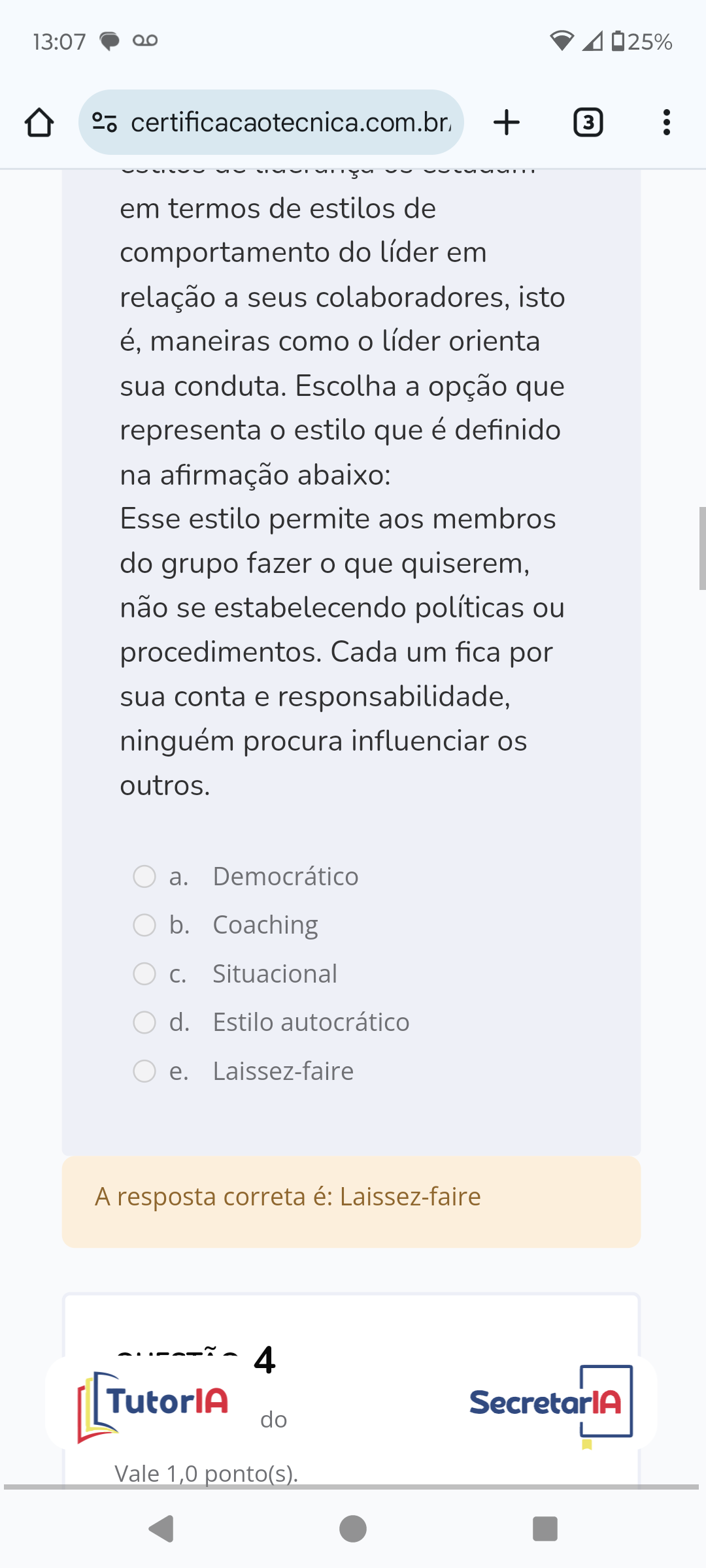 13:07 certificacaotecnica.com.b + 3 em termos de estilos de comportamento do líder em relação a seus colaboradores, isto é, maneiras como o líder orienta sua conduta. Escolha a opção que representa o estilo que é definido na afirmação abaixo: Esse estilo permite aos membros do grupo fazer o que quiserem, não se estabelecendo políticas ou procedimentos. Cada um fica por sua conta e responsabilidade, ninguém procura influenciar os outros. a. Democrático b. Coaching C. Situacional d. Estilo autocrático e. Laissez-faire A resposta correta é: Laissez-faire 4 TutorIA do Vale 1,0 ponto(s).