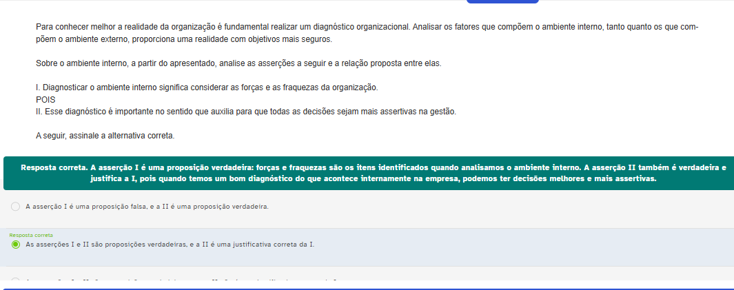 Para conhecer melhor a realidade da organização é fundamental realizar um diagnóstico organizacional. Analisar os fatores que compõem 0 ambiente interno, tanto quanto os que com- 0 ambiente proporciona uma realidade com objetivos mais seguros. Sobre 0 ambiente a partir do apresentado, analise as asserções a seguir e a relação proposta entre I. Diagnosticar 0 ambiente interno significa considerar as forças e as fraquezas da POIS II. Esse diagnóstico é importante no sentido que auxilia para que todas as decisões sejam mais assertivas na gestão. A seguir, assinale a alternativa correta. Resposta correta. A asserção uma proposição verdadeira: forças fraquezas são os itens identificados quando analisamos ambiente interno. A asserção II também é verdadeira e justifica a pois quando temos um bom diagnóstico do que acontece internamente na empresa, podemos ter decisões melhores e mais assertivas. A asserção I é uma proposição falsa, e a II é uma proposição Resposta correta As asserções I e II são proposições II é uma justificativa correta da
