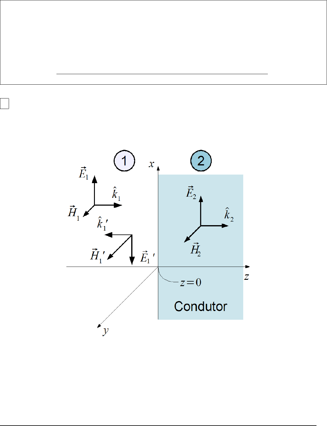 Eletromagnetismo II Prof. Dr. R.M.O Galvão - 1◦ Semestre 2015 Preparo: Diego Oliveira Gabarito - Primeira Prova Noturno 1 Uma onda plana ~E1 = E01e i(kz−ωt)êx se propagando no ar (n1 = 1) na direção z incide perpendicularmente sobre a superfície plana de um meio condutor semi-infinito como mostrado na figura. a) Escreva as componentes dos campos ~H e ~E nos meios 1© e 2© e as condições de contorno apropriadas em z = 0. 1 b) Encontre a seguinte expressão para o coeficiente de reflexão: r = E ′1x E1x = k2 − k1 k1 + k2 = α2 + β2 − (ω/c)2 + 2(ωβ/c)i (α + (ω/c))2 + β2 onde k1 e k2 são, respectivamente, os números de onda no meio 1© e 2©. Qual o significado físico da parte imaginária de r? Lembre-se: A quantidade k em condutor é um número complexo, k = α + iβ. c) Supondo que o condutor é um mau condutor, isto é σ/ε0ω � 1 e que α = ω √√√√ε0µ0 2 1 + √√√√√√1 + σ ε0ω 2 1/2 e β = ω √√√√ε0µ0 2 −1 + √√√√√√1 + σ ε0ω 2 1/2 mostre que: α ≈ ω √ µ0ε0 = k1; β ≈ σ 2 √√√√√µ0 ε0 ; R ≈ β2 4α2 + β2 e A = 1−R = 4α2 4α2 + β2 onde R é a reflectância, definida por R = |r|2 = r.r∗, e A a absorvância que determina a quantidade de energia absorvida pelo meio. d) Sabendo que β = 1/δ e α = 2π/λ definem, respectivamente, a profundi- 2 dade de atenuação e o comprimento de onda, mostre que: 1 π λ δ = σ ωε0 � 1 e a partir deste resultado que: R ≈ 0 e A ≈ 1. Com estes resultados, descreva fisicamente o problema que acaba de ser resolvido. 2 Nos metais, a condução elétrica é devida aos elétrons de condução, que não estão ligados, mas sim livres. Desta forma, as características de dispersão em metais podem ser obtidas fazendo-se ω2 0 = 0 na equação de movimento que determina a resposta dos elétrons a um campo oscilante no meio. a) Considerando uma onda plana se propagando em um metal, ~E(~r, t) = ~E0e −βk̂·~rei(αk̂·~r−ωt), onde k̂ é o versor na direção de propagação, mostre que α = ω µ0ε0 2 1− ω2 p ω2 + γ2 1/2 1 + √√√√√√√1 + γω2 p ω(ω2 − ω2 p + γ2) 2 1/2 e β = ω µ0ε0 2 1− ω2 p ω2 + γ2 1/2 −1 + √√√√√√√1 + γω2 p ω(ω2 − ω2 p + γ2) 2 1/2 3 b) Considere agora a situação sem amortecimento, isto é γ = 0. Determine a condição que a frequência ω deve satisfazer para que haja propagação no metal. c) Determine as expressões das velocidades de fase, vf , e de grupo vg, no metal, supondo que a condição do item anterior seja satisfeita. d) Esboce o diagrama de dispersão ω × k na condição em que γ = 0. e) Considere agora γ 6= 0. Determine se neste caso é possível propagação mesmo que a condição do item b) não seja satisfeita. 3 Numa região do espaço livre (sem cargas e correntes) existe um campo magnético dado por ~B(~r, t) = B0e −ax−btêz a) Determine a relação entre as constantes a e b para que este campo satis- faça as equações de Maxwell. b) Determine as expressões para o potencial escalar φ(~r, t) e vetor ~A(~r, t) associados a estes campos. c) Determine a expressão do vetor de Poynting associado a este campo. d) Verifique se o teorema de conservação de energia eletromagnética é satis- feito para este campo. 4 4 Considere um guia de ondas de seção reta retangular com lados a e b. Neste caso, a relação de dispersão tanto para modos TE como TM se propagando no guia é dado por k2 = ω2 c2 − π 2 m2 a2 + n2 b2 ; a componente do campo ~H ao longo do guia, para os modos TE, é Hz(x, y, z, t) = H0 cos (mπx a ) cos (nπy b ) ei(kz−ωt) e a componente do campo ~E ao longo do guia, para os modos TM, é Ez(x, y, z, t) = E0 sen (mπx a ) sen (nπy b ) ei(kz−ωt) a) Definindo o comprimento de onda do guia caso λg = 2π/k, mostre que λg = λ√√√√√√1− λ λc 2 ; λ = c f e determine a expressão para λc. (1,0) b) Qual os valores mínimos que podem ter os pares (m,n) para os modos TE e TM? Justifique sua resposta. c) Suponha que a = b = 2 cm e f = 15GHz Determine os valores dos pares (m,n) para todos os modos que podem se propagar no guia neste caso. d) Considerando o modo mais fundamental do item anterior calcule a velo- cidade de fase e a velocidade de grupo. 5 GABARITO Questão 1: (0,5) a) ~B = ~k ω × ~E meio 1: ~E1 = E01e i(k1z−ωt)êx; ~B1 = ~k1 ω × ~E1 = k1êz ω × ( E01e i(k1z−ωt) ) êy ∴ ~B1 = k1 ω E01e i(k1z−ωt)êy; ∴ ~H1 = k1 µ1ωE01e i(k1z−ωt)êy ~E ′1 = −E ′01e −i(k1z+ωt)êx; ∴ ~H ′1 = k1 µ1ωE ′ 01e −i(k1z+ωt)êy meio 2: ~E2 = E02e i(k2z−ωt)êx; ∴ ~H2 = k2 µ2ωE02e i(k2z−ωt)êy Condições de contorno z = 0 Et1 = Et2 ∴ E01 − E ′01 = E02 Ht1 = Ht2 ∴ k1 µ1ω (E01 + E ′01) = k2 µ2ω E02 6 (1,0) b) µ2k1 µ1k2 (E01 + E ′01) = E02 = E01 − E ′01 ∴ 1 + µ2k1 µ1k2 E ′01 = 1− µ2k1 µ1k2 E01 ∴ r = E ′01 E01 = µ1k2 − µ2k1 µ2k1 + µ1k2 ; µ1 = µ2 ⇒ r = k2 − k1 k1 + k2 (0, 5) ∴ r = α + iβ − ω/c α + iβ + ωc = (α + iβ − ω/c) (α− iβ − ω/c) (α + ω/c)2 + β2 ∴ r = α2 + β2 − (ω/c)2 + 2i(ωβ/c) (α + ω/c)2 + β2 (0, 5) Parte imaginária significa defasagem. (0,5) c) σ ωε0 � 1 ∴ α = ω √√√√µ0ε0 2 1 + √√√√√1 + σ ωε0 1/2 ≈ ω √ µ0ε0 β = ω √√√√µ0ε0 2 −1 + √√√√√1 + σ ωε0 1/2 ≈ ω √√√√µ0ε0 2 ���−1 + ��1 + 1 2 σ ωε0 1/2 ∴ β ≈ σ 2 √√√√√µ0 ε0 7 R = |r|2 ≈ � � � �ω2 c2 + σ2 4 µ0 ε0 − � � � �ω2 c2 + i ωσ c √√√√√µ0 ε0ω2 c2 + ω2 c2 + σ2 4 µ0 ε0 � � � �ω2 c2 + σ2 4 µ0 ε0 − � � � �ω2 c2 − i ωσ c √√√√√µ0 ε0ω2 c2 + ω2 c2 + σ2 4 µ0 ε0 ∴ R ≈ ( β2 + 2iβω c ) ( β2 − 2iβω c ) 4α2 + β2 ; α = ω c R ≈ β4 − � � � ��2iβ3ω c + � � � ��2iβ3ω c + 4β2ω 2 c2[ 4α2 + β2 ]2 = β2 β2 + 4α2 [ 4α2 + β2 ]2