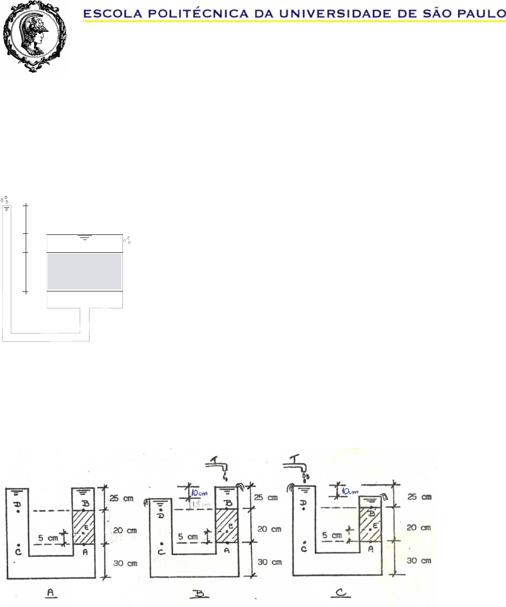 ENGENHARIA AMBIENTAL PEF 3304 – POLUIÇÃO DOS SOLOS RECORDAÇÃO DE FLUXO PERMANENTE UNIDIMENSIONAL E BIDIMENSIONAL 1) Na figura abaixo, qual a vazão que percola pelo permeâmetro? Qual a perda de carga total? Qual é o gradiente hidráulico? E a velocidade com que a água percola pelo solo? O que é gradiente crítico? Qual o gradiente crítico no caso deste problema? h Z L 2) Para as três situações apresentadas na figura a seguir, pede-se calcular para os pontos A, B, C e D indicados: - carga hidráulica - tensão total - pressão neutra - tensão efetiva Admita que existe uma tela na parte de baixo da amostra de solo que lhe dê suporte. O peso específico do solo saturado é 20 kN/m 3 . Compare a tensão efetiva obtida nos três casos no ponto E. Discuta o conceito de “força de percolação”. Qual o desnível para cada uma das experiências que levaria à condição de tensão efetiva nula? Qual o gradiente neste caso? Discuta o conceito de “gradiente hidráulico crítico”. Haveria alterações nos resultados dos exercícios anteriores em função do tipo de material, por exemplo, areia ou argila? ENGENHARIA AMBIENTAL PEF 3304 – POLUIÇÃO DOS SOLOS 3) No permeâmetro representado na figura abaixo, as areias A e C têm coeficiente de permeabilidade igual a 10-2 cm/s, e a areia B, 4x10-2 cm/s (kB = 4kA = 4kC = 4x10-2 cm/s). Pede-se calcular: a) A vazão que percola pelo permeâmetro. b) A pressão neutra na interface entre as areias A e B. c) O gradiente crítico. A seção transversal do permeâmetro é quadrada e as medidas na figura estão em centímetros. 10 10 12 8 10 10 15 A B C 4) Para a rede de fluxo abaixo, o nível de água de jusante é de 4,2m, o nível de água de montante é de 1,0m e o coeficiente de permeabilidade do solo é 5X10-5 m/s. Pede-se: a) Mostrar as condições de contorno. b) Calcular a vazão que passa sob a barragem. ENGENHARIA AMBIENTAL PEF 3304 – POLUIÇÃO DOS SOLOS 5) Dada a rede de fluxo abaixo, pede-se: a) Mostrar as condições de contorno. b) Calcular a vazão que passa sob a barragem, sabendo que o coeficiente de permeabilidade do solo é de 3X10-4 cm/s. c) Calcular a pressão neutra nos pontos A e B. d) Calcular o gradiente hidráulico nos pontos C e D. 6m 9 17m A C B D