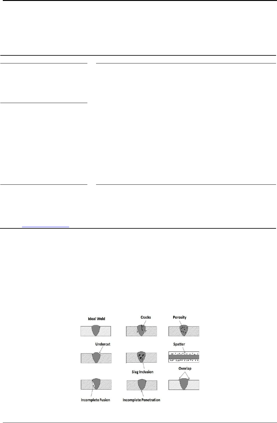 Teknomekanik Vol.2, No.2, December 2019, pp. 39~47 E-ISSN: 2621-8720 P-ISSN: 2621-9980 39 Journal homepage: http://teknomekanik.ppj.unp.ac.id DOI: https://doi.org/10.24036/tm.v2i2.2372 Welding defects, Causes and their Remedies: A Review Saadat Ali Rizvia1 and Wajahat Alib2 1Faculty member in UP, Jamia Millia Islamia, New Delhi, India 2Mechanical Engineering Department, SCRIET (CCS University), Meerut, India Article Info ABSTRACT Article history: Received July 02th, 2019 Revised Aug 12th, 2019 Accepted November 22th, 2019 This review paper looks at the causes of welding defects and their remedies which occur during the welding process. Welding industries in developing countries bearing poor quality and productivity due to the involvement of a number of the process parameter. Even in a completely controlled process, defects in the welding are observed and hence welding process is also known as the process of uncertainty which challenges explanation about the cause of welding defects. In order to identify the welding defect and problem-related to welding, the study is aimed at the research work. This will be beneficial in enhancing the yield of welding. Beside this, standardization (optimization) of process parameter for the entire cycle of manufacturing of the critical part is intended in the proposed work .This review paper also provides the accurate guideline to the quality control department to find welding defects and will help them to analyze defects which are not desired. In this review paper, an attempt has been made to categorise the various welding defects and their root causes of happening. Keywords: Welding welding defects Parent metal (PM) causes and remedies for welding defects. Corresponding Author: Saadat Ali Rizvia Faculty member in UP, Jamia Millia Islamia New Delhi, India Email: sarizvi1@jmi.ac.in 1. INTRODUCTION Welding is a process of joining of two or more parts are coalesced at their contacting surfaces by application of heat and/or pressure. Welding is most commonly related to metal parts, but the process is also used for joining of plastics [1]. During the welding process, a lot number of defects occurred. What is Welding Defects? Welding Defects can be referred to as the irregularities formed in the given weld metal due to wrong welding process parameters or incorrect welding patterns, etc. The defect may differ from the desired weld bead shape, size, and intended quality [1]. Welding defects may produce either outside or inside of the weldment. Some of the defects may be allowed if the defects are under permissible limits but other defects such as cracks, porosity, improper penetration etc are never accepted [2]. Figure 1 : Various welding defects http://teknomekanik.ppj.unp.ac.id/ https://doi.org/10.24036/tm.v2i2.2372 mailto:sarizvi1@jmi.ac.in 40 Vol.2, No.2, December 2019, pp. 39~47 Journal homepage: http://teknomekanik.ppj.unp.ac.id DOI: https://doi.org/10.24036/tm.v2i2.2372 Welding defects can be classified into two categories such as external and internal defects: a. External Welding Defects: 1) Weld Crack 2) Undercut 3) Spatter 4) Porosity 5) Overlap 6) Crater b. Internal Welding Defects: 1) Slag Inclusion 2) Incomplete Fusion 3) Necklace cracking 4) Incompletely filled groove or incomplete penetration 2.0 External Welding Defects The various types of external defects with their causes and remedies are listed below: 2.1. Weld Crack This is the most unwanted defect of all the other welding defects. Welding cracks can be present at the surface, inside of the weldment or at the heat affected zones (HAZ). Fig.2 Crack in welding Cracks are two types’ i.e. hot crack and cold crack [3]. Hot Crack – It is more prominent during crystallization of weld joints where the temperature can raise more than 10,000 oC. Cold Crack – The cracks produce at the end of the welding process is known as cold cracks. They also are known as hydrogen induced cold crack (HICC). They generally produced at HAZ. Sometimes cold crack is visible several hours after welding or even after a few days. 2.1.1 Causes of Weld Crack: 1. Poor ductility of the parent metal (PM). 2. The rigidity of the joint which makes it difficult to expand or contract the metals. 3. High sulfur content and carbon also responsible for cold cracks. 4. Residual stress caused by the solidification shrinkage. 5. Contamination of parent metal (PM). 6. High welding speed but low current. 7. No, preheat before starting welding. 8. Poor joint design. 2.1.2 Remedies for Weld crack: http://teknomekanik.ppj.unp.ac.id/ https://doi.org/10.24036/tm.v2i2.2372 Vol.2, No.2, December 2019, pp. 39~47 41 Journal homepage: http://teknomekanik.ppj.unp.ac.id DOI: https://doi.org/10.24036/tm.v2i2.2372 1. Preheating of the base metal (BM) weld and reducing the cooling speed joint helps in reducing crack. 2. Reduce the gap between the weld joints by using reasonable weld joints. 3. While welding releases the clamping force slowly which increases fill to capacity of welding material. 2.2. Undercut When the base of metal melts away from the weld zone, then a groove is formed in the shape of a notch, then this type of defect is known as Undercut. It reduces the fatigue strength of the joint [4]. Fig.3 Undercut in welding 2.2.1 Causes of Undercut: 1. If the arc voltage is very high then this defect may occur. 2. If the wrong electrode is used or if the angle of the electrode is wrong, then also the defect may form. 3. Using a large electrode is also not advisable. 4. High electrode speed is also one of the reasons for this defect. 5. Too fast weld speed. 6. Incorrect usage of gas shielding. 7. Poor weld technique. 2.2.2 Remedies for Undercut: 1. Reduce the arc length or lower the arc voltage. 2. Keep the electrode angle from 30 to 45 degree with the standing leg. 3. The diameter of the electrode should be small. 4. Reduce the travel speed of the electrode. 5. Choose the correct shielding gas with the correct composition. 6. Use multi-pass t