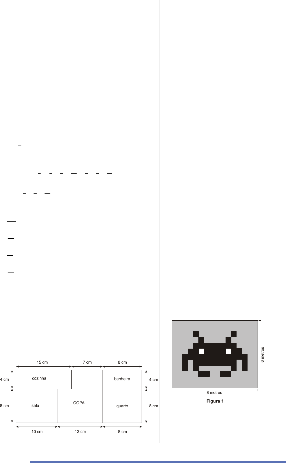 9 M0661 - (Fer) Um turista, ao alugar um carro nos Estados Unidos, consumiu, em uma semana, 3 tanques de gasolina, a um custo total de 99 dólares. Considere que um dólar, durante a semana da viagem, valia R$3,60 e que a capacidade do tanque é de 55 litros. Durante essa semana, o valor, em reais, de 1 litro de gasolina era de: a) 2,00 b) 2,04 c) 2,08 d) 2,12 e) 2,16 M0662 - (Fer) Uma fração unitária é uma fração da forma # & onde n é um número natural. Uma fração escrita como soma de frações unitárias é denominada fração egípcia. Por exemplo: ' ( = # ' + # + e , ## = # ( + # - + # -- . A soma # , + # . + # (/ é a representação egípcia de qual fração? a) $( #'/ b) #- +/ c) (# +/ d) #- $/ e) #0 (/ M0306 - (Uemg) A planta de uma residência, apresentada no desenho, a seguir, tem escala 1:80, ou seja, cada medida de 1 cm corresponde a uma medida de 80 cm na dimensão real. Considerando informações e ilustração, acima, só é CORRETO afirmar que a área real da parte ocupada pela copa é igual a a) 75,01 m2. b) 79,36 m2. c) 86,12 m2. d) 90,4 m2. M0307 - (Enem) O condomínio de um edifício permite que cada proprietário de apartamento construa um armário em sua vaga de garagem. O projeto da garagem, na escala 1:100, foi disponibilizado aos interessados já com as especificações das dimensões do armário, que deveria ter o formato de um paralelepípedo retângulo reto, com dimensões, no projeto, iguais a 3cm, 1cm e 2cm. O volume real do armário, em centímetros cúbicos, será a) 6 b) 600 c) 6.000 d) 60.000 e) 6.000.000 M0308 - (Enem) A Figura 1 representa uma gravura retangular com 8m de comprimento e 6m de altura. Deseja-se reproduzi-la numa folha de papel retangular com 42cm de comprimento e 30cm de altura, deixando livres 3cm em cada margem, conforme a Figura 2.