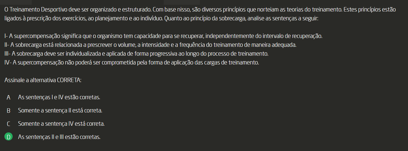 0 Treinamento Desportivo deve ser organizado e estruturado. Com base nisso, são diversos princípios que norteiam as teorias do treinamento. Estes princípios estão ligados à prescrição dos exercícios, ao planejamento e ao indivíduo. Quanto ao princípio da sobrecarga, analise as sentenças a seguir: A supercompensação significa que 0 organismo tem capacidade para se recuperar, independentemente do intervalo de recuperação. II- A sobrecarga está relacionada a prescrever volume, a intensidade e a frequência do treinamento de maneira III- A sobrecarga deve ser individualizada e aplicada de forma progressiva ao longo do processo de treinamento. A supercompensação não poderá ser comprometida pela forma de aplicação das cargas de treinamento. Assinale a alternativa CORRETA: A As sentenças e IV estão corretas. B Somente a sentença II está correta. Somente a sentença IV está correta. D As sentenças II e III estão corretas.