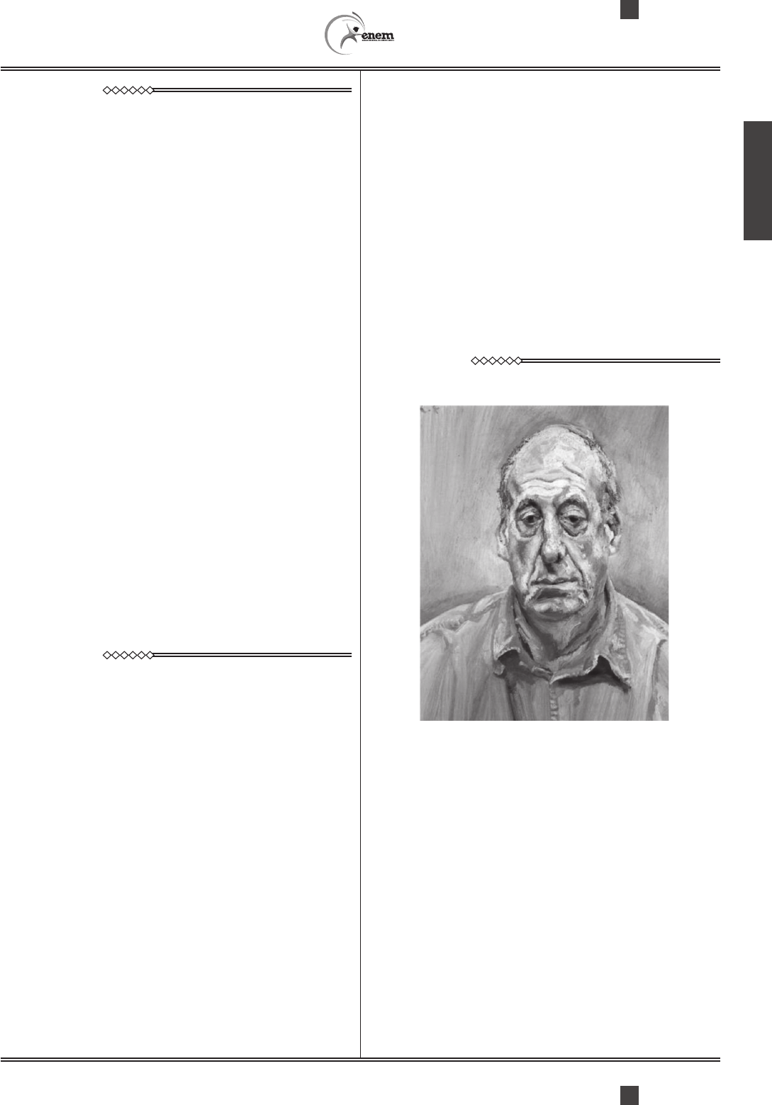 2015 LC - 2º dia | Caderno 7 - AZUL - Página 17 *AZUL25DOM17* QUESTÃO 129 Aquarela O corpo no cavalete é um pássaro que agoniza exausto do próprio grito. As vísceras vasculhadas principiam a contagem regressiva. No assoalho o sangue se decompõe em matizes que a brisa beija e balança: o verde – de nossas matas o amarelo – de nosso ouro o azul – de nosso céu o branco o negro o negro CACASO. In: HOLLANDA, H. B (Org.). 26 poetas hoje. Rio de Janeiro: Aeroplano, 2007. Situado na vigência do Regime Militar que governou o Brasil, na década de 1970, o poema de Cacaso edifica uma forma de resistência e protesto a esse período, metaforizando A as artes plásticas, deturpadas pela repressão e censura. B a natureza brasileira, agonizante como um pássaro enjaulado. C o nacionalismo romântico, silenciado pela perplexidade com a Ditadura. D o emblema nacional, transfigurado pelas marcas do medo e da violência. E as riquezas da terra, espoliadas durante o aparelhamento do poder armado. QUESTÃO 130 Tudo era harmonioso, sólido, verdadeiro. No princípio. As mulheres, principalmente as mortas do álbum, eram maravilhosas. Os homens, mais maravilhosos ainda, ah, difícil encontrar família mais perfeita. A nossa família, dizia a bela voz de contralto da minha avó. Na nossa família, frisava, lançando em redor olhares complacentes, lamentando os que não faziam parte do nosso clã. [...] Quando Margarida resolveu contar os podres todos que sabia naquela noite negra da rebelião, fiquei furiosa. [...] É mentira, é mentira!, gritei tapando os ouvidos. Mas Margarida seguia em frente: tio Maximiliano se casou com a inglesa de cachos só por causa do dinheiro, não passava de um pilantra, a loirinha feiosa era riquíssima. Tia Consuelo? Ora, tia Consuelo chorava porque sentia falta de homem, ela queria homem e não Deus, ou o convento ou o sanatório. O dote era tão bom que o convento abriu-lhe as portas com loucura e tudo. “E tem mais coisas ainda, minha queridinha”, anunciou Margarida fazendo um agrado no meu queixo. Reagi com violência: uma agregada, uma cria e, ainda por cima, mestiça. Como ousava desmoralizar meus heróis? TELLES, L. F. A estrutura da bolha de sabão. Rio de Janeiro: Rocco, 1999. Representante da ficção contemporânea, a prosa de Lygia Fagundes Telles configura e desconstrói modelos sociais. No trecho, a percepção do núcleo familiar descortina um(a) A convivência frágil ligando pessoas financeiramente dependentes. B tensa hierarquia familiar equilibrada graças à presença da matriarca. C pacto de atitudes e valores mantidos à custa de ocultações e hipocrisias. D tradicional conflito de gerações protagonizado pela narradora e seus tios. E velada discriminação racial refletida na procura de casamentos com europeus. QUESTÃO 131 TExTO I FREUD, L. Francis Wyndham. Óleo sobre tela, 64 x 52 cm. Coleção pessoal, 1993. TExTO II Lucian Freud é, como ele próprio gosta de relembrar às pessoas, um biólogo. Mais propriamente, tem querido registrar verdades muito específicas sobre como é tomar posse deste determinado corpo nesta situação particular, neste específico espaço de tempo. SMEE, S. Freud. Köln: Taschen, 2010. Considerando a intencionalidade do artista, mencionada no Texto II, e a ruptura da arte no século XX com o parâmetro acadêmico, a obra apresentada trata do(a) A exaltação da figura masculina. B descrição precisa e idealizada da forma. C arranjo simétrico e proporcional dos elementos. D representação do padrão do belo contemporâneo. E fidelidade à forma realista isenta do ideal de perfeição.